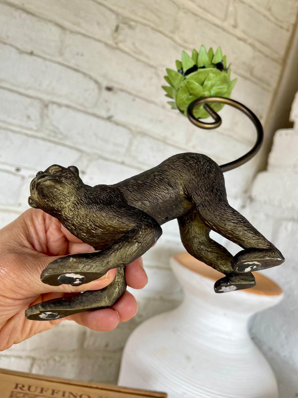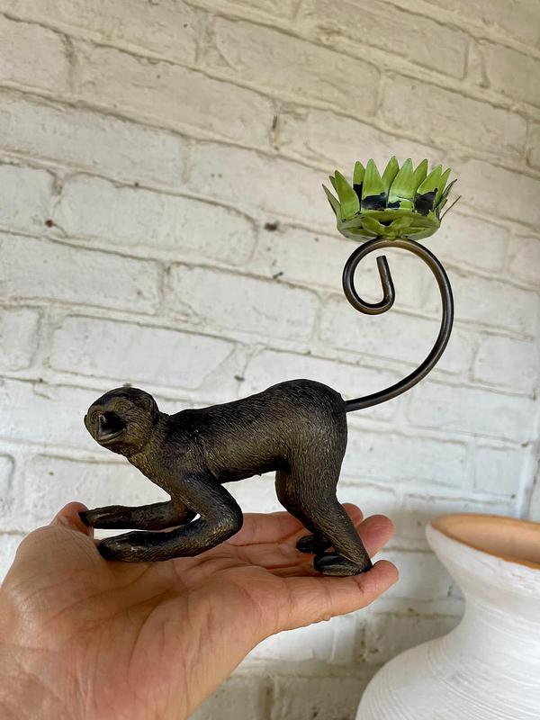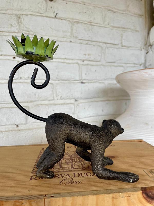 Mono fundido en resina fuerte con apariencia metálica. La cola es de metal y sostiene el porta vela.