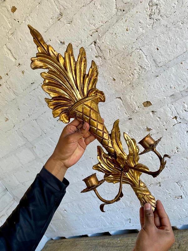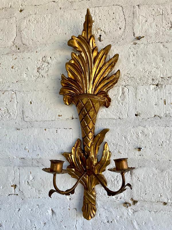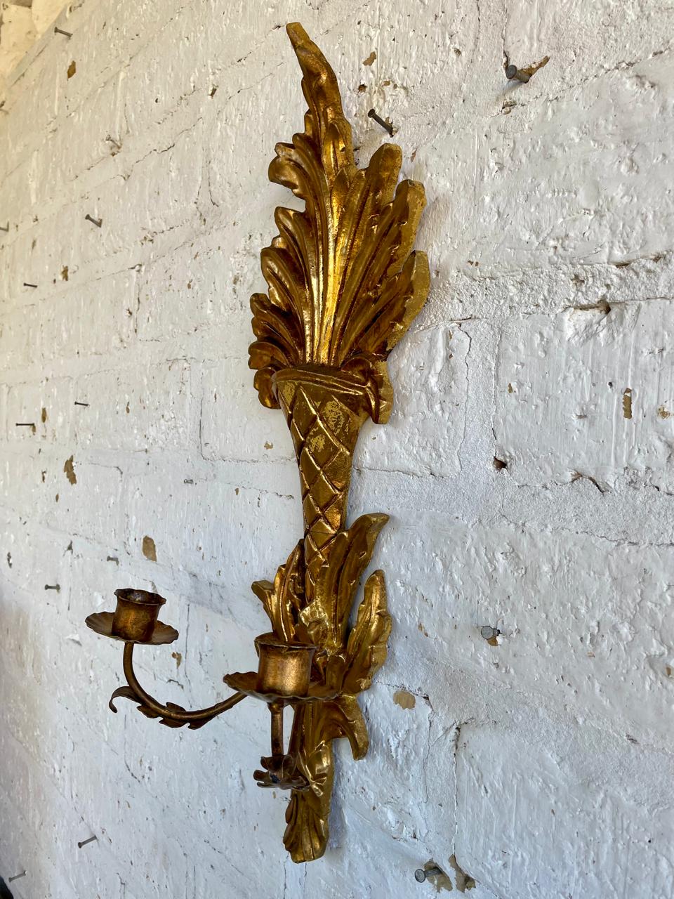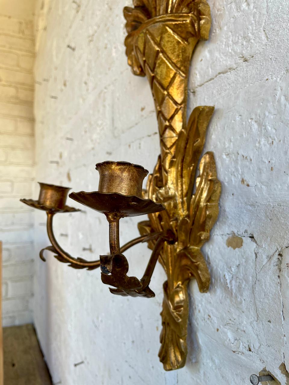 Candelabro de dos velas para colgar en la pared, elaborado en Italia en los años sesenta, la madera tallada y dorada se complementa con dos soportes para velas elaborados en lámina metálica gruesa. Se encuentra en buen estado