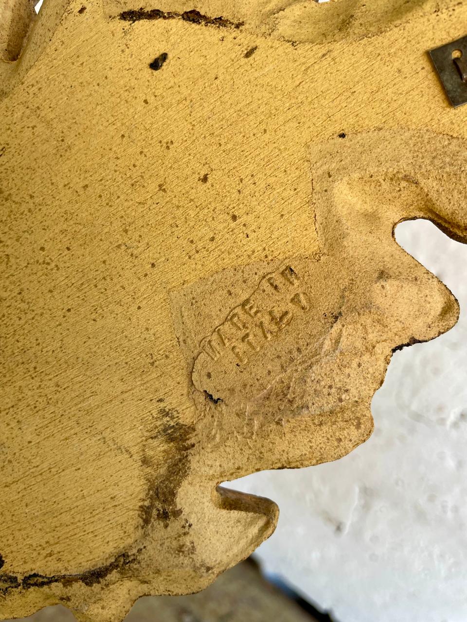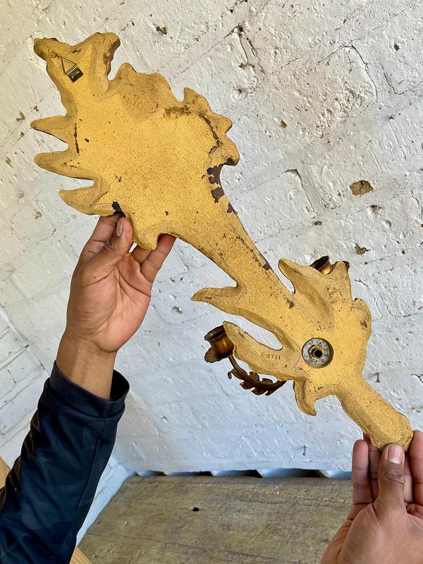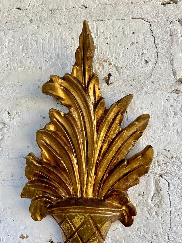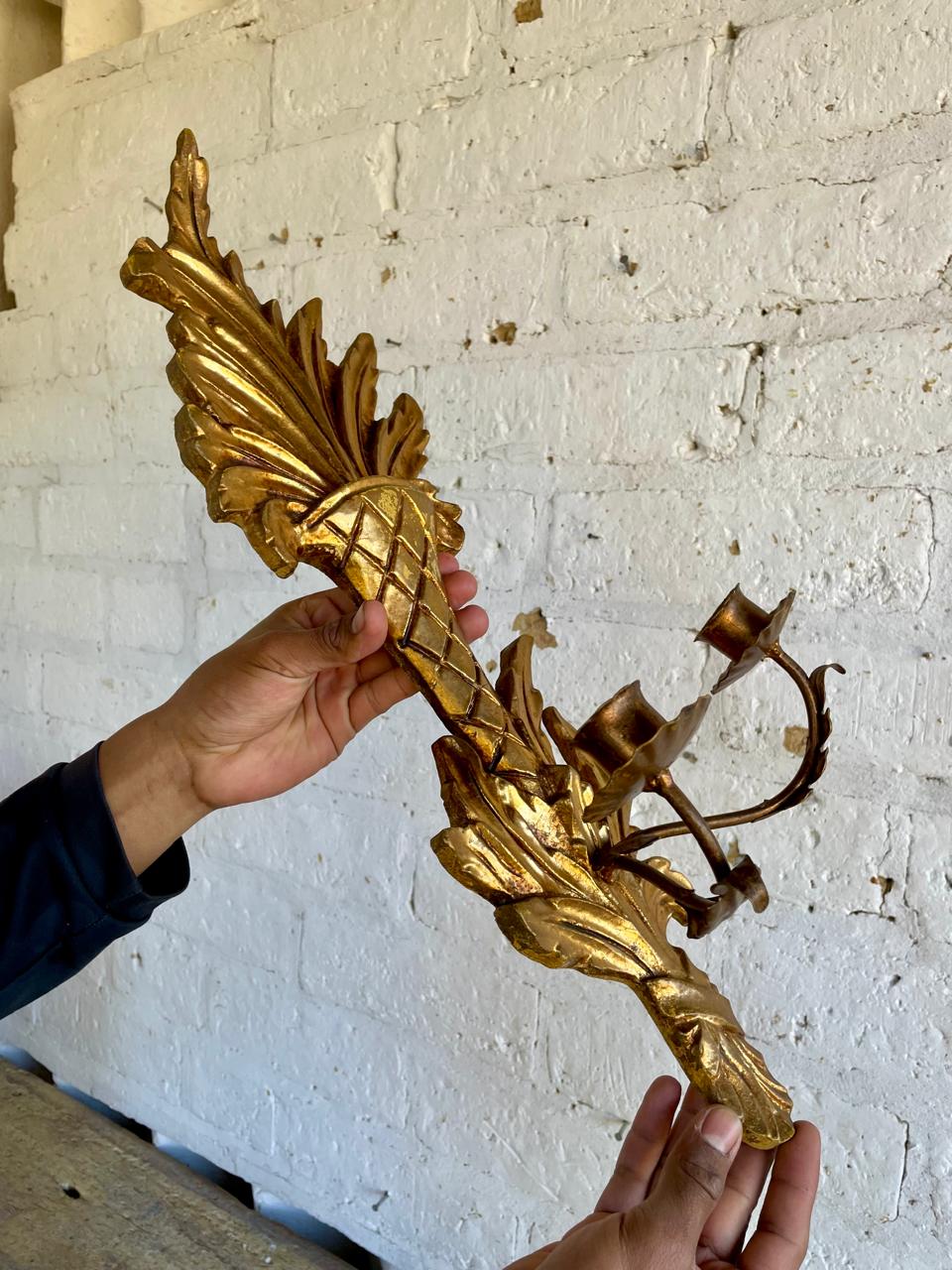 Candelabro de dos velas para colgar en la pared, elaborado en Italia en los años sesenta, la madera tallada y dorada se complementa con dos soportes para velas elaborados en lámina metálica gruesa. Se encuentra en buen estado