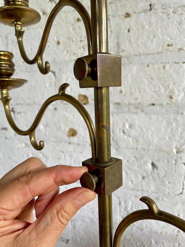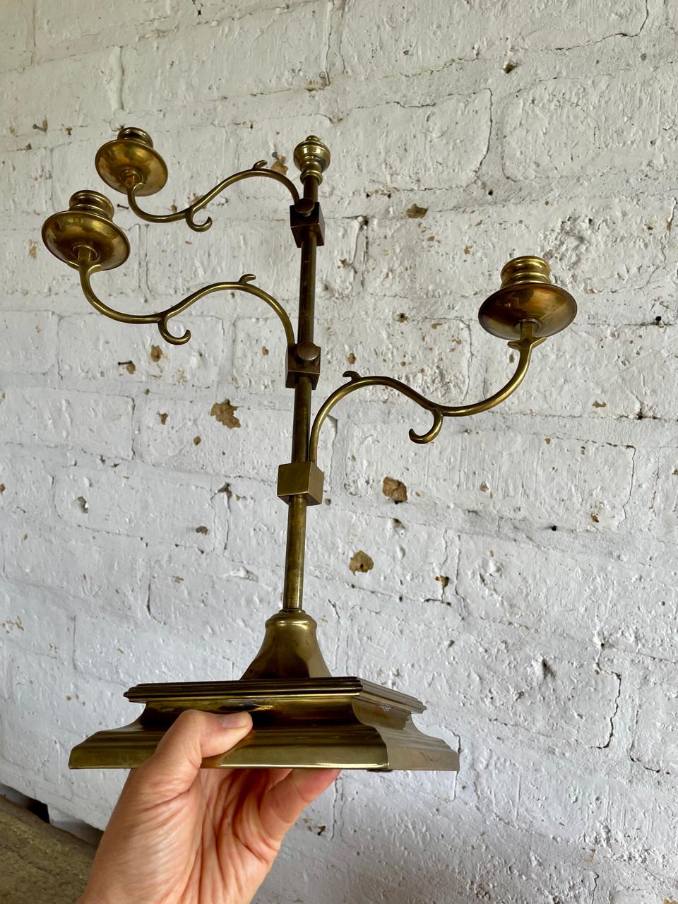 Candelabro de bronce fundido fabricado en India a mediados del S XX. Con tres brazos ajustables que se extienden desde una columna central, lo que permite girarlos alrededor de la columna y graduar su altura mediante tornillos. Cuenta con una base pesada y estable, decoradada con una moldura del mismo material. Puede usarse como pieza decorativa de escritorio o mesa. Se encuentra en buen estado. MEDIDAS: Alto 56 cm. Distancia entre 2 brazos 40 cm. Base 17 x 17 cm. Diámetro soporte de vela 3 cm.