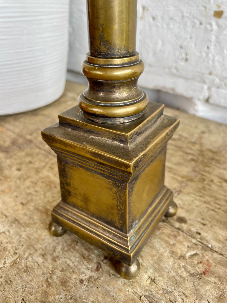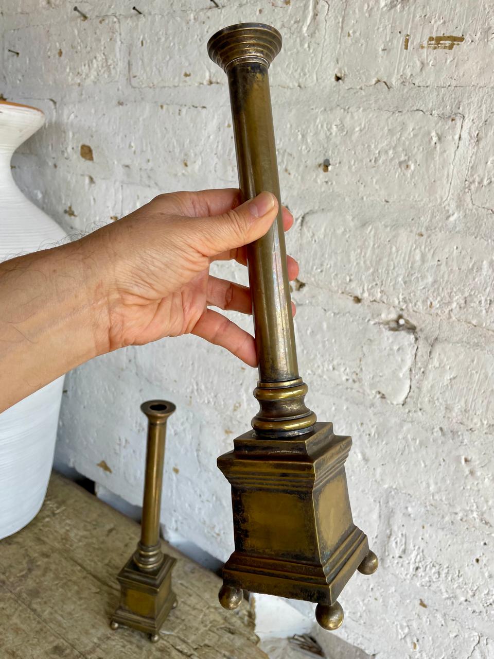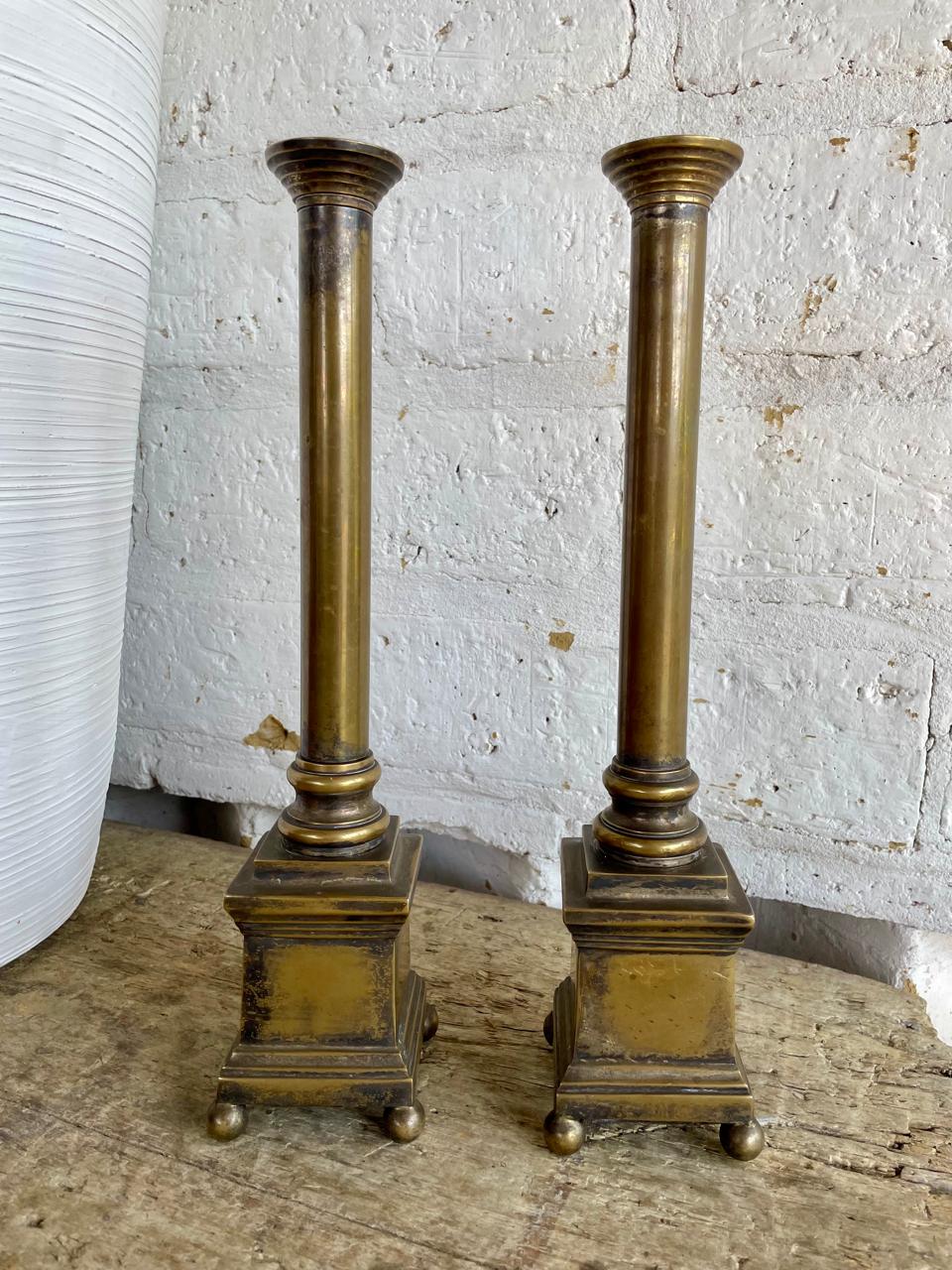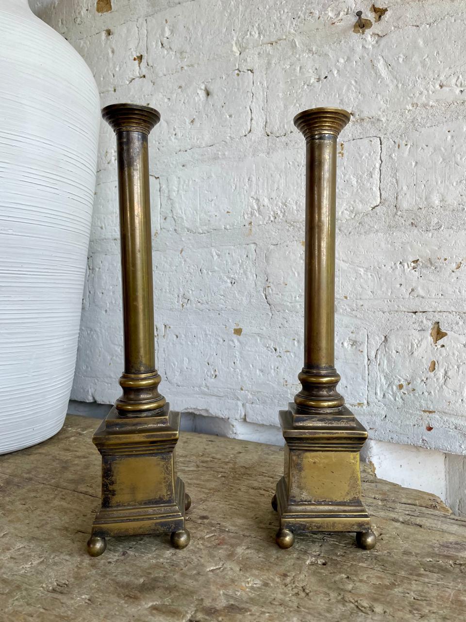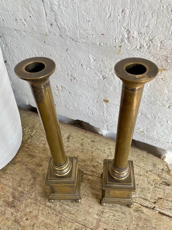 Pareja de candelabros franceses del S XIX elaborados en bronce, formados por dos columnas dóricas de diseño clásico con un fuste alto y una base cuadrada con patas esféricas. Pertenecieron al altar de una antigua iglesia católica. Se encuentran en buen estado.