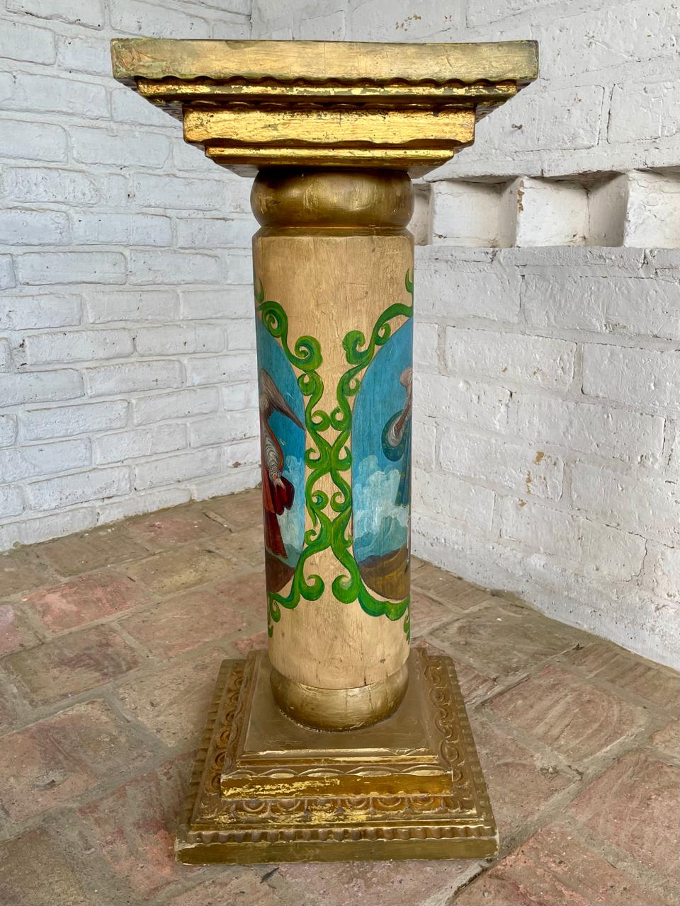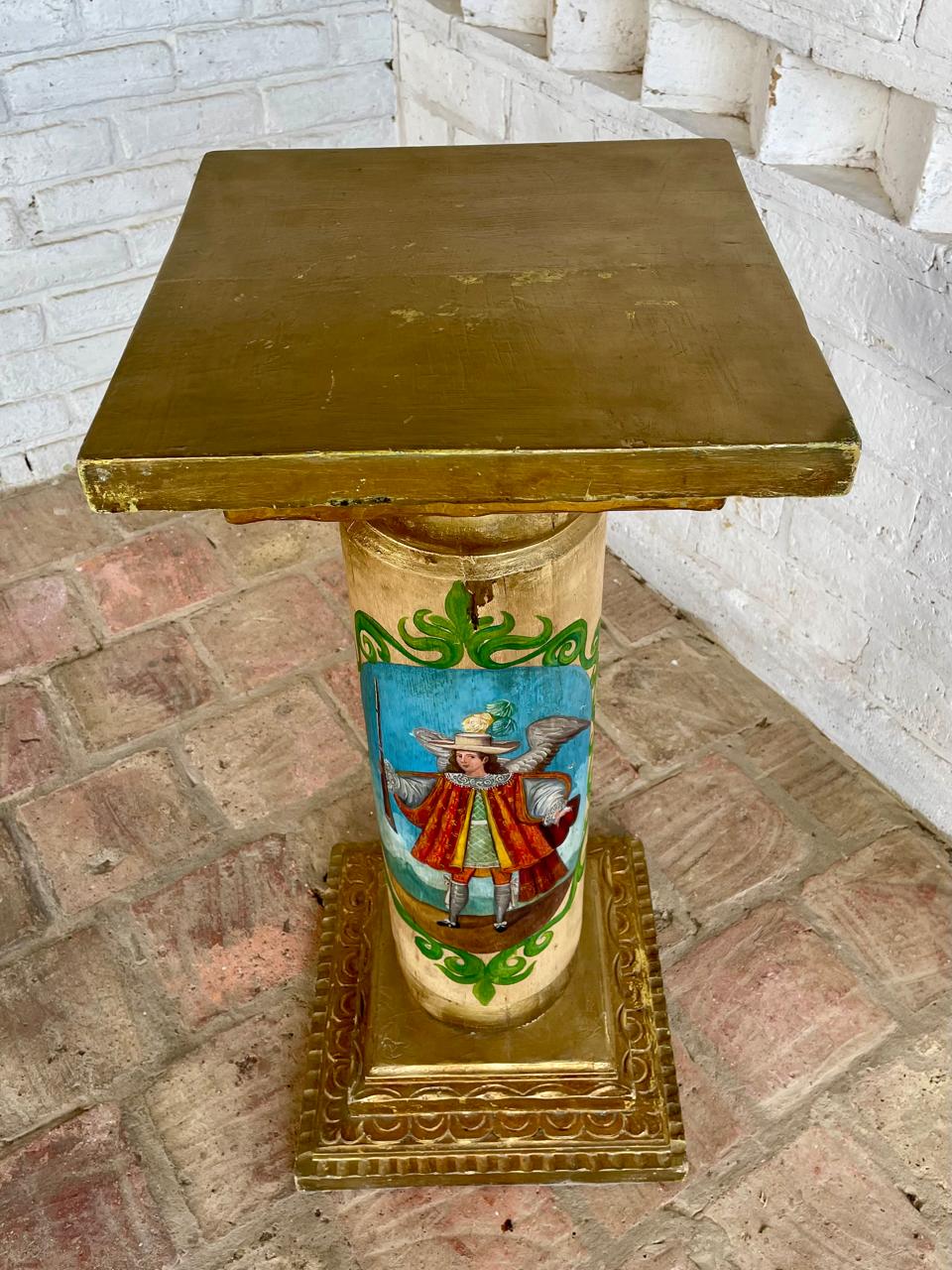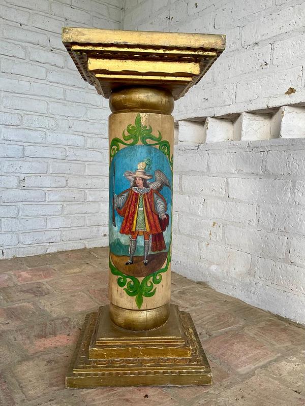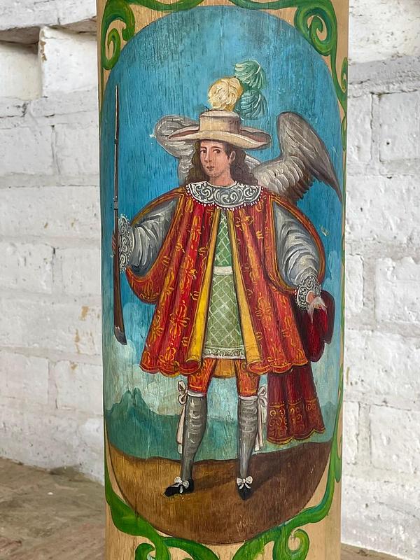 Columna colonial de madera maciza con base y capitel cuadrados con moldura dorada, la sección central cilindirca está decorada con la pintura de dos ángeles arcabuceros, un tema icónico del arte barroco andino que reemplaza la espada tradicional de los ángeles, por un arcabuz, antigua arma de fuego del S XV, iconografía desarrollada durante el periodo colonial español en America del Sur. Los ángeles lleva un atuendo militar de gala español, con una casaca (chaqueta), gregüescos (calzones) y medias, además de un sombrero chambergo adornado con plumas. La madera es pesada y se encuentra en buen estado libre de termitas.