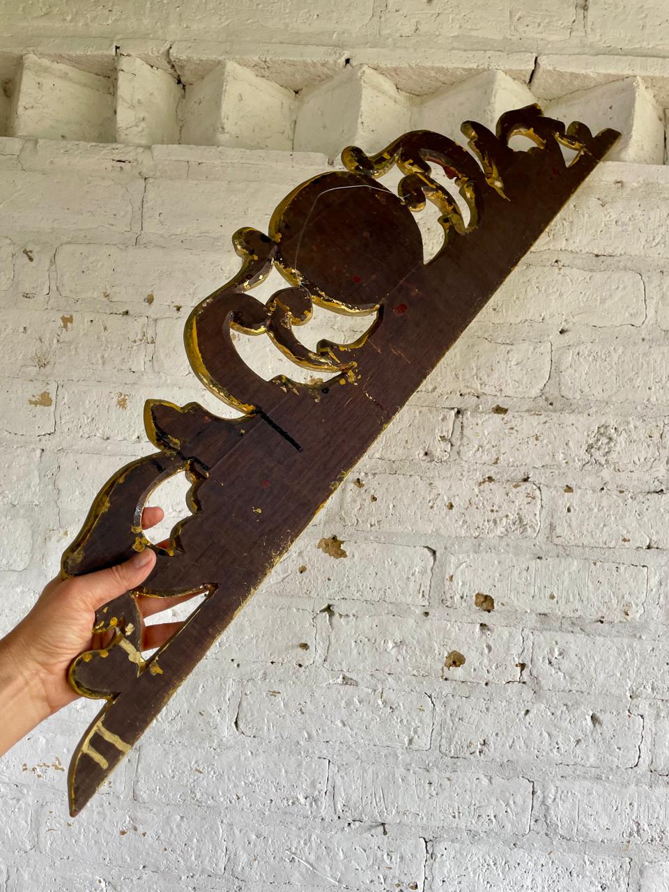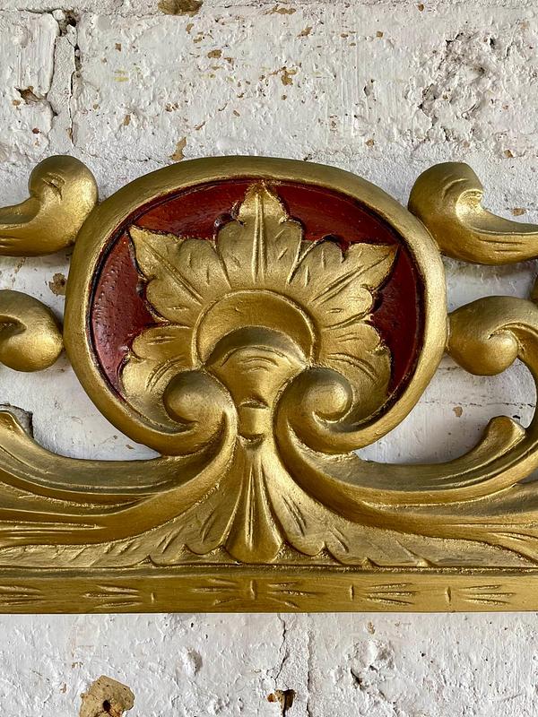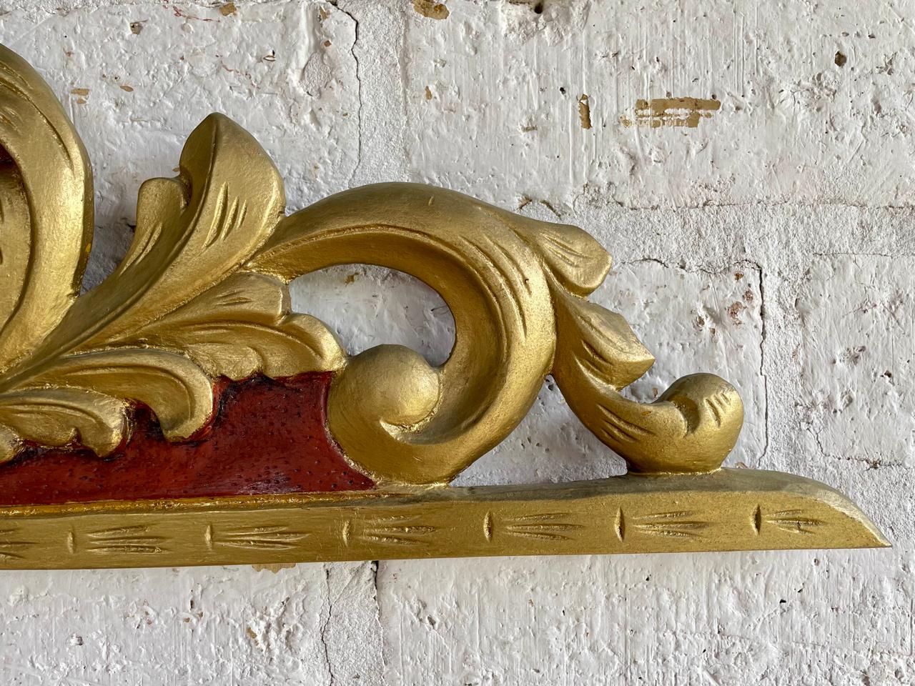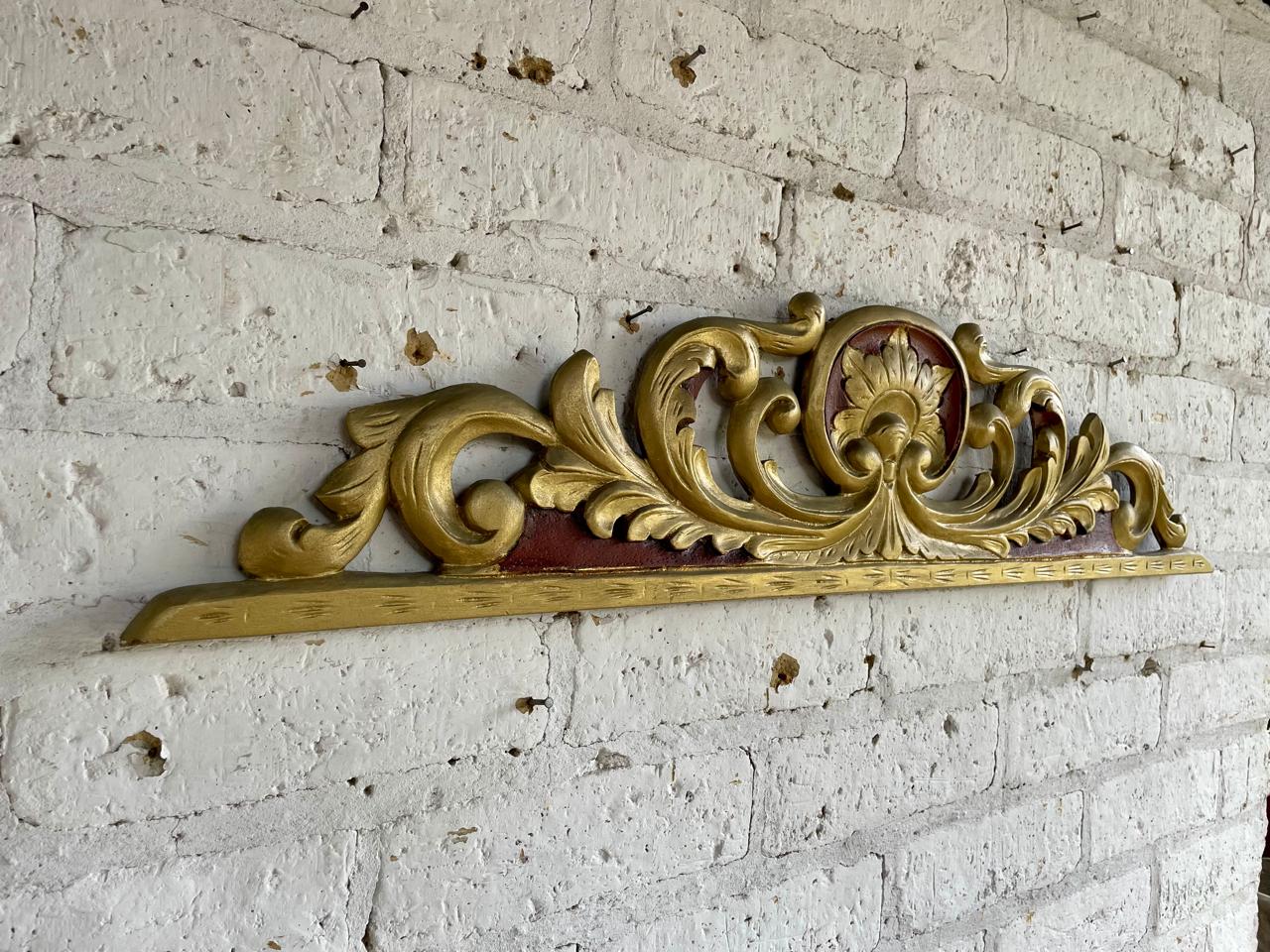 Friso antiguo tallado en madera decorado en tono dorado y rojo. Se encuentra en buen estado libre de termitas.