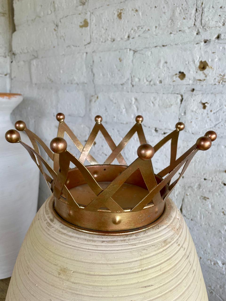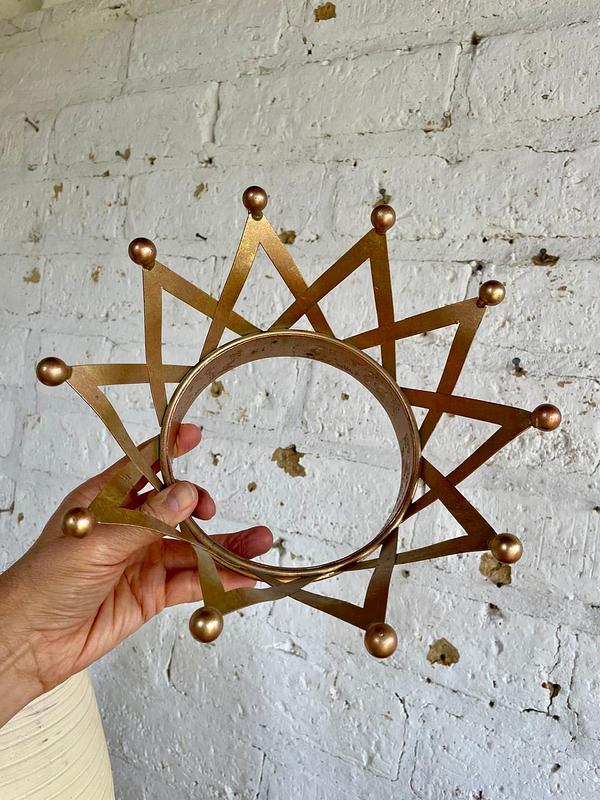 Corona decorativa de diseño clásico de 10 puntas triangulares simétricas rematadas con esferas, elaborada artesanalmente en lámina metálica guresa, el anillo de la base está decorado con pequeños relieves circulares.