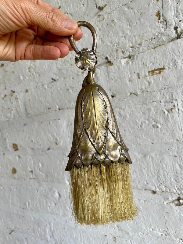 Escobilla antigua de mesa estilo Art Nouveau, francesa de mediados del S XX. Elaborado en bronce, con un acabado que sugiere un baño de plata que ha sido desgastado con el uso y el paso del tiempo, revelando el metal base. El mango tiene un diseño intrincado en forma de hoja o pétalo de flor, con detalles cincelados y un anillo superior para colgarlo. El diseño es elegante y curvo, típico de la época. Se utilizaba para limpiar migas u otros pequeños residuos de una superficie de mesa o tocador. Las cerdas son de color claro, probablemente de pelo natural, y están firmemente sujetas en la base del cuerpo metálico.