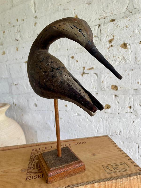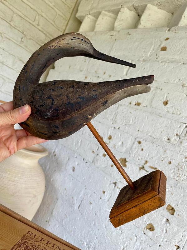 Talla artesanal rústica de madera de un zarapito, ave migratoria que se reproduce en el emisferio norte: tundra ártica, Alaska, Canadá, norte de Europa y Asia durante el verano boreal y en el invierno, migran al hemisferio sur, incluyendo costas de Chile, Australia y África.