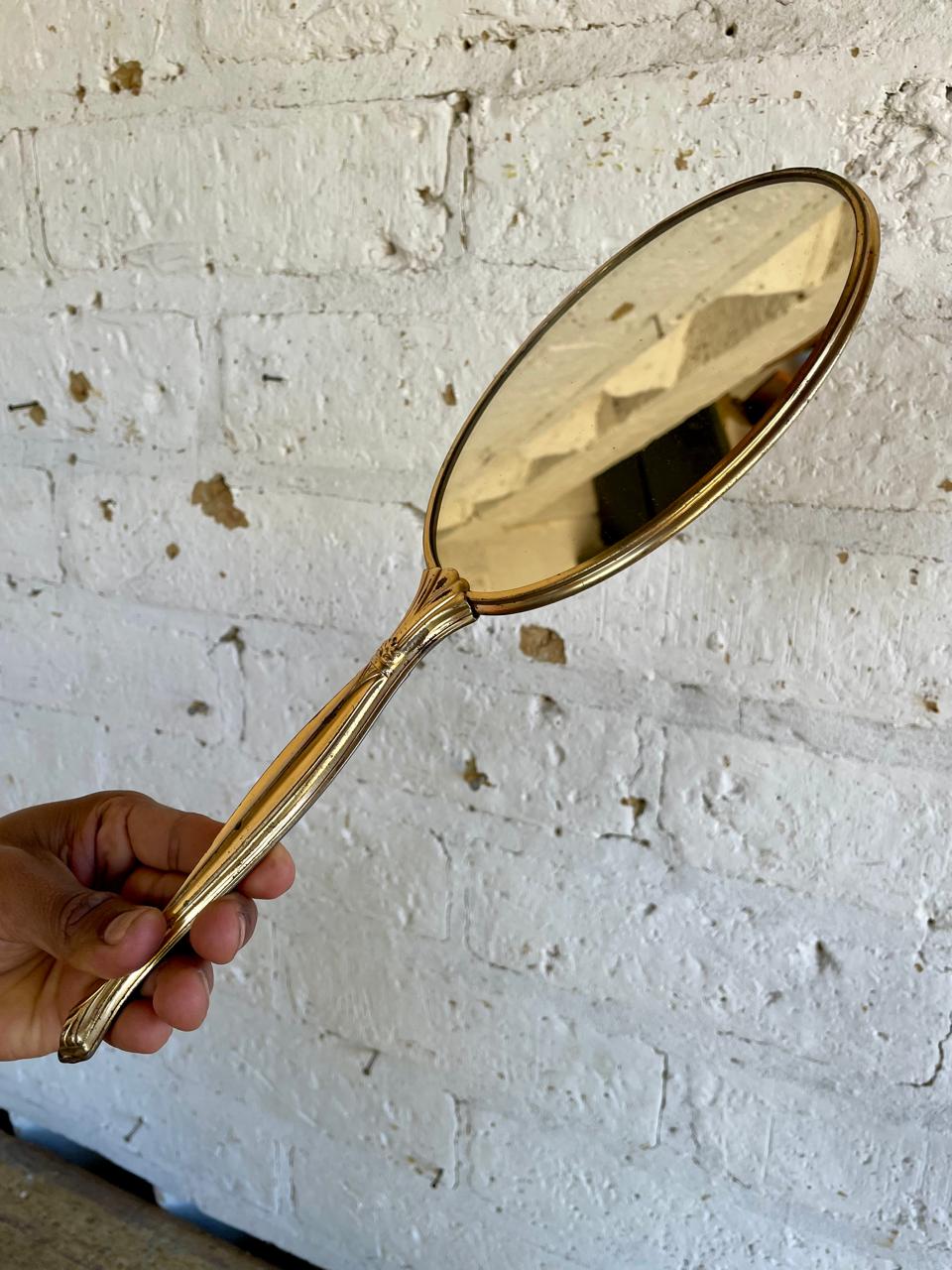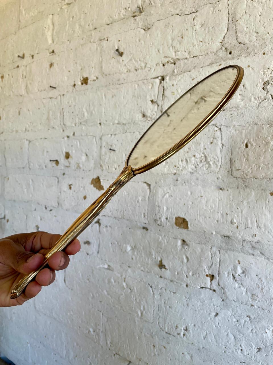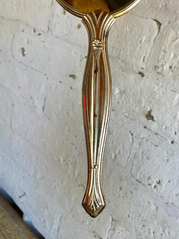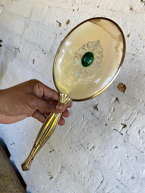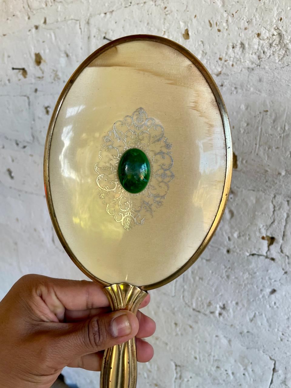 Espejo estilo Victoriano de mano inglés de principio del S XX, en lámina metálica dorada, respaldar cubierto de seda y tapa de acetato de celulosa decorado con arabescos plateados y un cabujón verde artificial. El espejo tiene pequeñas picaduras, la seda del respaldo esta manchada en la parte superior y el dorado del metal presenta desgastes. Una pieza que nos lleva a vivir la elegancia de la era victoriana.
