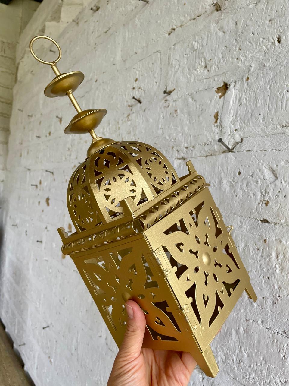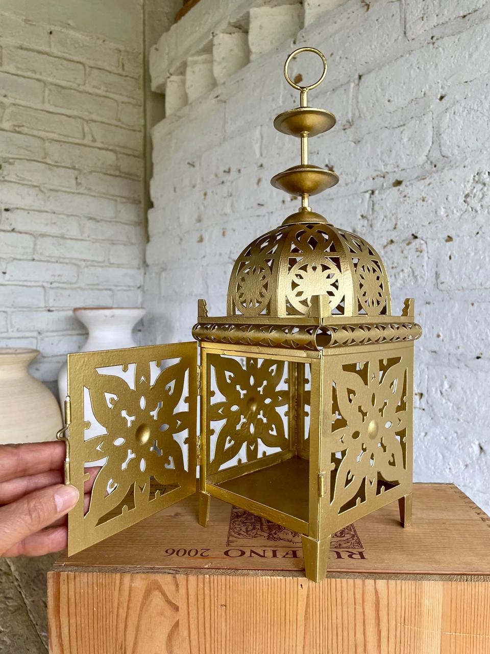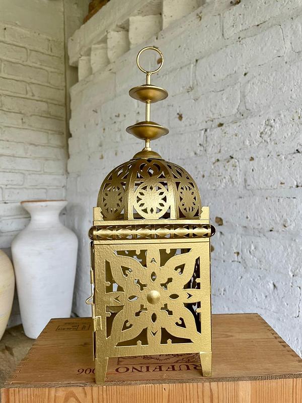 Farol elaborado en lámina metálica calada y decorado en dorado de estilo árabe.