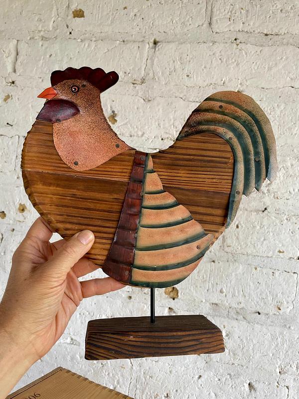 Figura de gallo en tabla de madera con pedestal decorado con láminas de aluminio pintadas.