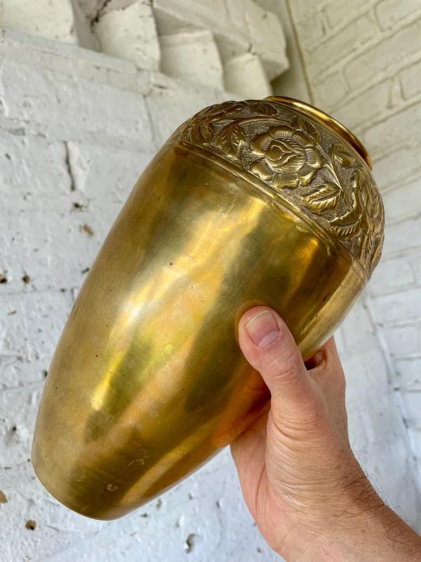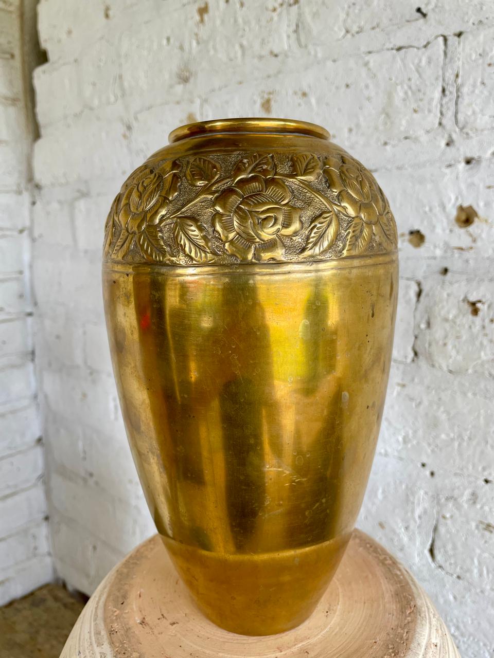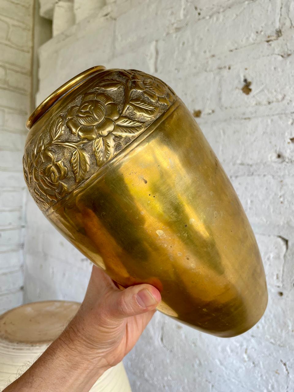 Florero en lámina de bronce decorada con rosas y hojas repujadas, producido en India en la primera mitad del S XX. Se encuentra en buen estado.