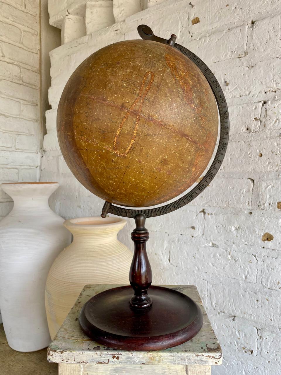 La regleta circular con escala es de bronce fundido, el globo terráqueo es de metal cubierto de cartón impreso y la base de madera. Tiene registrado el sello del fabricante. El metal y la madera se encuentran en buen estado, presenta desgastes en el color, peladuras y sumiduras en el globo terráqueo dados por el uso y el paso del tiempo de más de un siglo de haber sido fabricado.