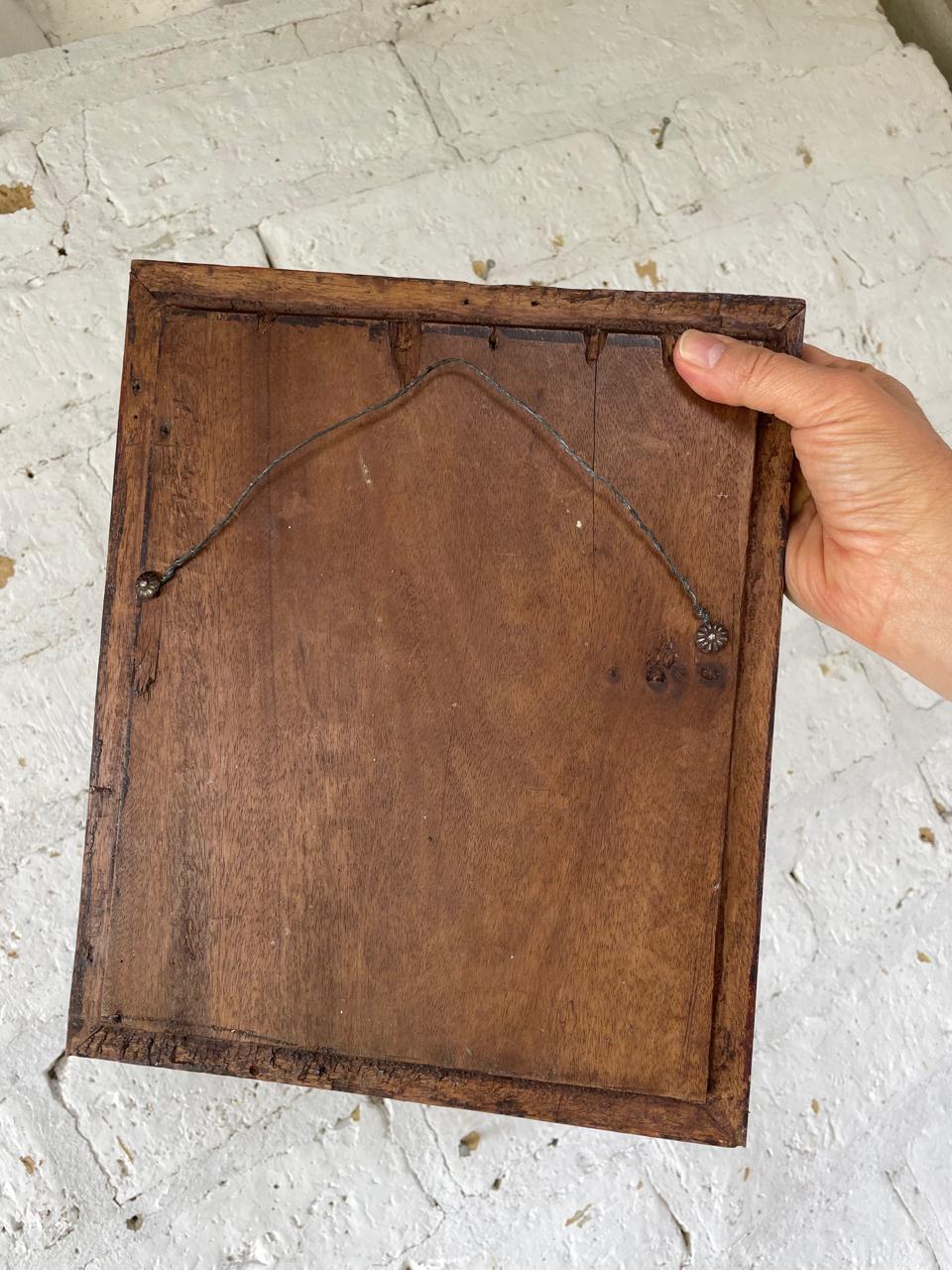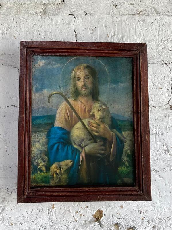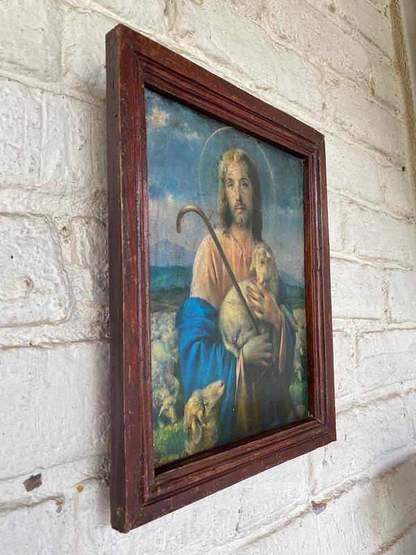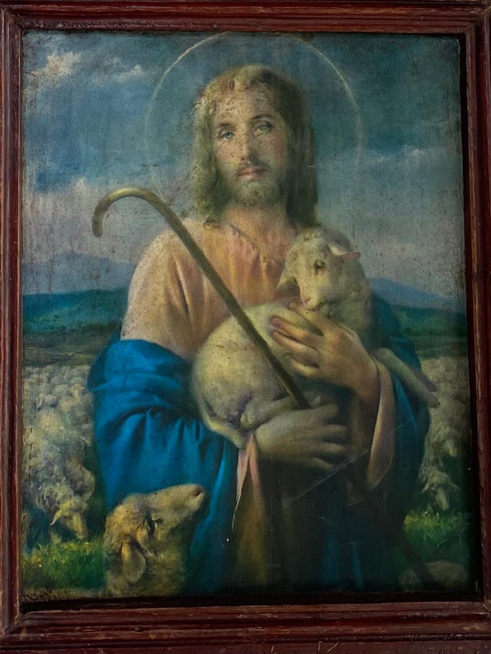 Cuadro de Jesús el Buen Pastor del arte devocional popular de mediados del siglo XX en Colombia. Representa una tradición profundamente arraigada en Boyacá, donde la fe y la artesanía local se unían para crear altares domésticos. Esta lámina pudo haber sido un recuerdo de peregrinación a la Basílica de Chiquinquirá donde vendían láminas con estas características en los años cincuenta. El marco fabricado artesanalmente con madera maciza por carpinteros locales, la sencillez del montaje refleja la humildad y la devoción del hogar campesino, donde estos cuadros ocupaban un lugar central en la sala o el dormitorio. La lámina presenta desgastes, decoloraciones y manchas logradas a través del tiempo, la madera se encuentra libre de termitas