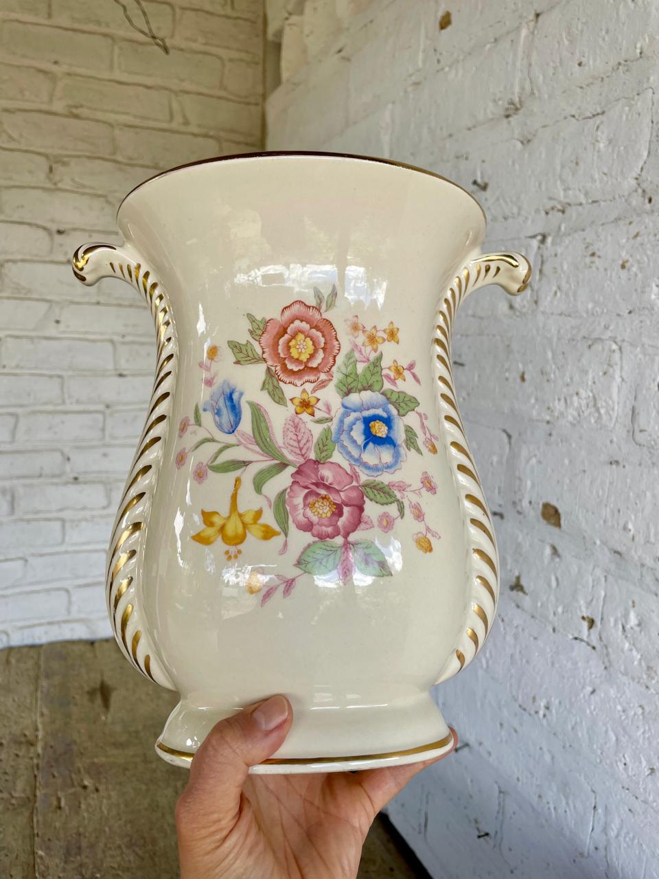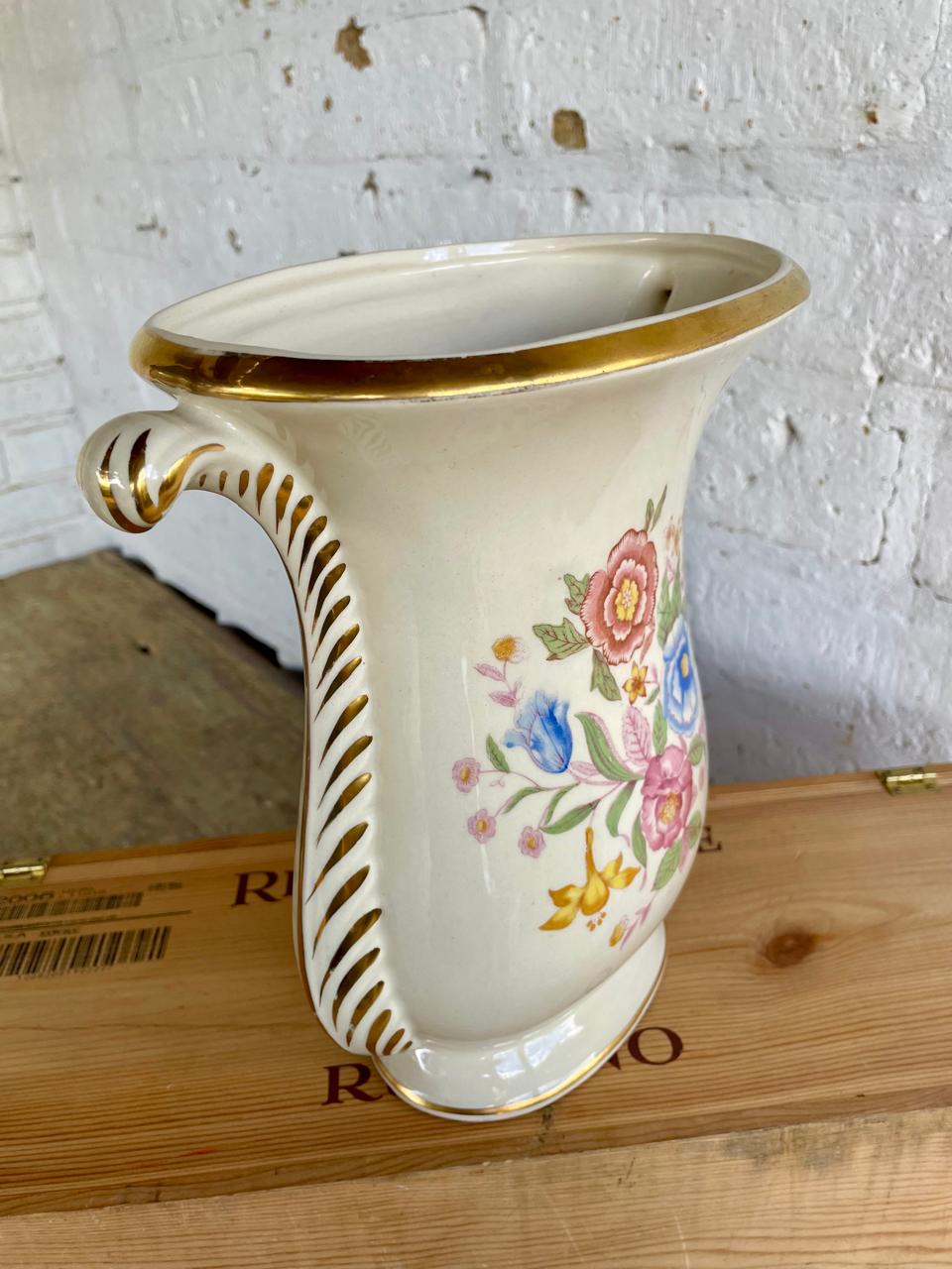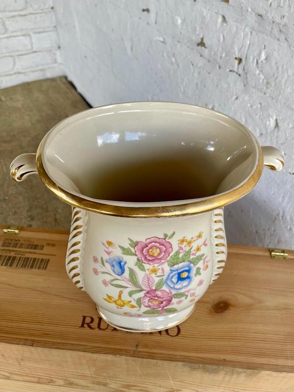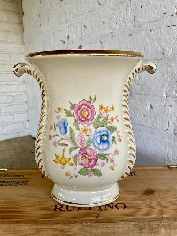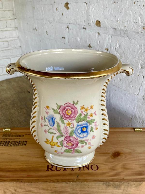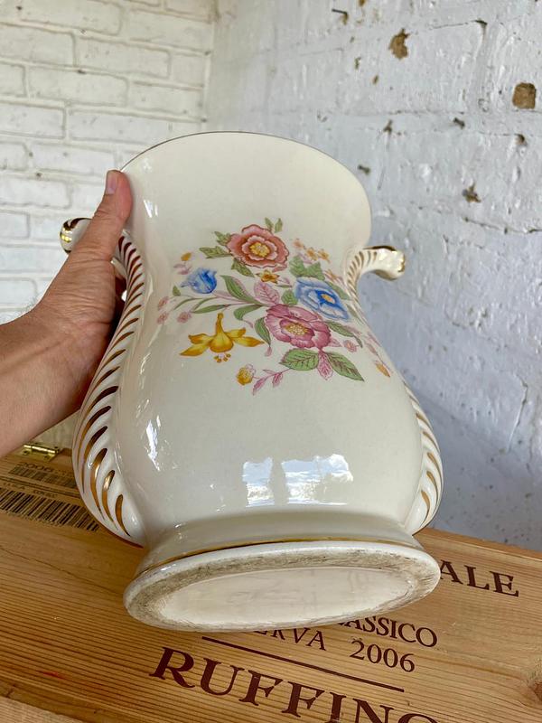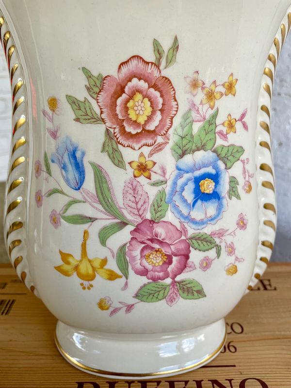 Jarrón en porcelana elaborado por Princeton en China en los años cuarenta, tiene un ramo de flores en cada una de las dos caras, decorado con rebordes dorados. La porcelana se encuentra en buen estado, el dorado presenta desgastes. En la base tiene en bajo relieve P 121, marca característica de la porcelana Princeton de mediados del S XX.
