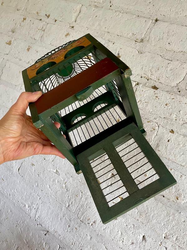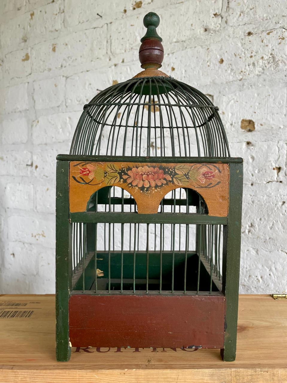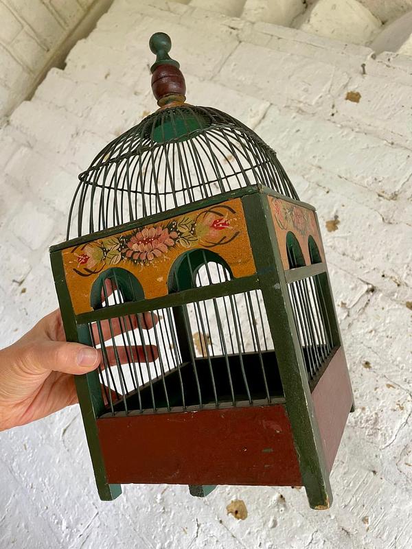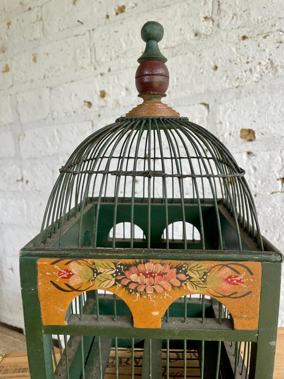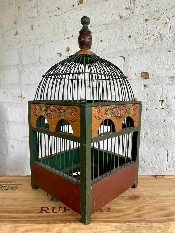 Jaula vintage decorativa de pájaros en madera con motivos florares pintados a mano y una estructura en forma de cupula de metal en la parte superior. Históricamente utilizada para pájaros, hoy en día es común encontrarla como objeto de decoración interior o artículo coleccionable. La base se puede abrir a manera de puerta. Se encuentra en buen estado con desgastes en el color por el paso del tiempo y el uso.