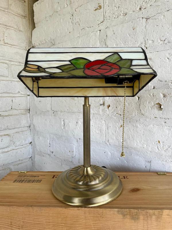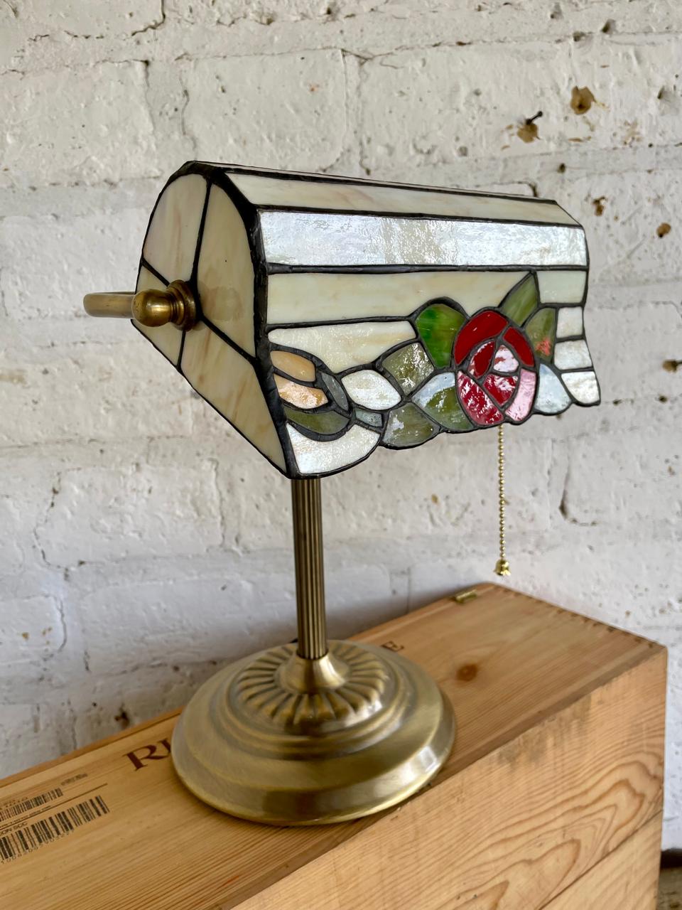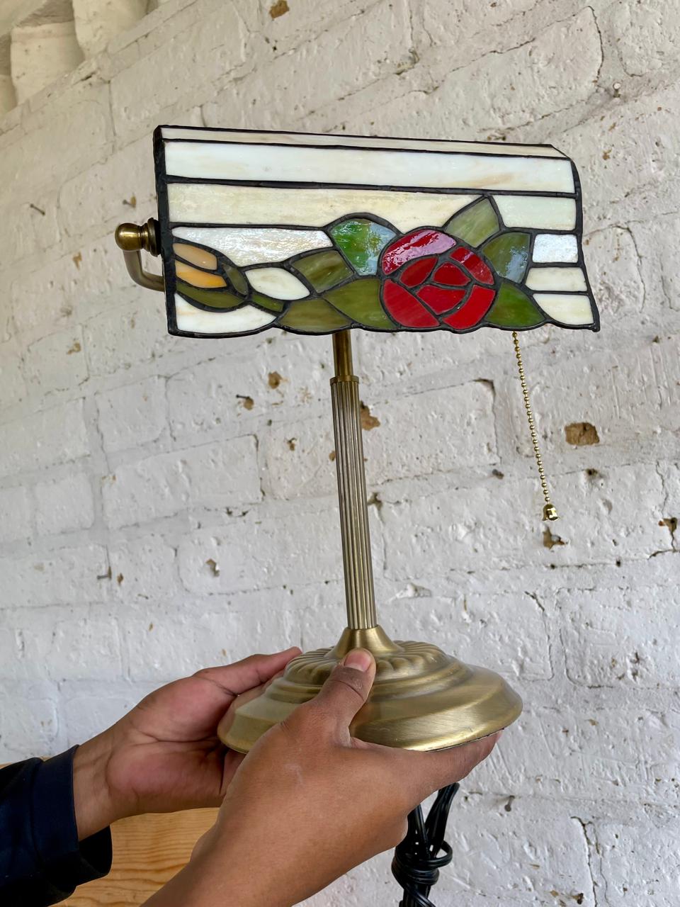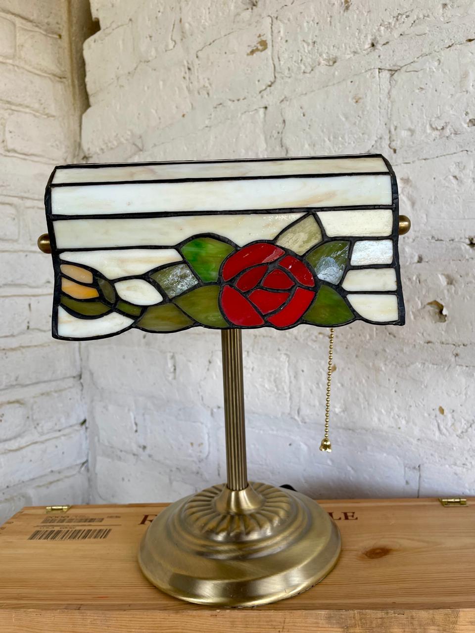 Lámpara de banquero con base en bronce y caperuza en vitral estilo tiffany modernista elaborada con piezas de vidrios uroboros color hueso con una flor roja. La caperuza se puede girar para enfocar la luz desde diferentes ángulos.