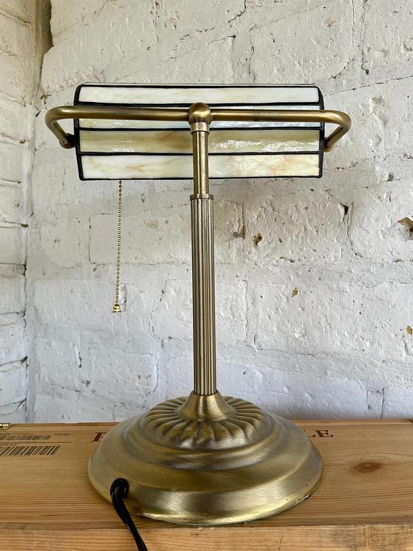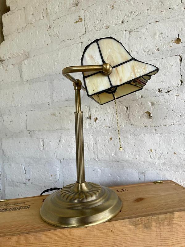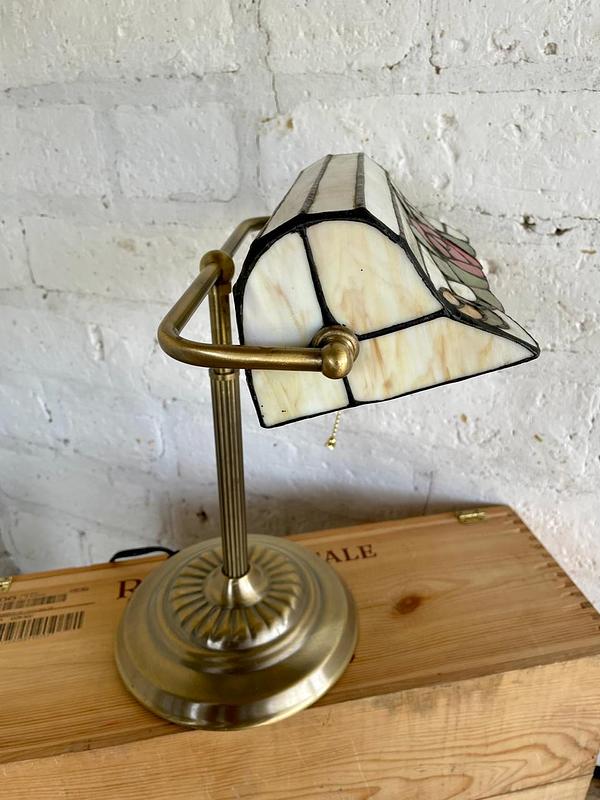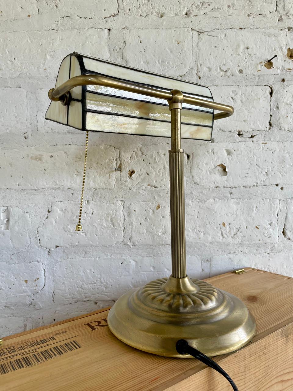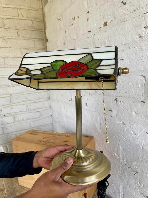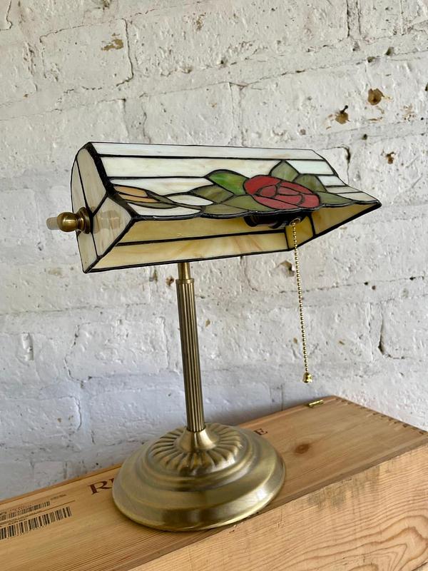 Lámpara de banquero con base en bronce y caperuza en vitral estilo tiffany modernista elaborada con piezas de vidrios uroboros color hueso con una flor roja. La caperuza se puede girar para enfocar la luz desde diferentes ángulos.