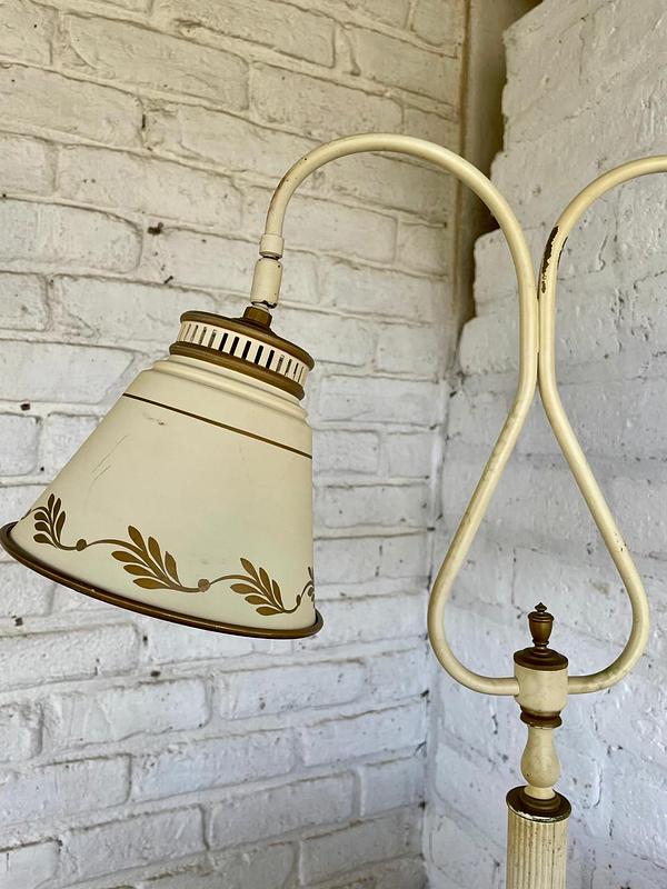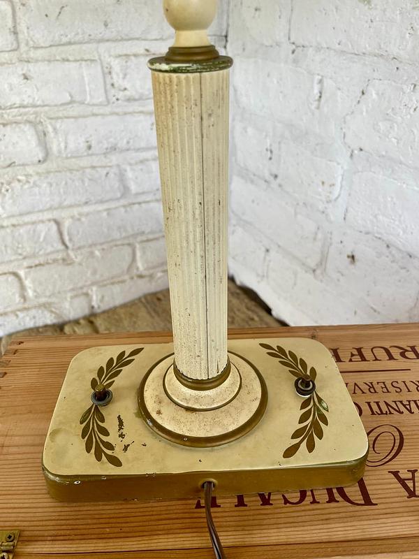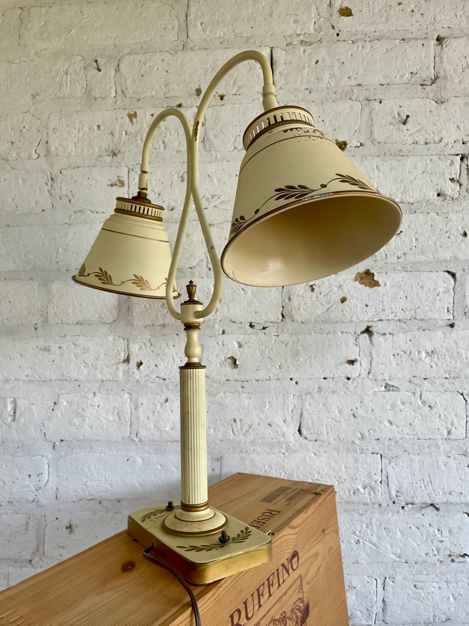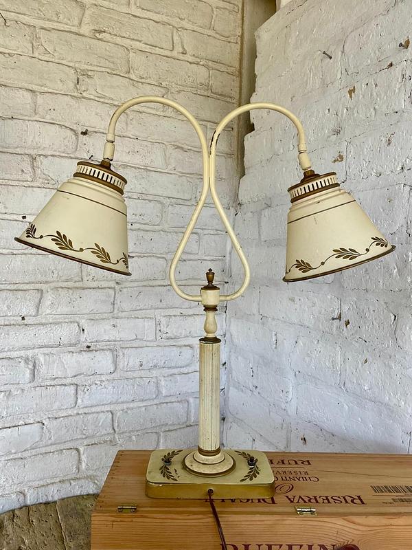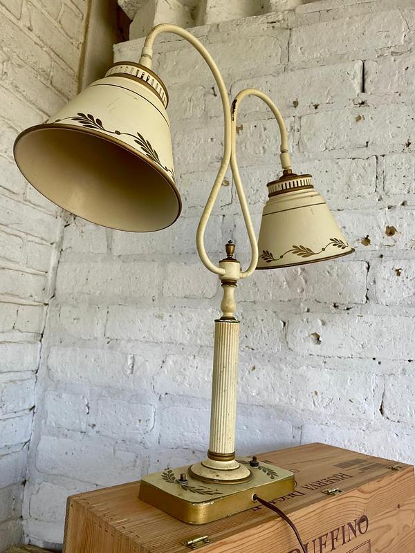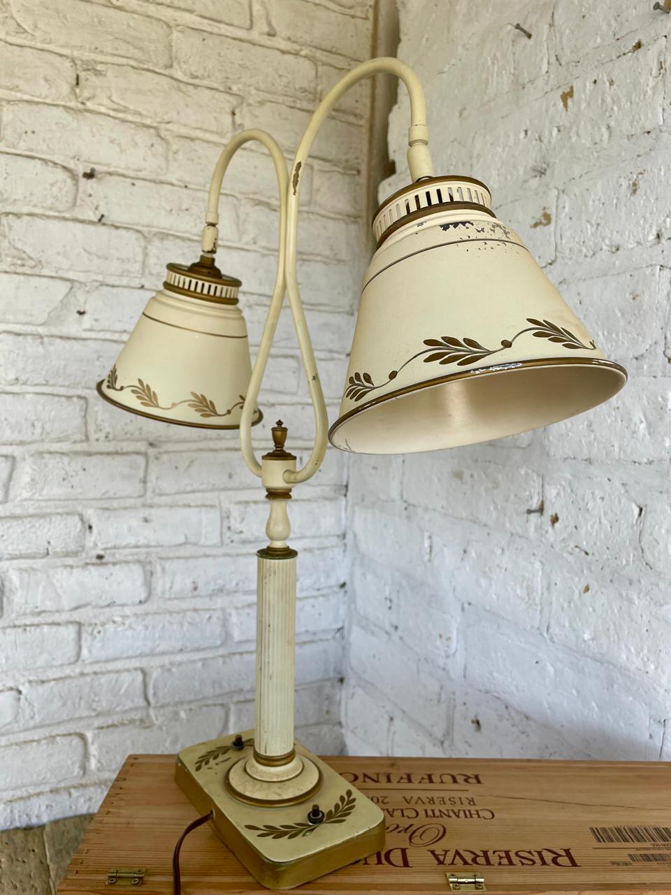 Lámpara de mediados del S XX elaborada en Estados Unidos, en lámina metálica gruesa decorada en tonos pastel con rebordes dorados, en la base tiene dos interruptores que permiten encender y apagar las lámparas de manera individual. Presenta desgastes en la pintuera y algunas pequeñas abolladuras logradas por el paso del tiempo. La parte eléctrica se ha actualizado y funciona bien.