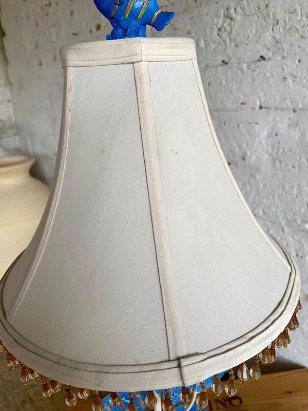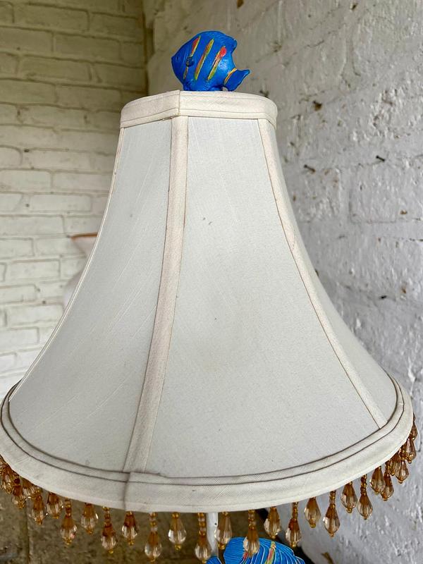 Lámpara con base en resina extrafuerte y apariencia de piedra coralina, el eje central de tubo metálico, los peces son de lámina metálica gruesa y la caperuza es de lino forrada con cuentas sintéticas como fleco. Utiliza bombillo de rosca E 24.