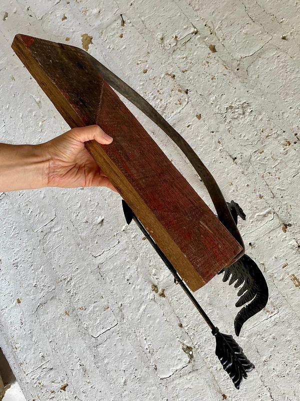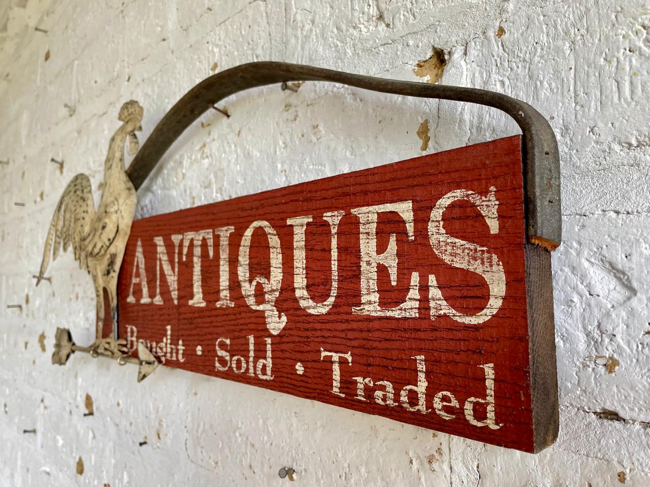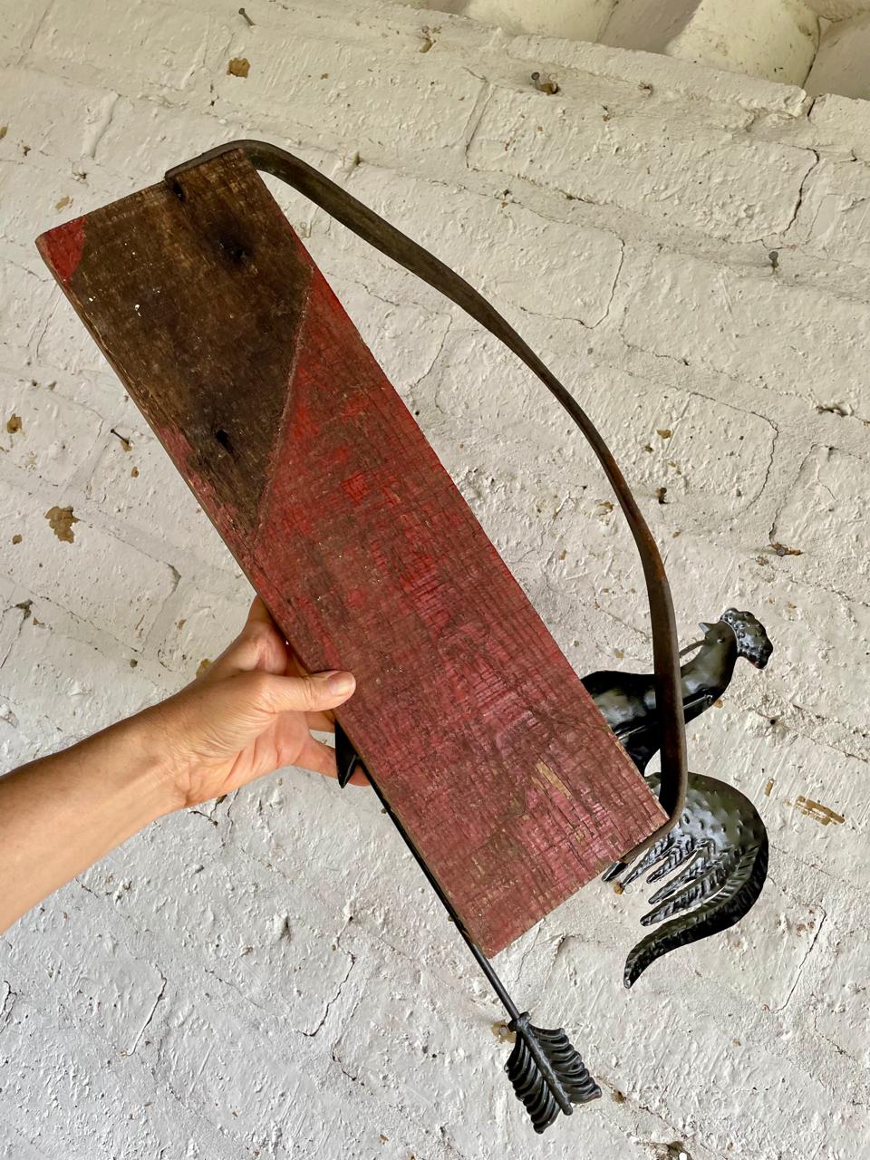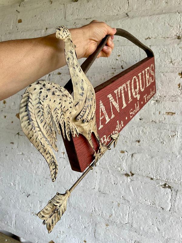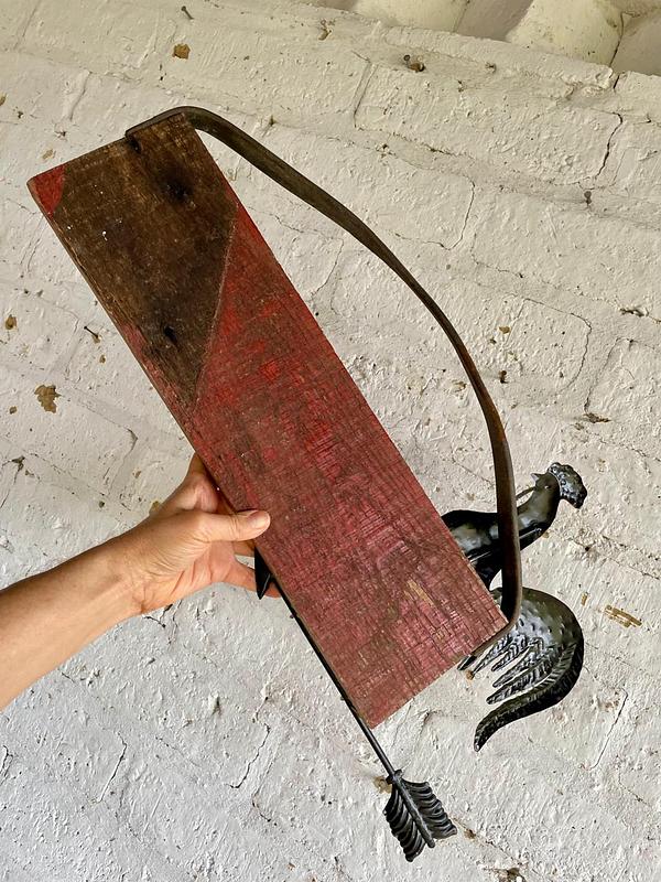 Letereo artesanal elaborado con madera reciclada, aplique de figura de gallo en aluminio y colgadera de cuero.