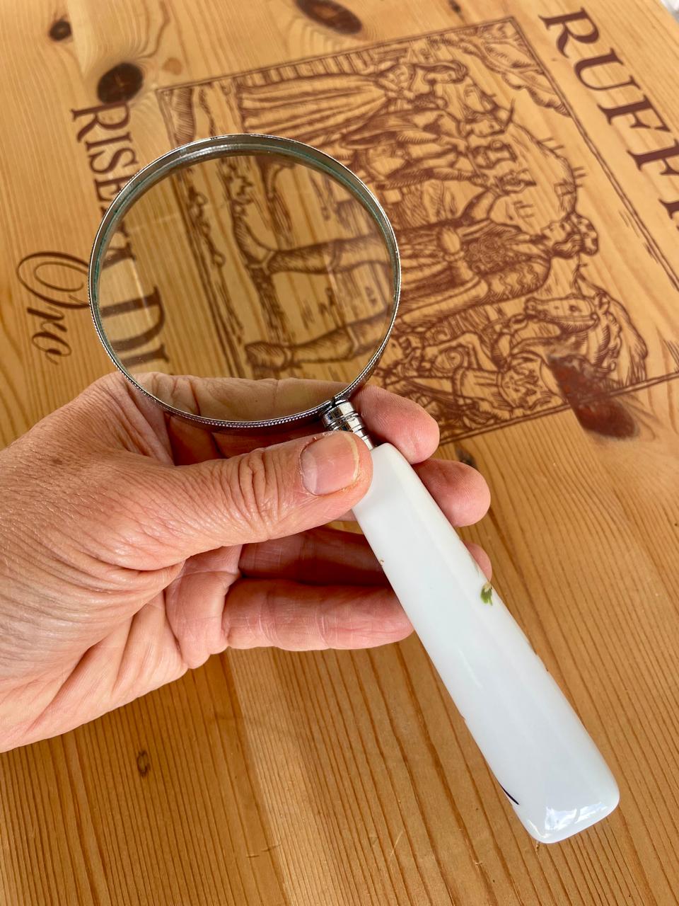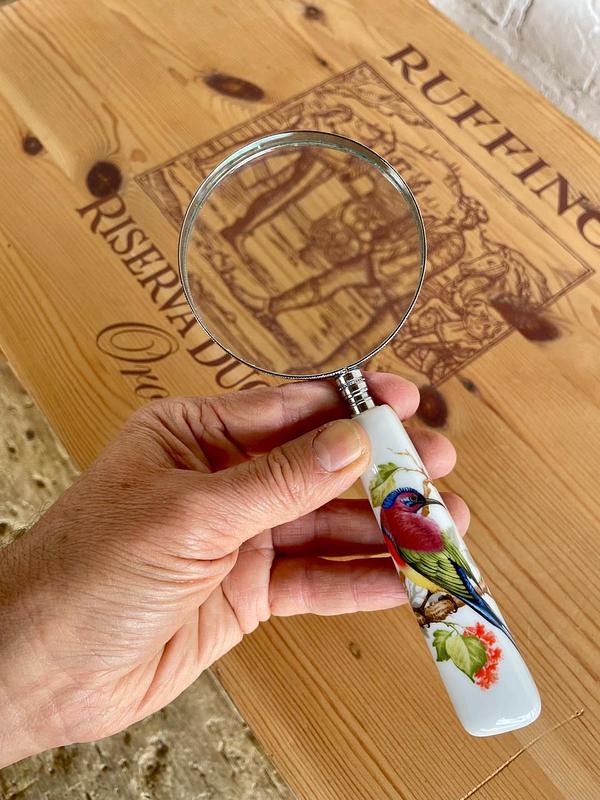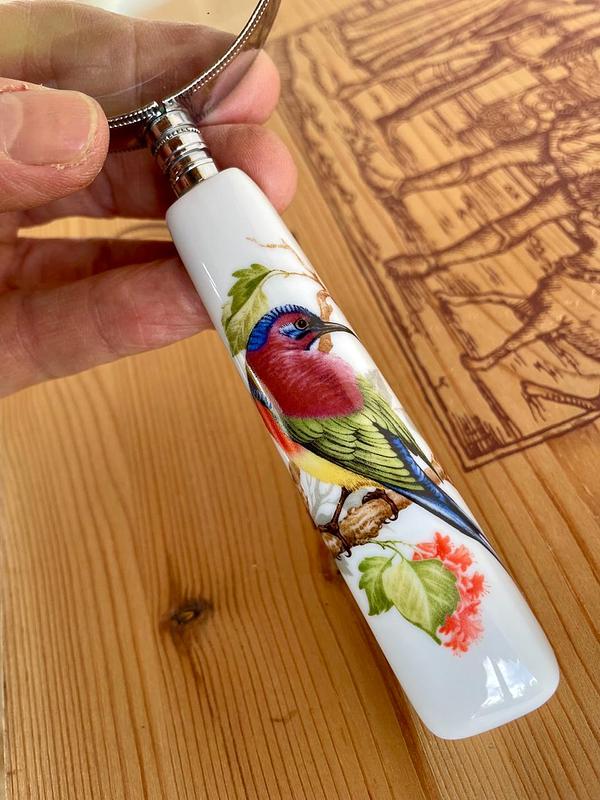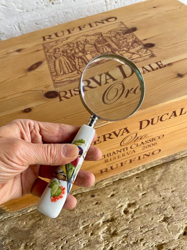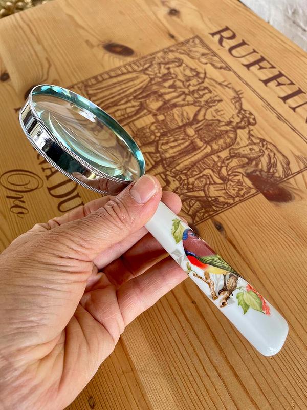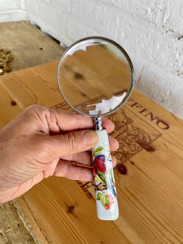 Lupa con mango de porcelana decorado con la figura de un pájaro sobre una rama, el marco es en lámina metálica plateada.