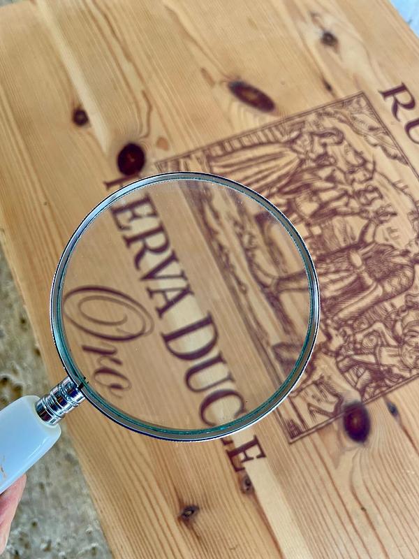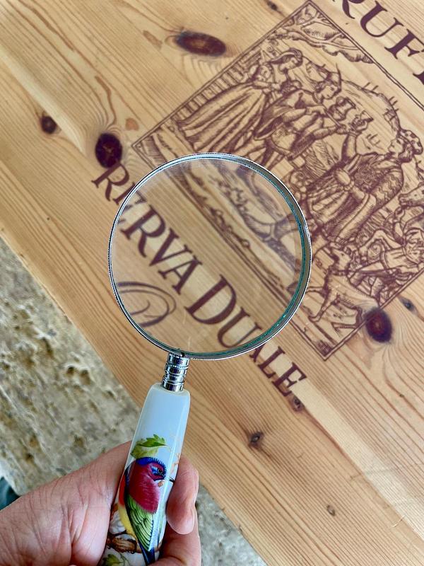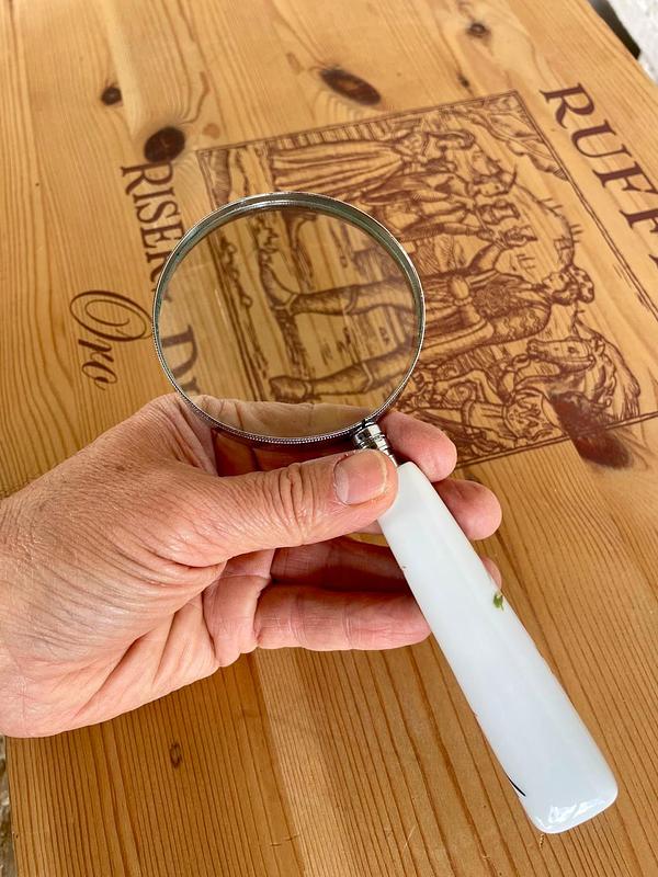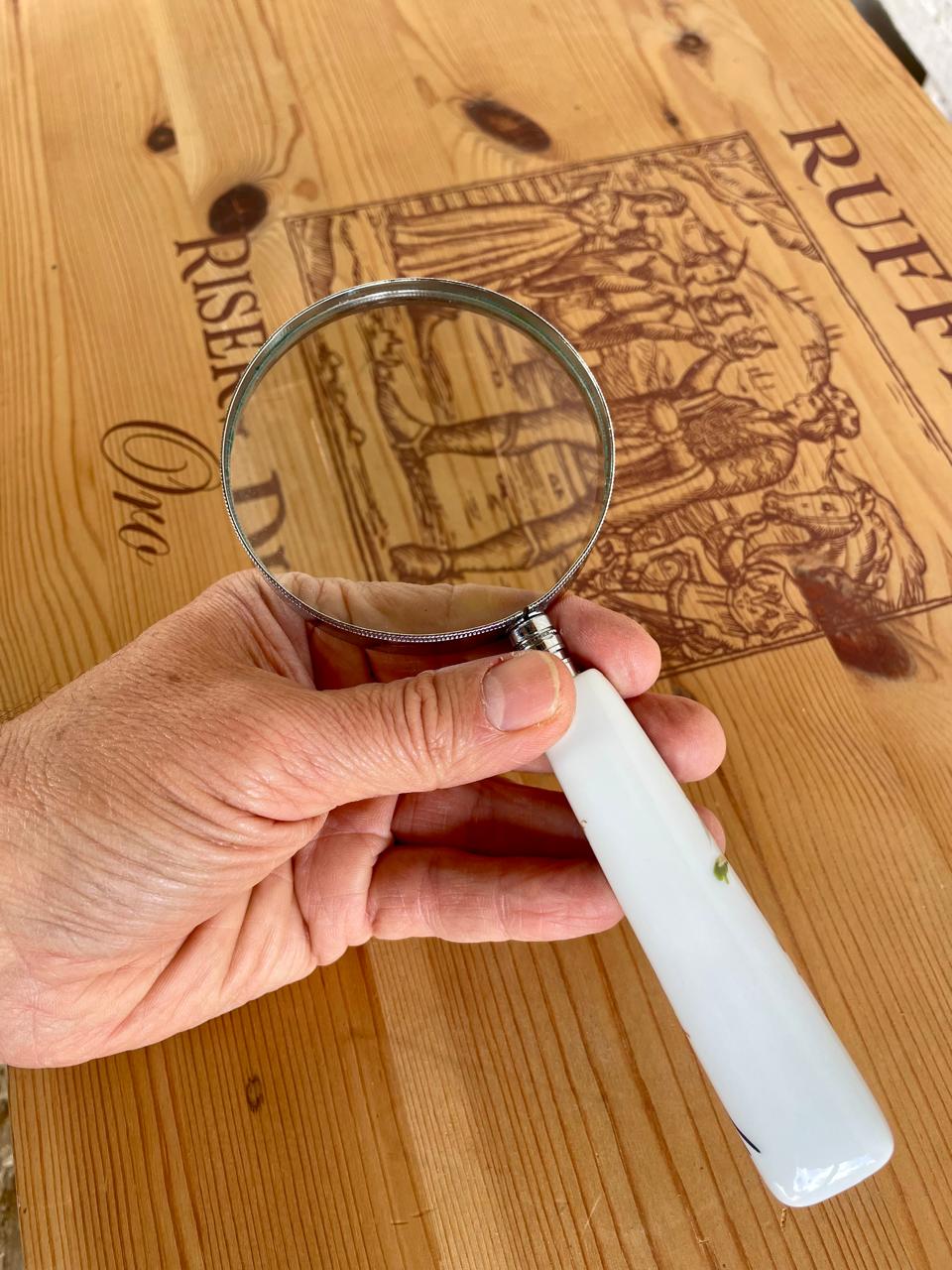 Lupa con mango de porcelana decorado con la figura de un pájaro sobre una rama, el marco es en lámina metálica plateada.