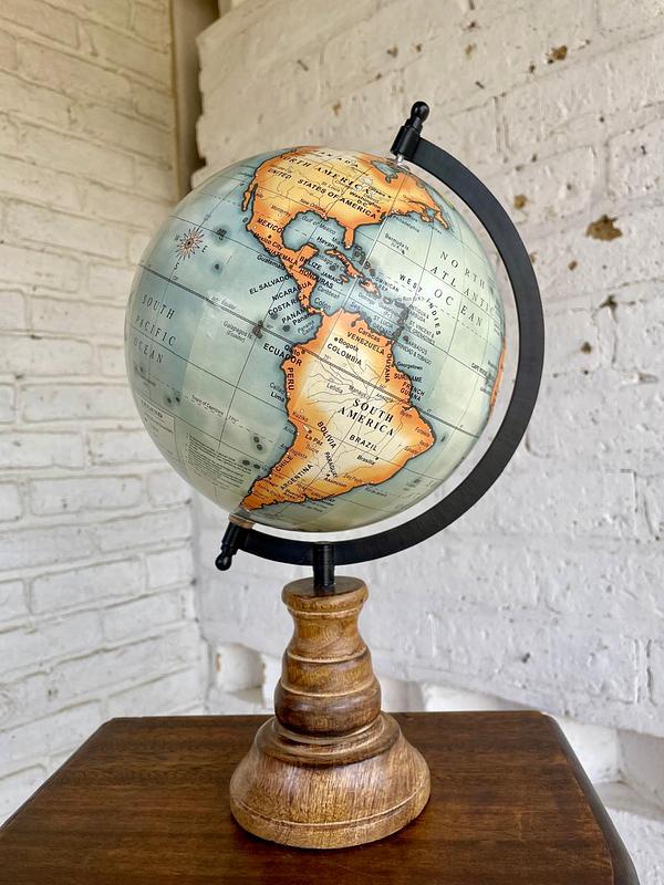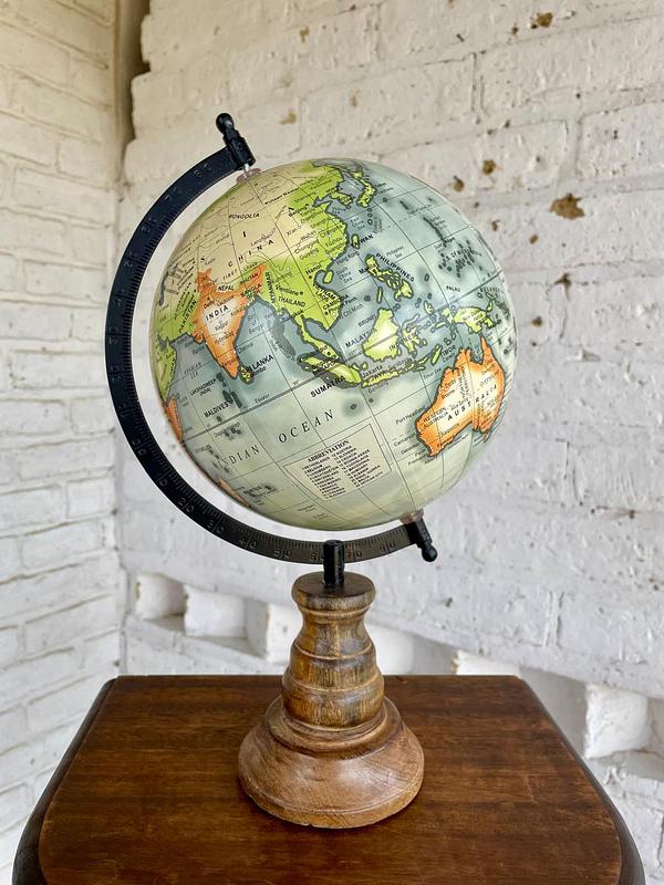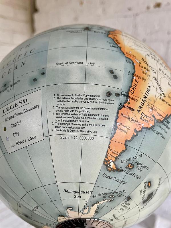 Globo terráqueo elaborado en India en 2008, la base es en madera, el eje metálico y el globo de resina y cartón. Se encuentra en buen estado.