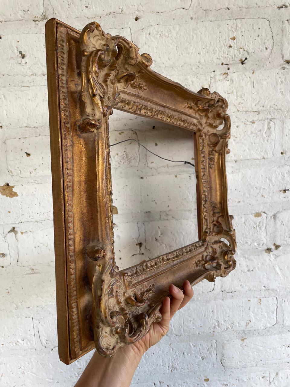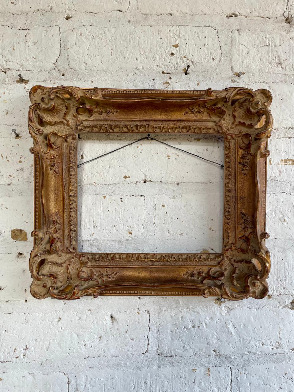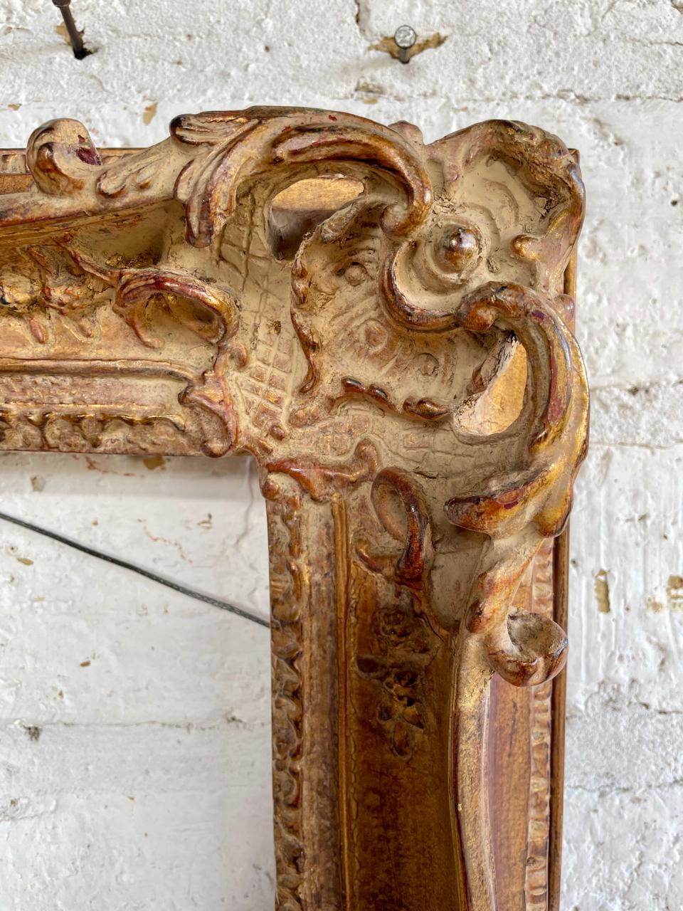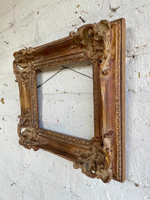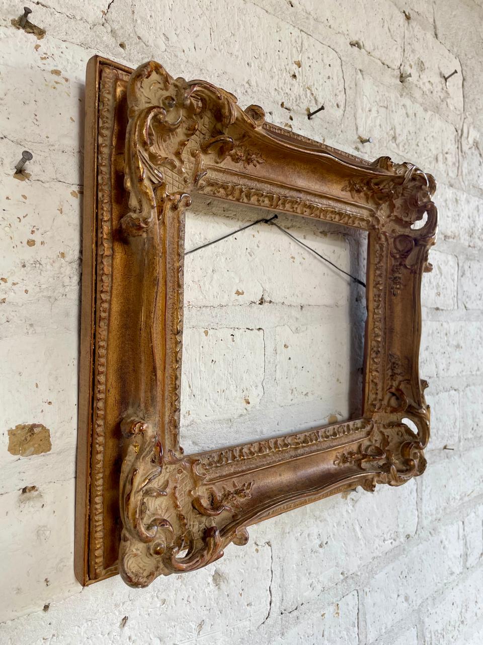 Marco de principio del S XX elaborado en madera de estilo victoriano clásico decorado con acantos en alto relieve. Conserva el acabado dorado original con algunos desgastes por el uso y el paso del tiempo.