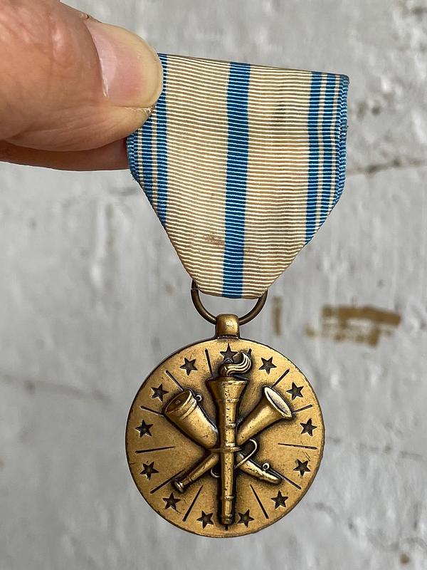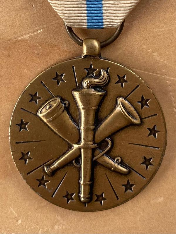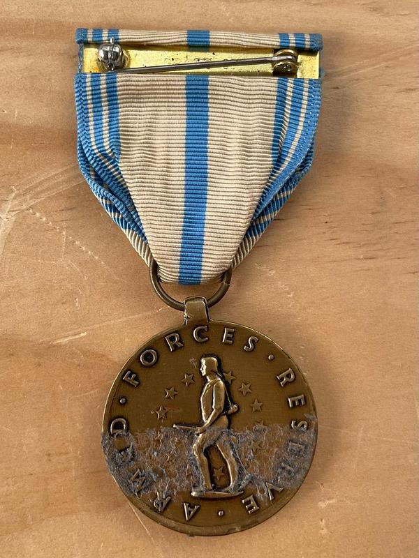 Medalla de la Reserva de las Fuerzas Armadas de Estados Unidos de la década del noventa, esta medalla se otorga a los miembros de la Reserva de las Fuerzas Armadas de los Estados Unidos que hayan completado diez años de servicio. La medalla se encuentra en buen estado, la cinta tiene manchas y desgaste.