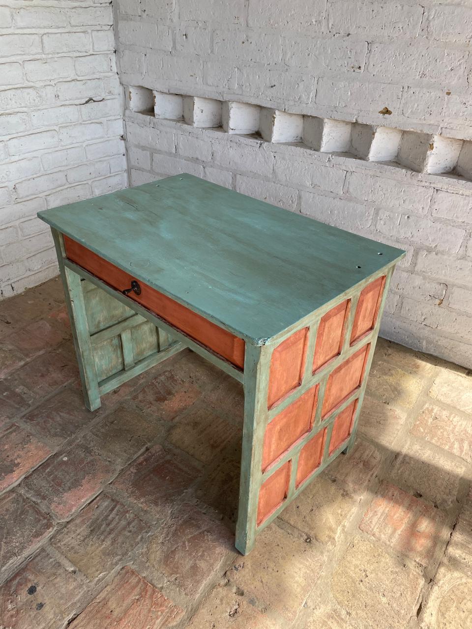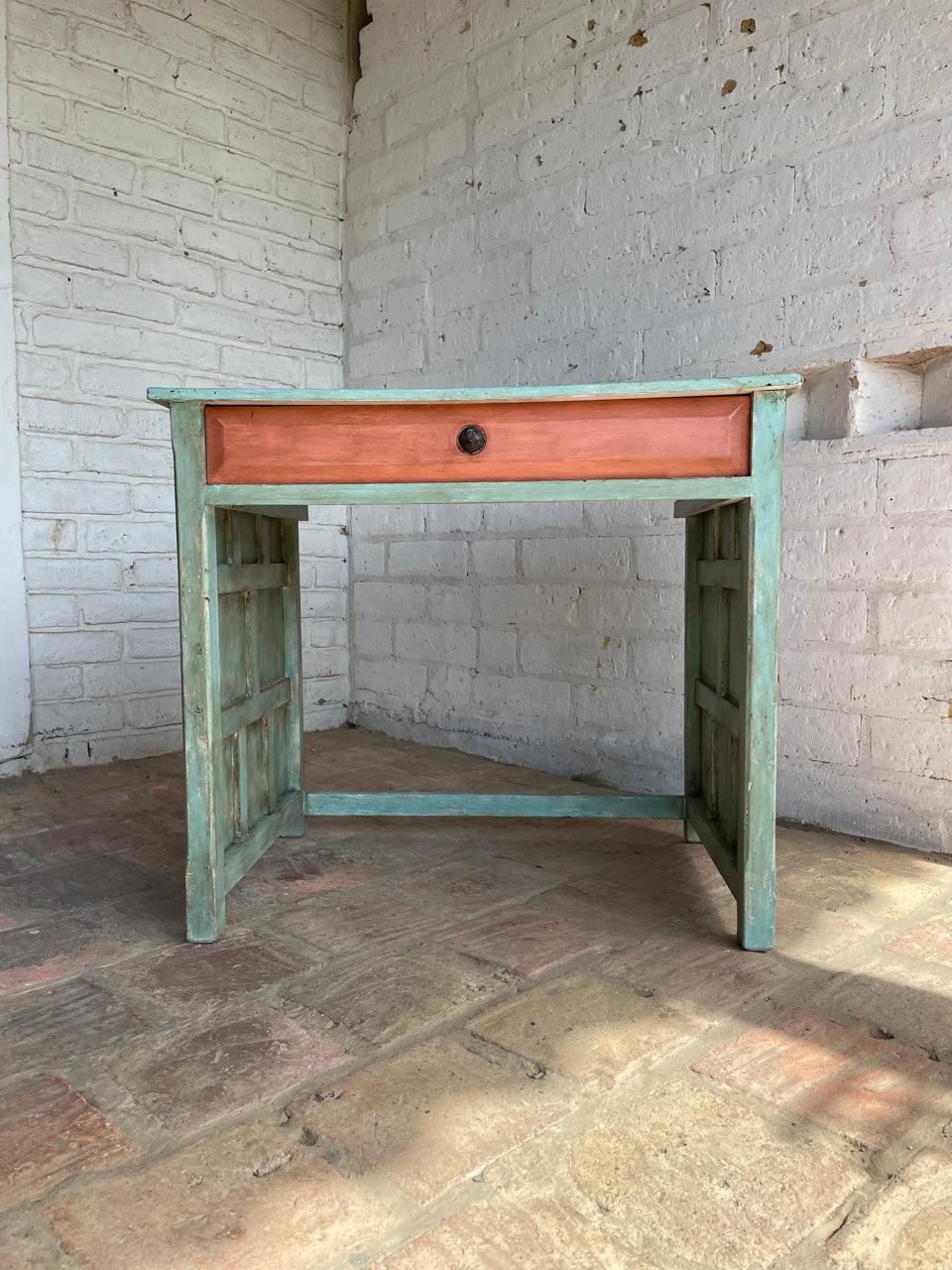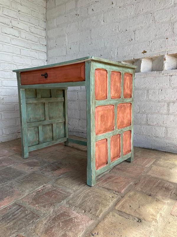 Mesa rústica en madera estilo escritorio de los años ochenta, recuperada y decorada con pintura desgastada manteniendo la apariencia envejecida, se encuentra en buen estado libre de gorgojos y termitas.