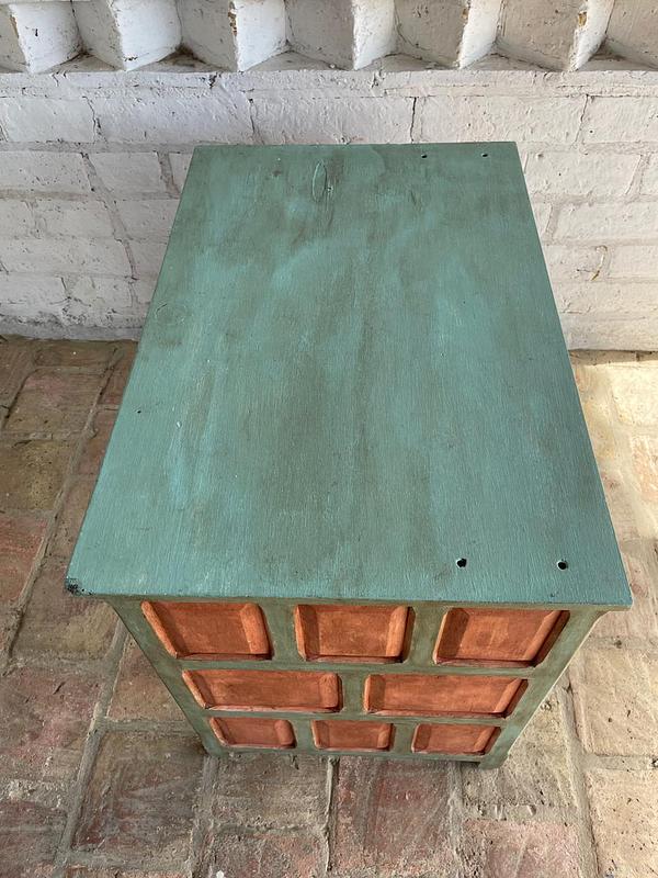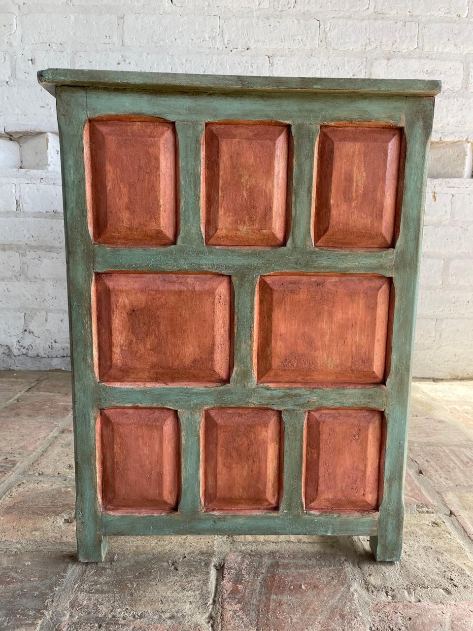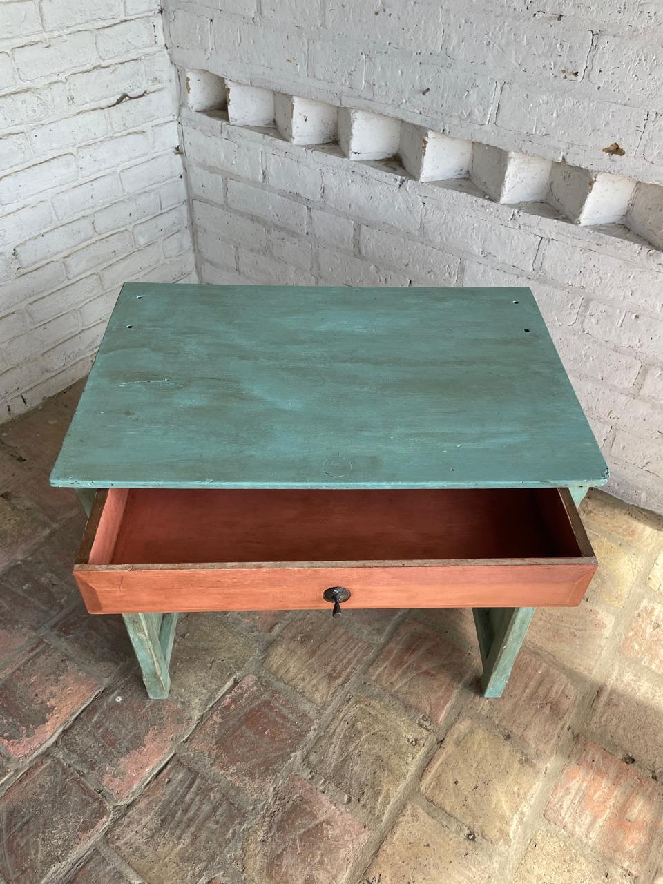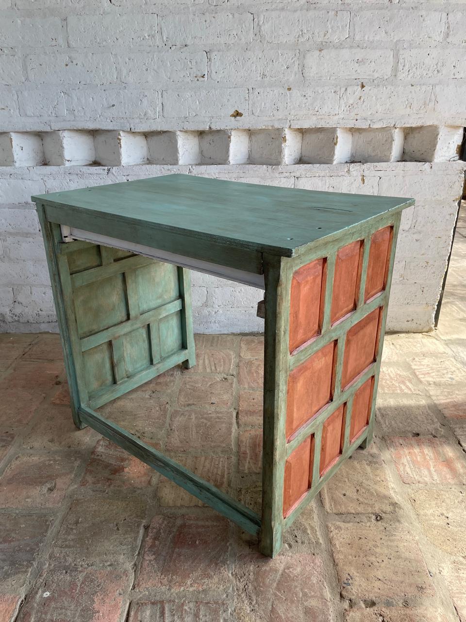 Mesa rústica en madera estilo escritorio de los años ochenta, recuperada y decorada con pintura desgastada manteniendo la apariencia envejecida, se encuentra en buen estado libre de gorgojos y termitas.