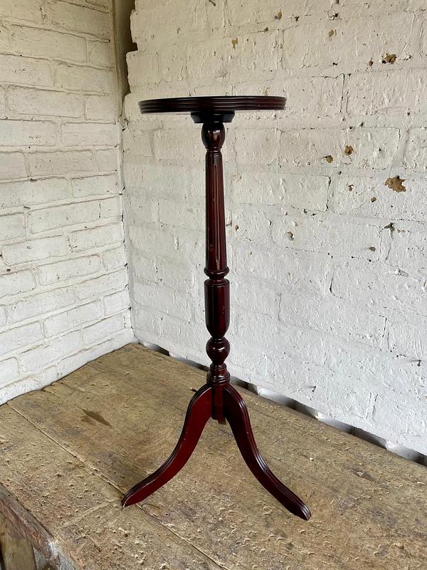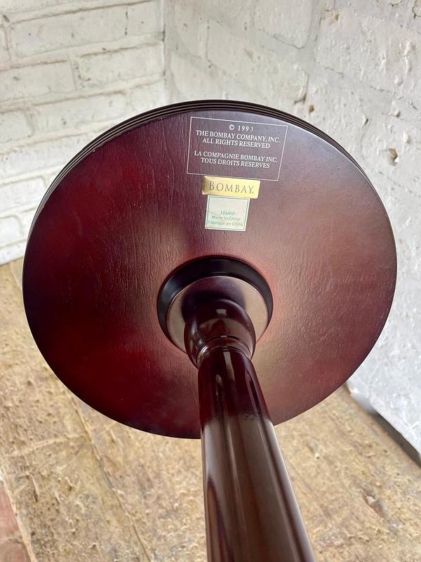 Mesa pedestal alta de madera, diseñada en USA y producida en China en 1993 para la marca de muebles The Bombay Company, INC. La mesa tiene un sistema de ensamble que permite separar las piezas para luego volverla a armar. Se encuentra en buen estado.