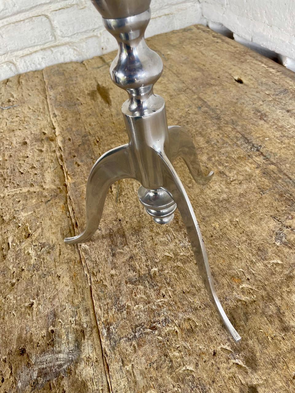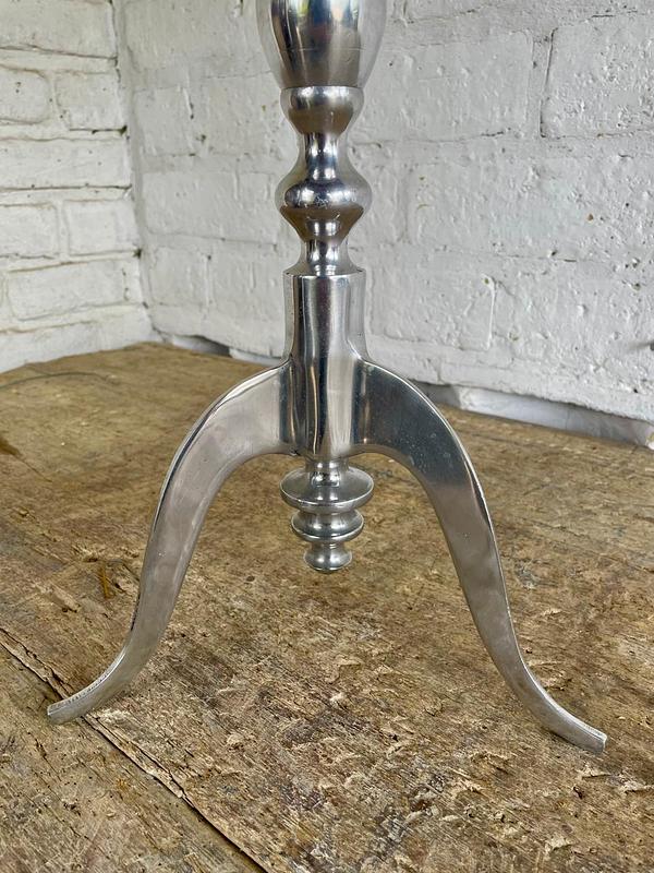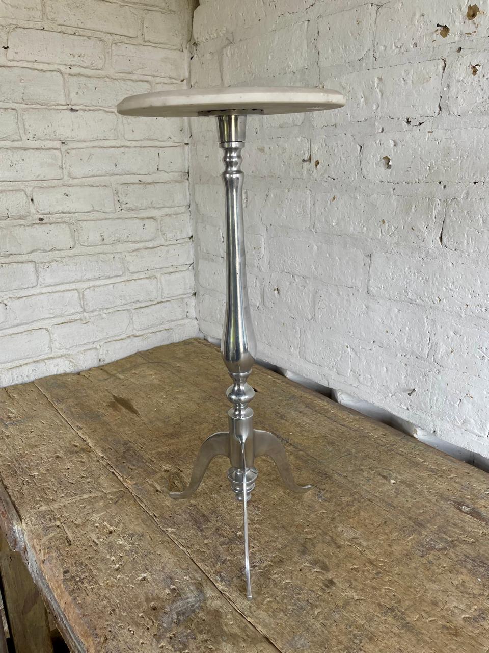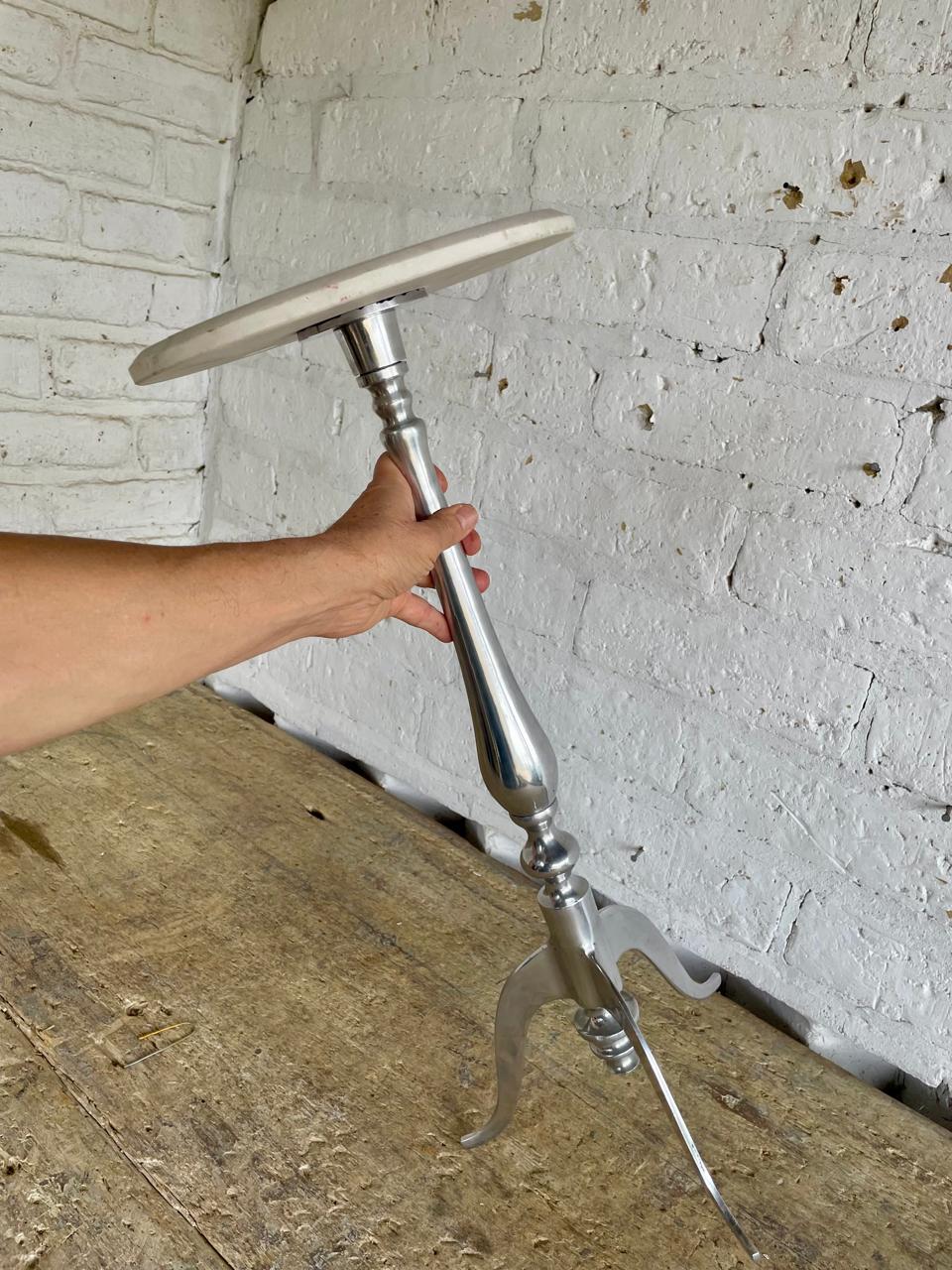 Mesa auxiliar redonda con tapa de mármol blanco y pata en aluminio fundido, elaborada en India en la década de los ochenta. Se encuentra en buen estado.