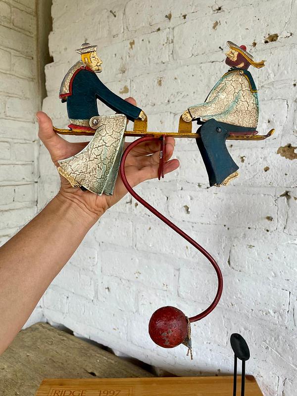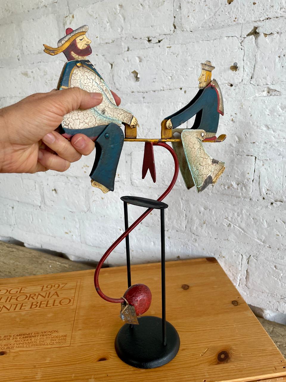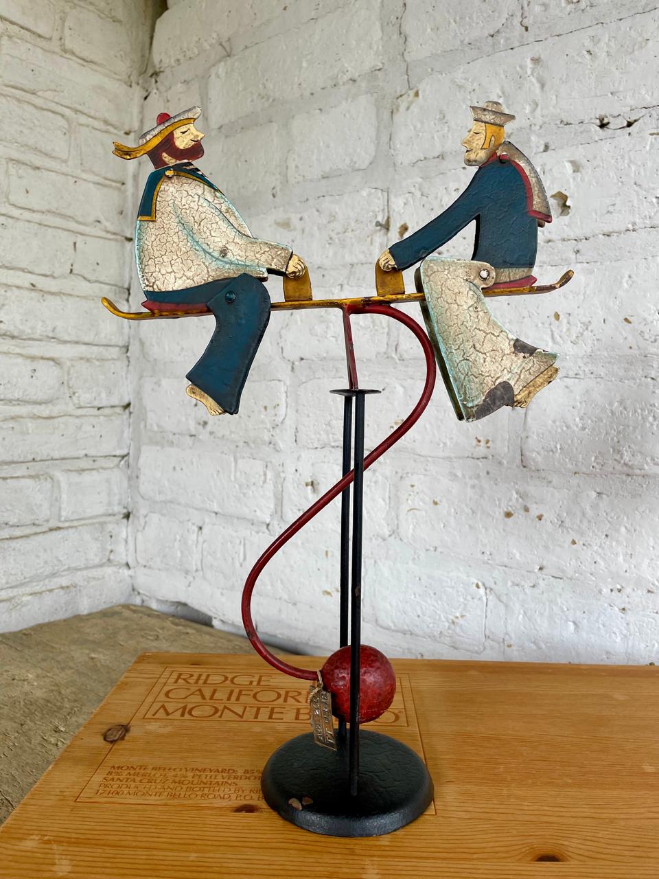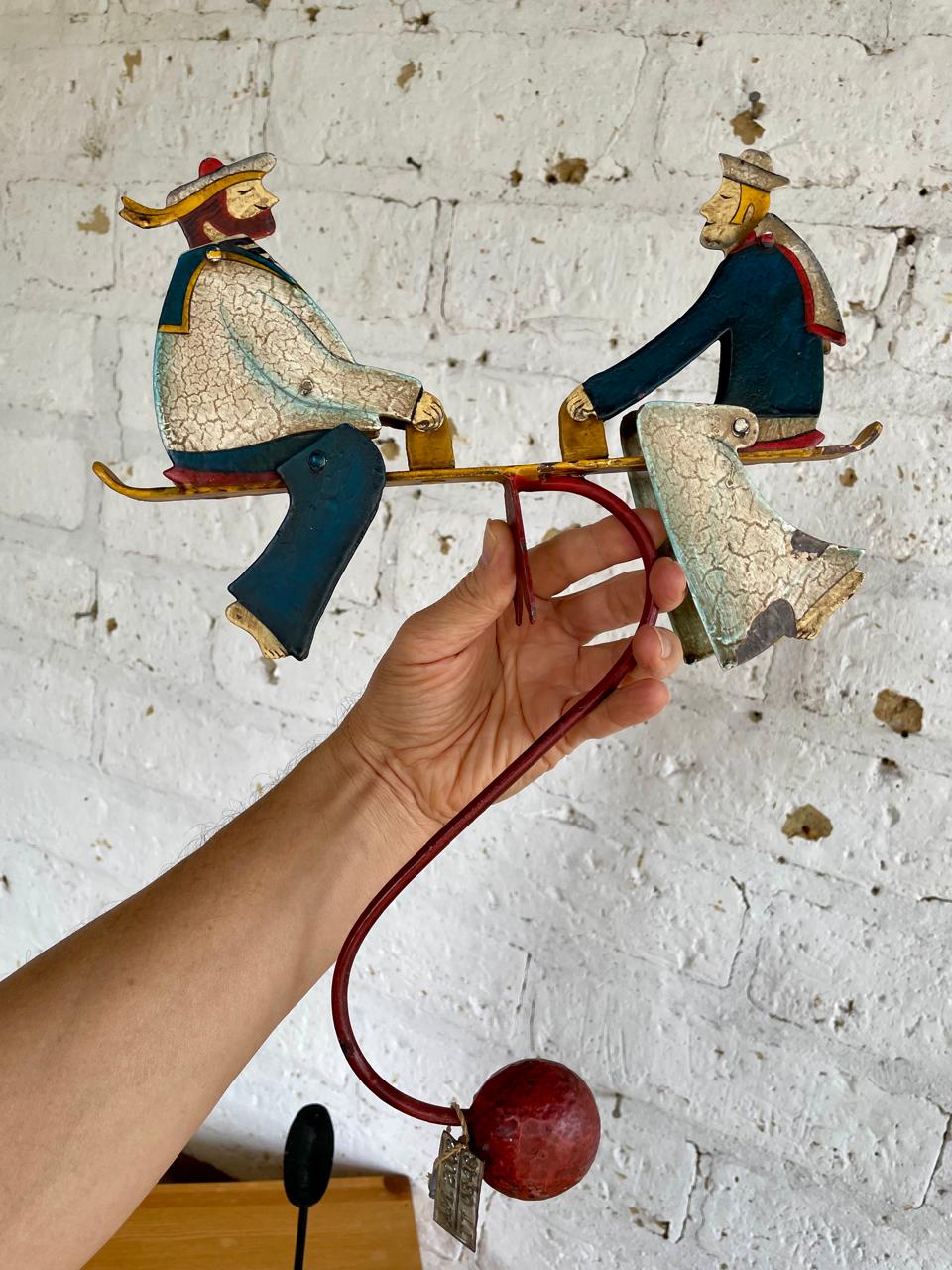 Figura balancín con péndulo, elaborada en Indonesia recreando un antiguo juguete. Al balancearse sobre el eje las figuras de los marineros mueven la cabeza y los pies. Elaborados en lámina metálica guresa repujada y decorado con pintura dando apariencia envejecida. Se encuentra en buen estado con desgastes en la pintura.