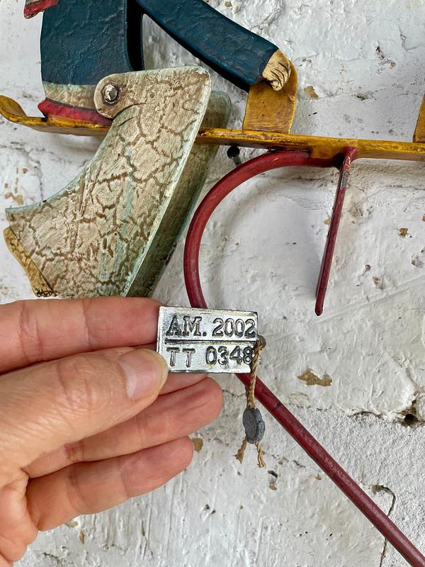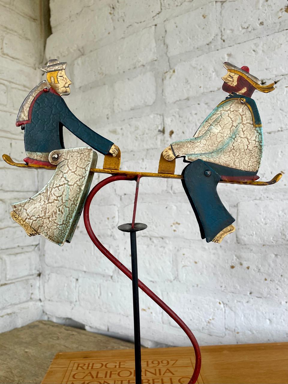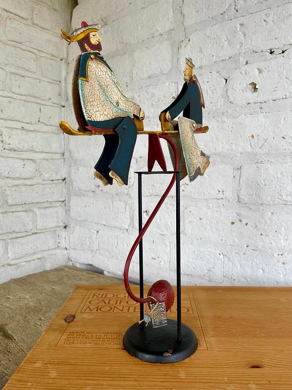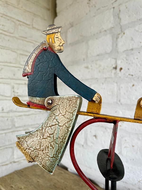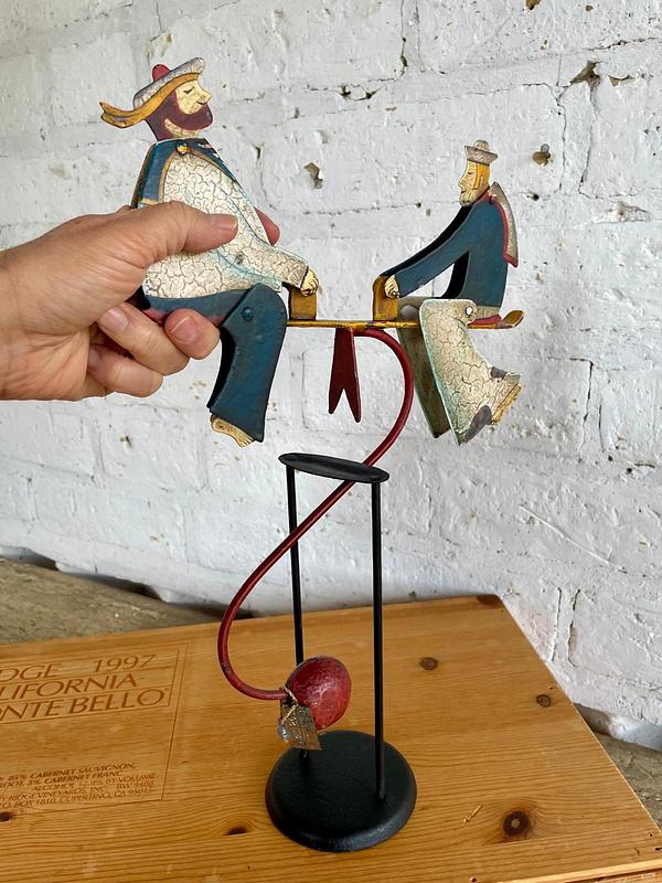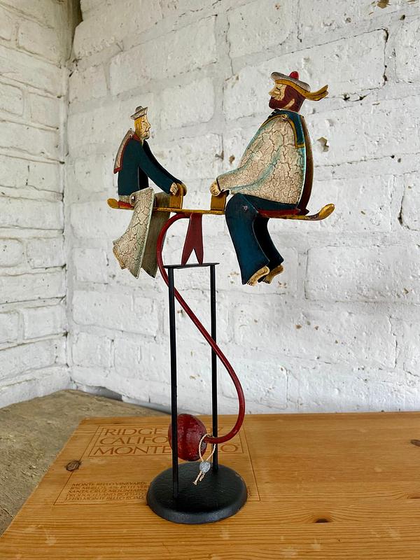 Figura balancín con péndulo, elaborada en Indonesia recreando un antiguo juguete. Al balancearse sobre el eje las figuras de los marineros mueven la cabeza y los pies. Elaborados en lámina metálica guresa repujada y decorado con pintura dando apariencia envejecida. Se encuentra en buen estado con desgastes en la pintura.