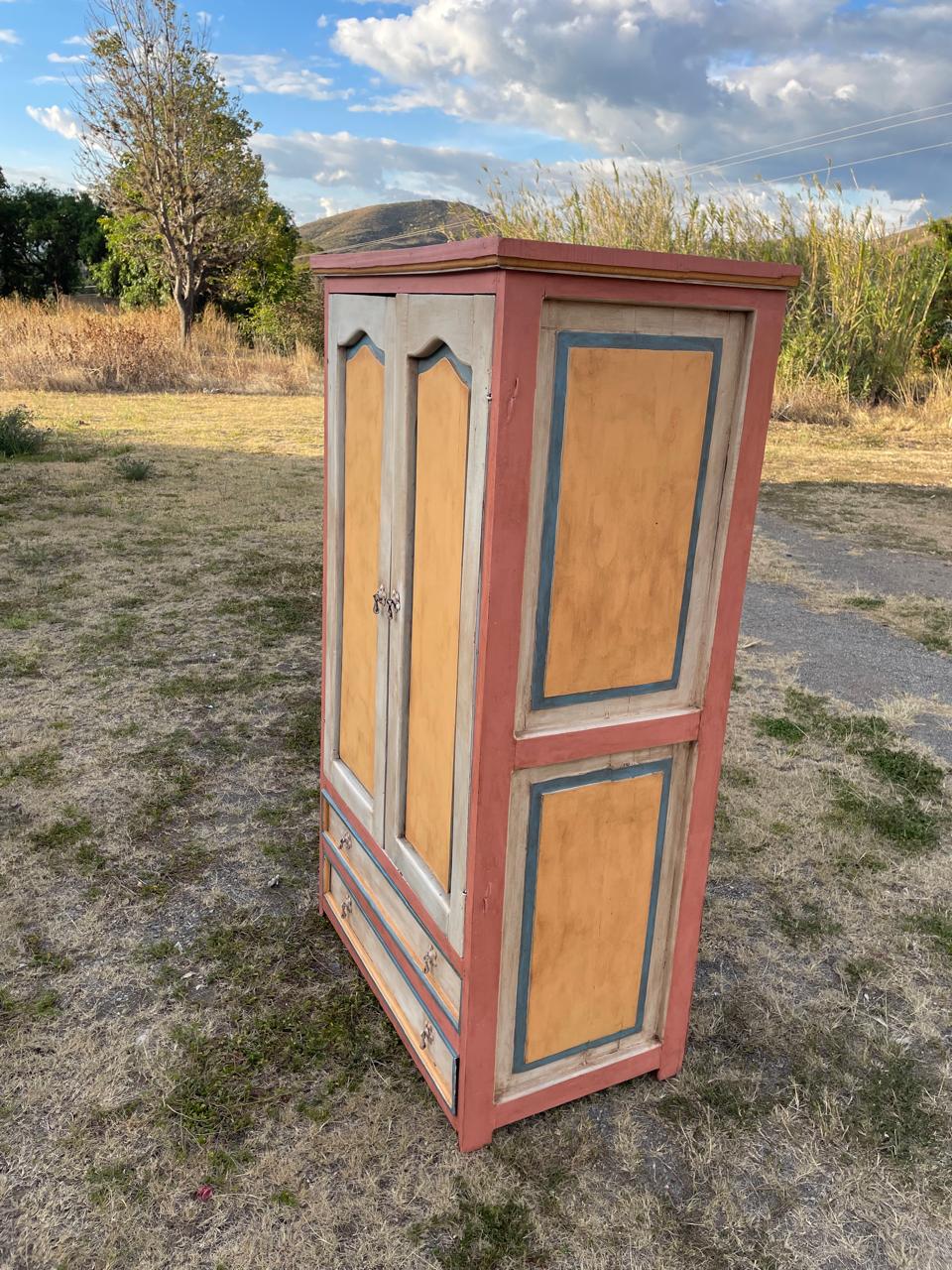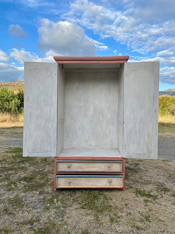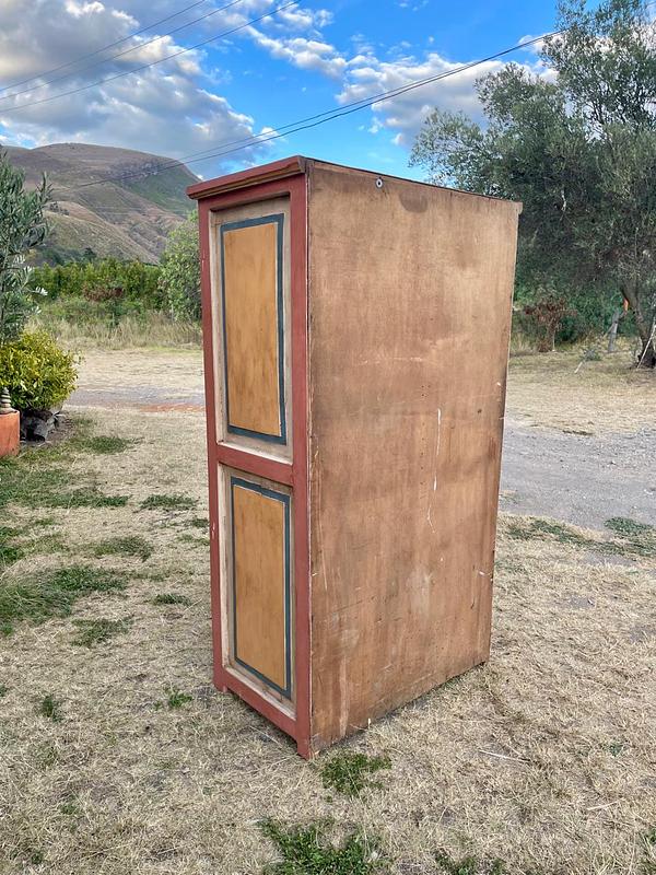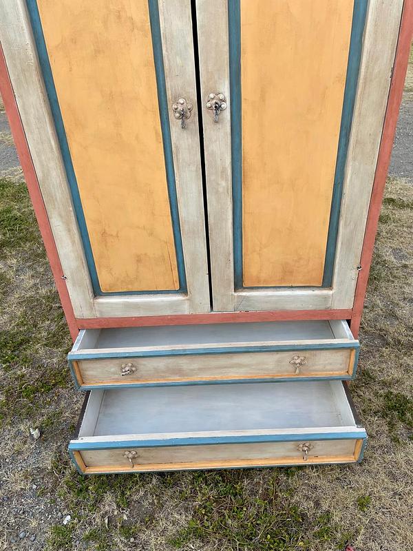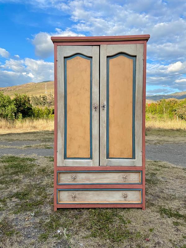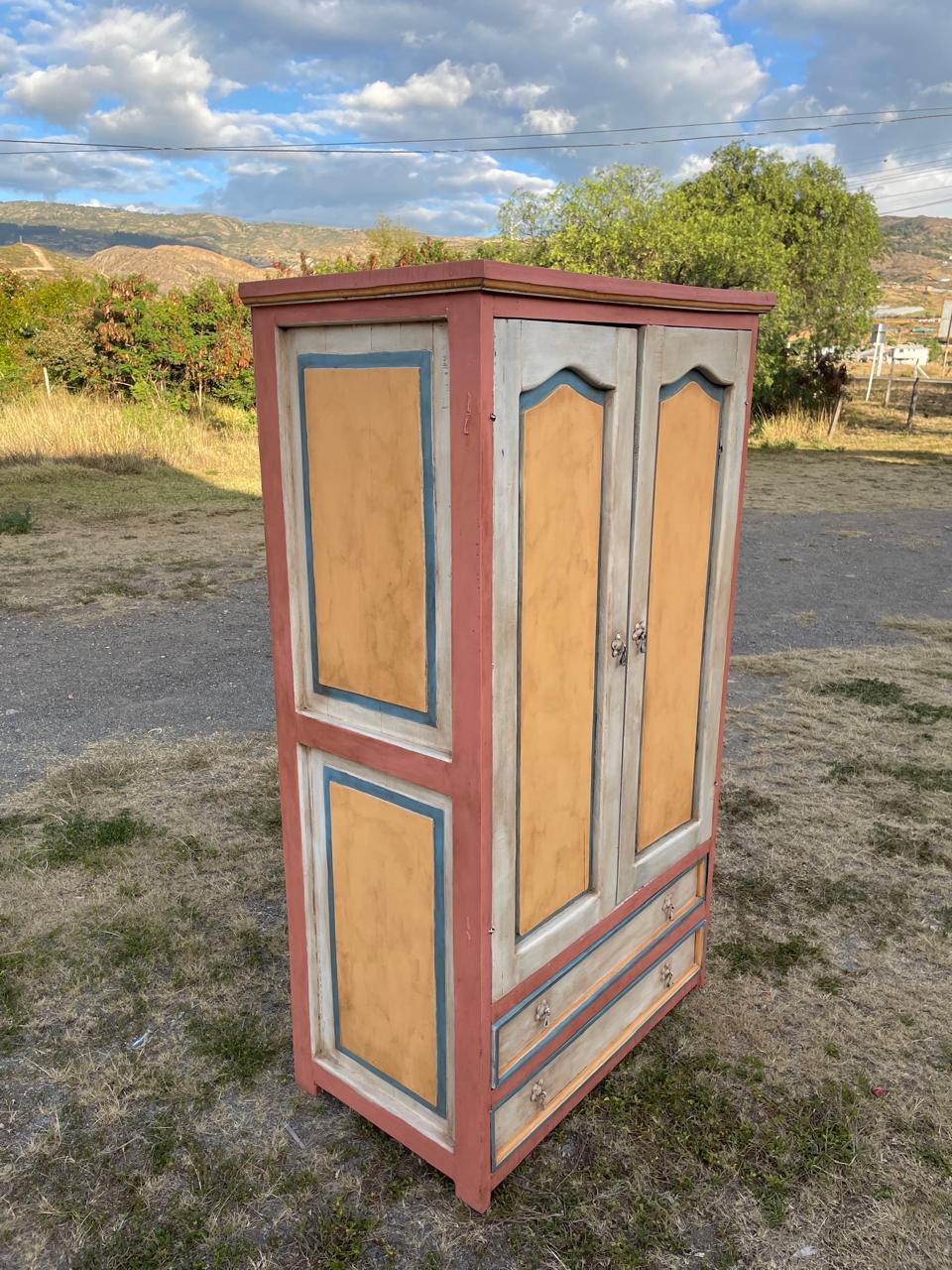 Antiguo ropero de madera de la primera mitad del S XX, decorado con pintura desgastada. En la parte superior tiene una barra para colgar los ganchos con la ropa y en la base tiene dos cajones. La madera se encuentra en buen estado libre de termitas y comegen.