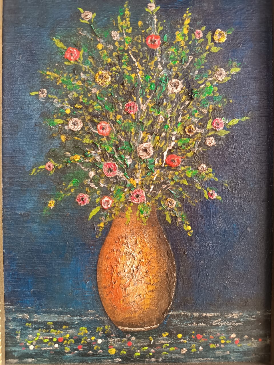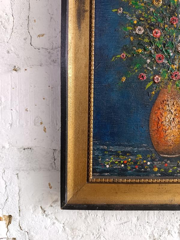 Pintura original al oleo sobre madera enmarcarda en moldura de resina. El marco presenta desgastes en la pintura.