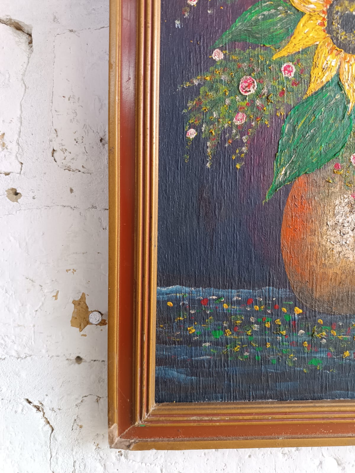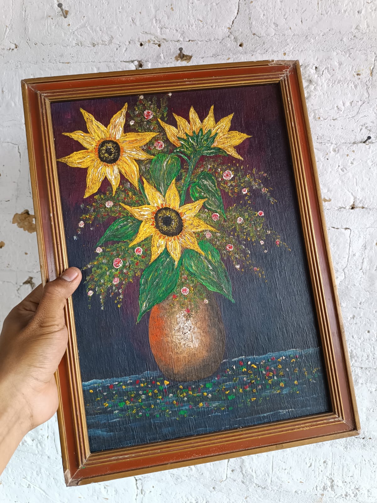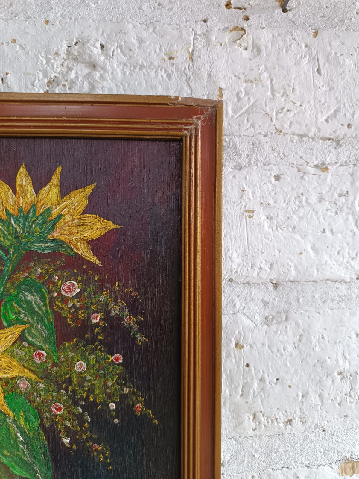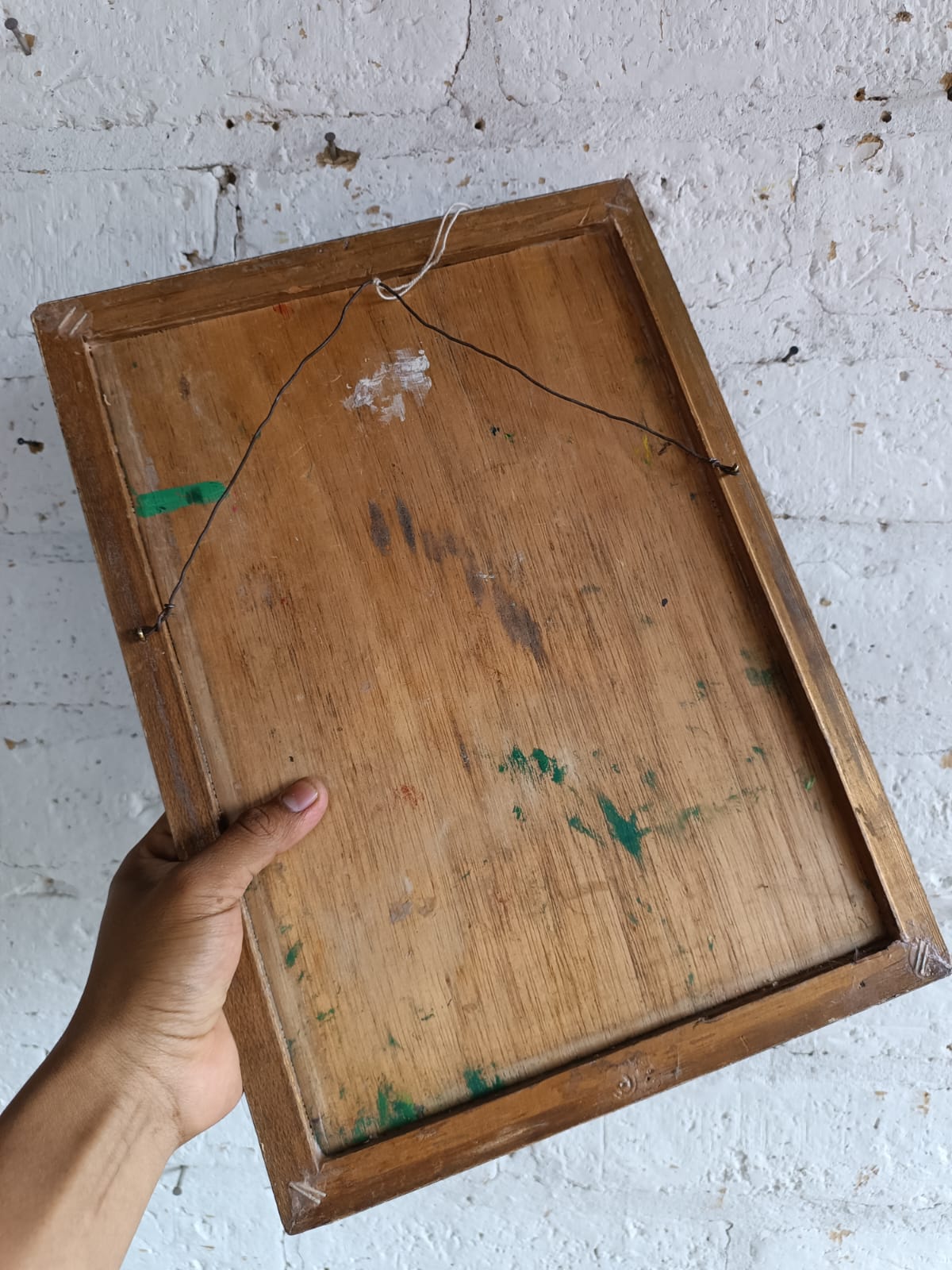 Pintura original al óleo sobre madera enmarcado en moldura de madera. El marco presenta desgastes en la pintura y algunas desportilladuras.