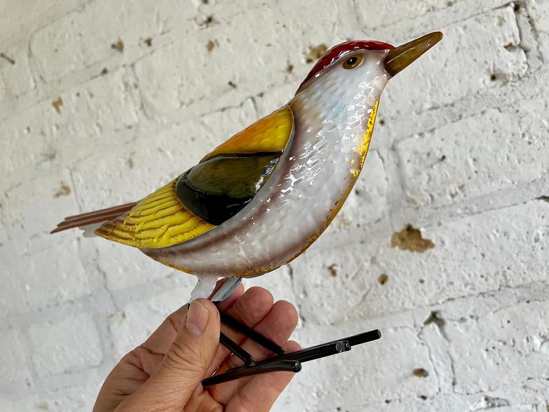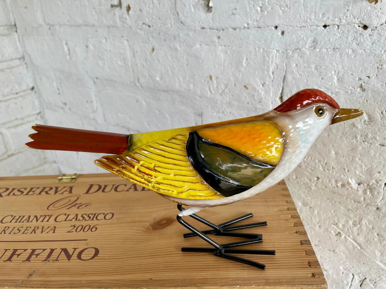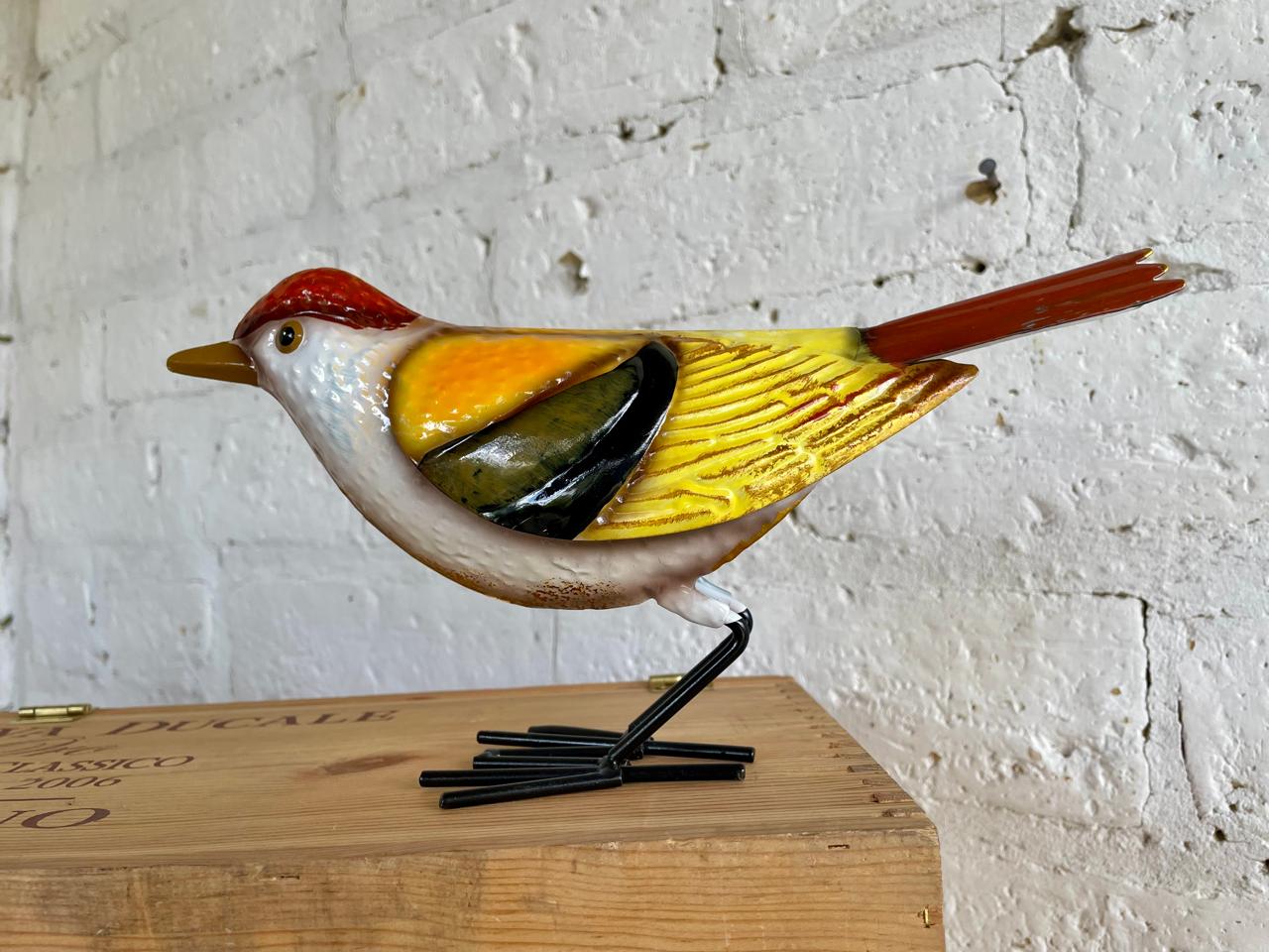 Figura de pájaro elaborada en lámina metálica con patas de alambre grueso decorado con pintura horneada. Sirve como decoración para patios