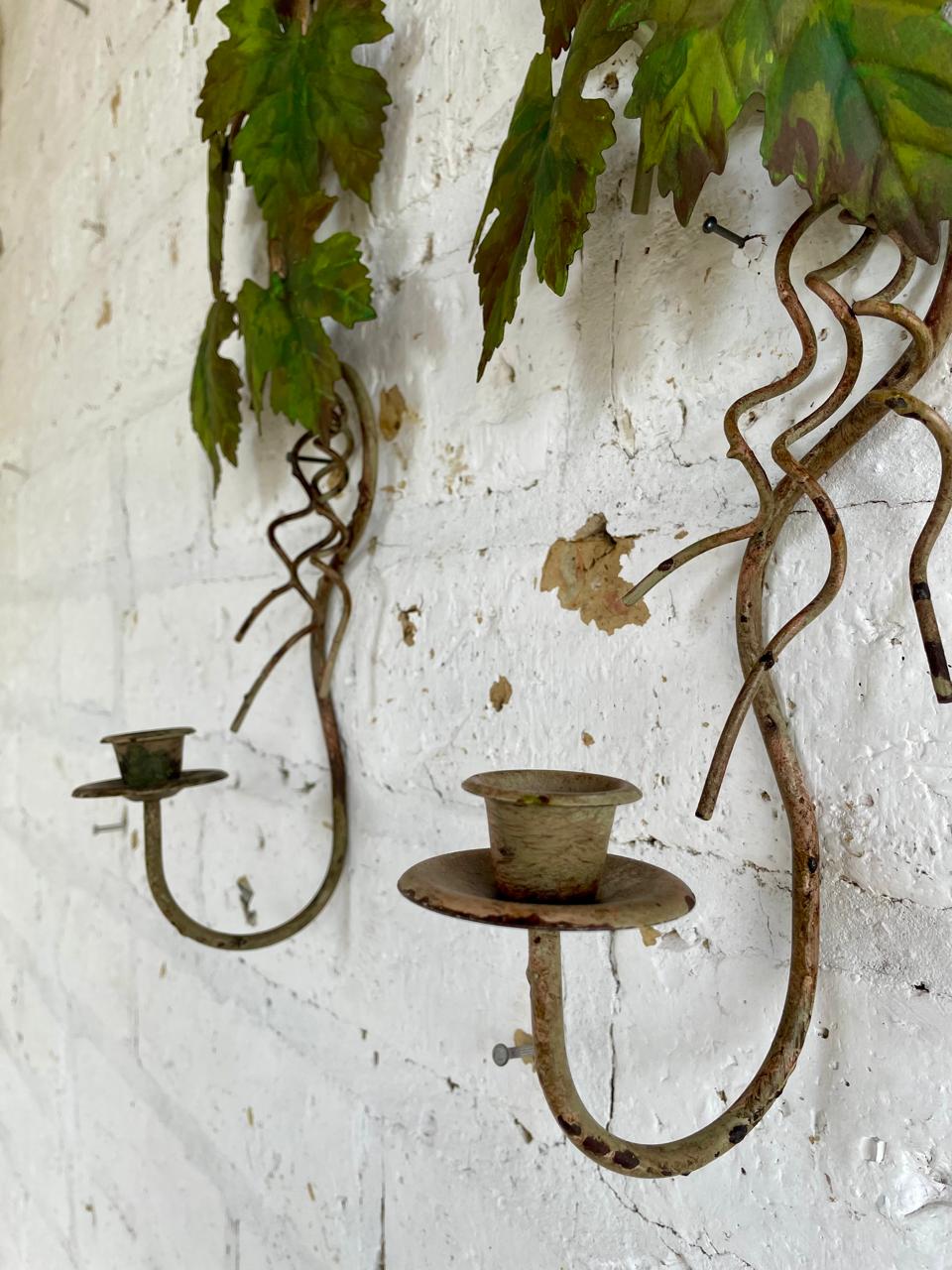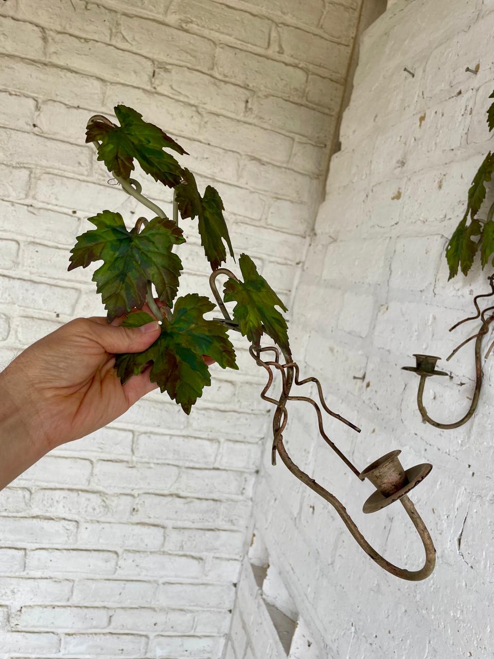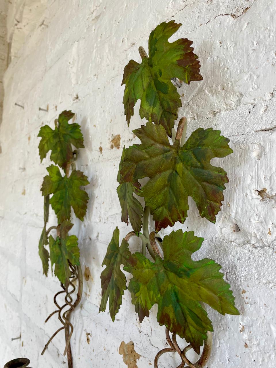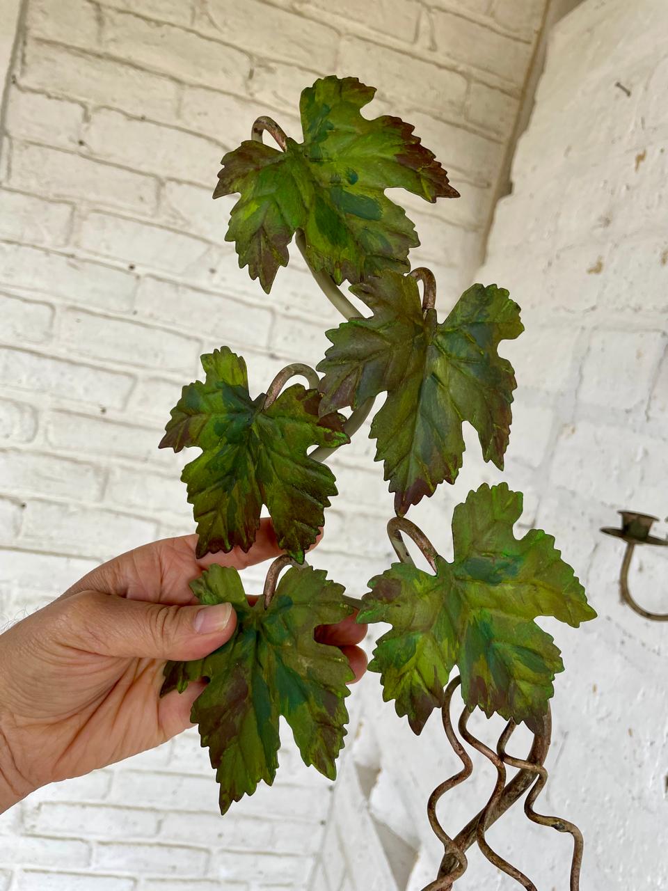 Pareja de candelabros artesanales elaborados en lámina metálica gruesa, las hojas de parra están soportadas en una base de varilla en hierro y están decoradas con pintura desgastada.