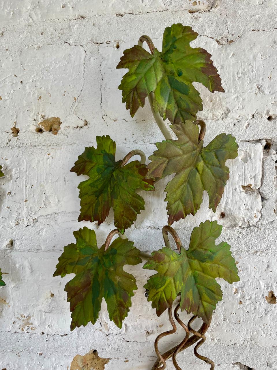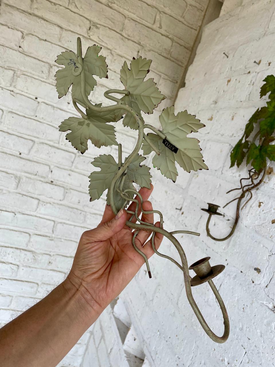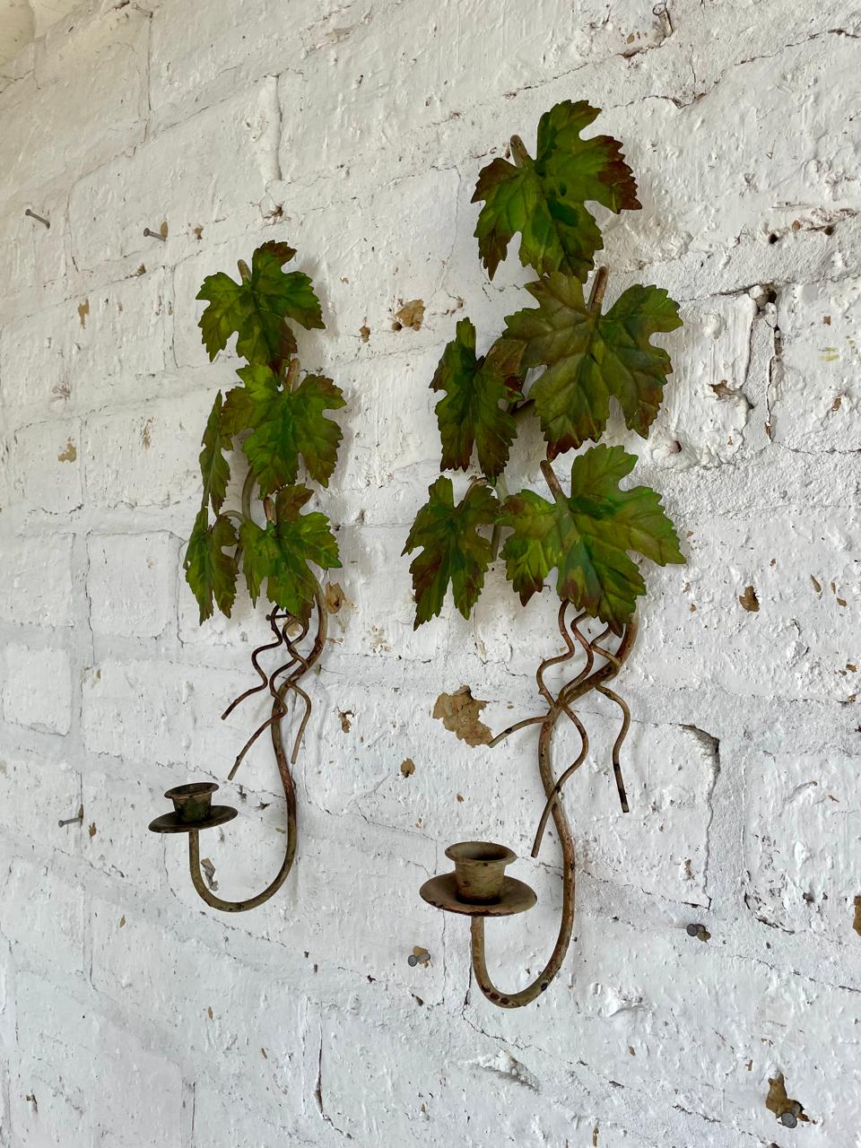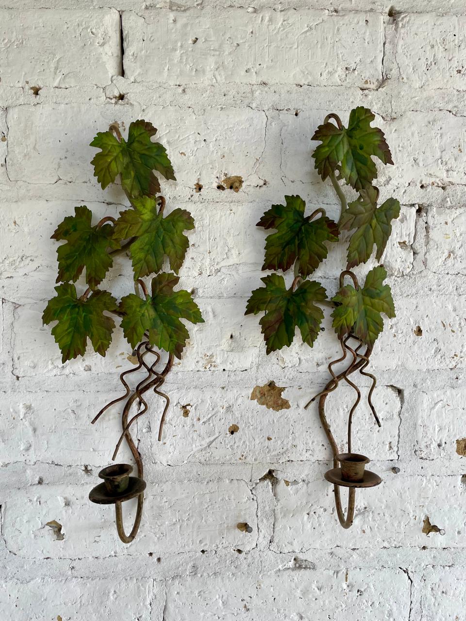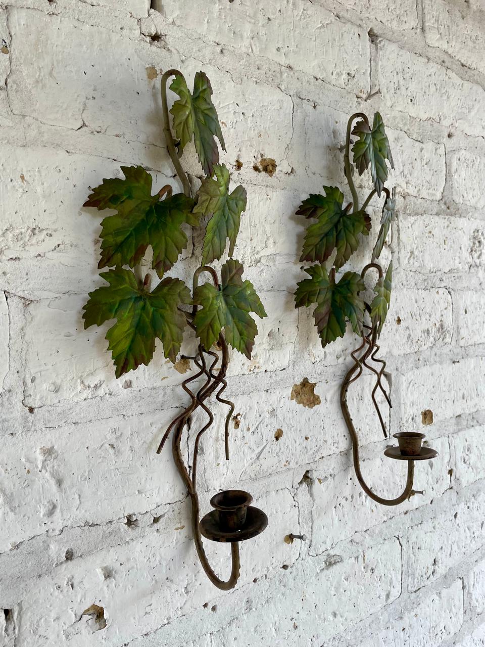 Pareja de candelabros artesanales elaborados en lámina metálica gruesa, las hojas de parra están soportadas en una base de varilla en hierro y están decoradas con pintura desgastada.