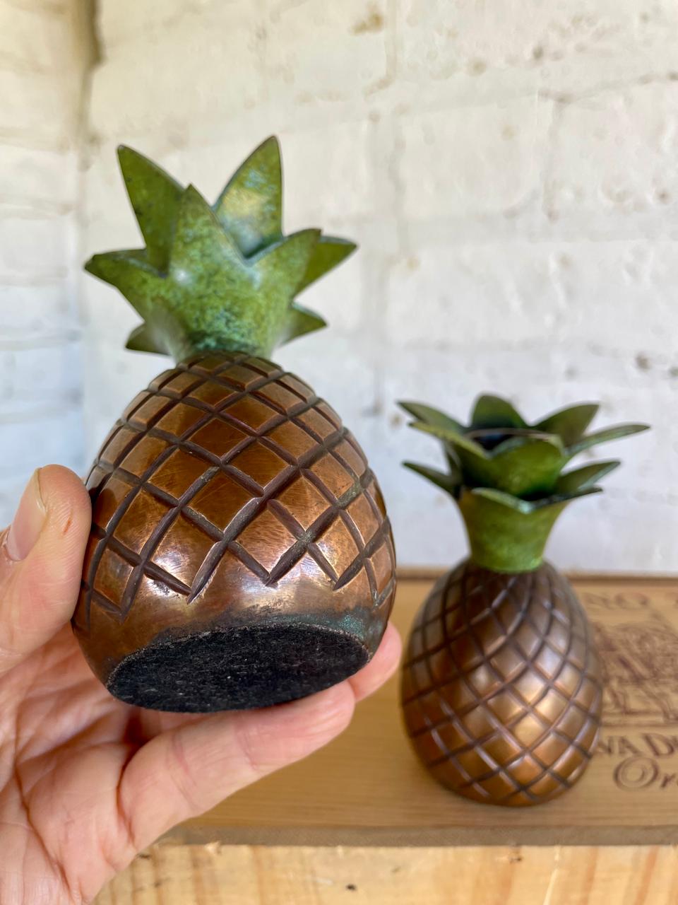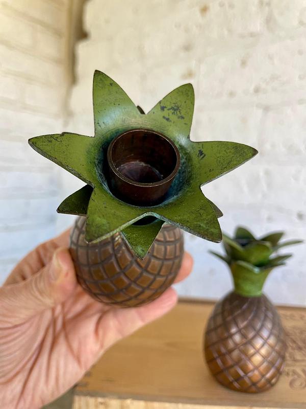 Pareja de candelabros en bronce elaborados en la india en la década de 1990 para la marca Estadounidense Tommy Bahama. En la parte superior tienen un orificio para velas convencionales. Se encuentran en buen estado