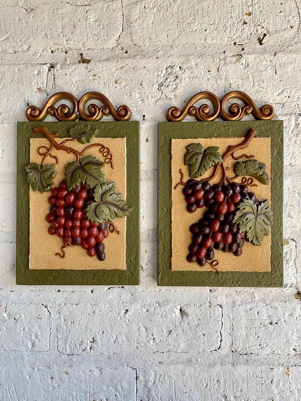 Pareja de cuadros con racimos de uvas en alto relieve fabricados en resina de alta resistencia en Estados Unidos en los años ochenta. Se encuentran en buen estado.