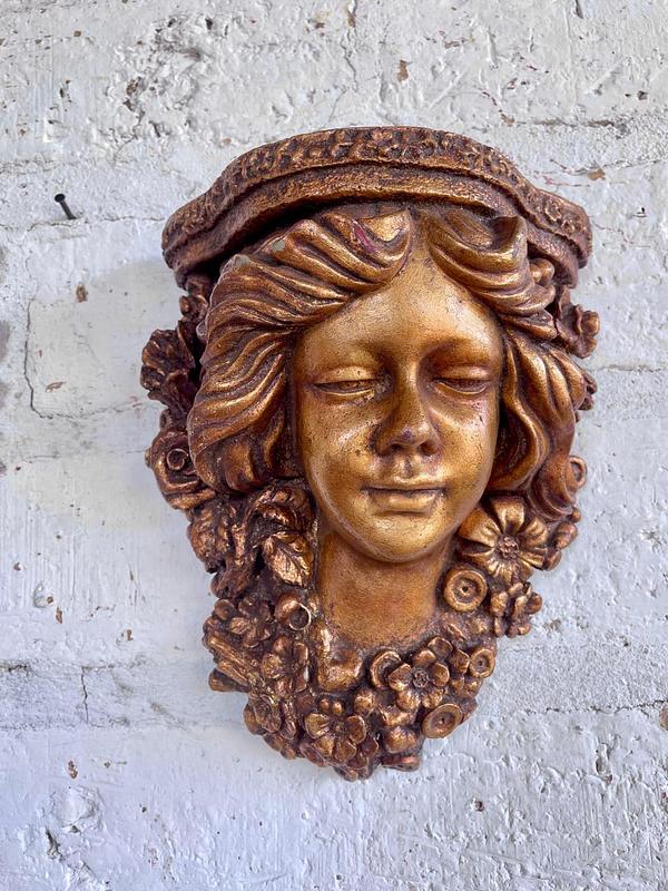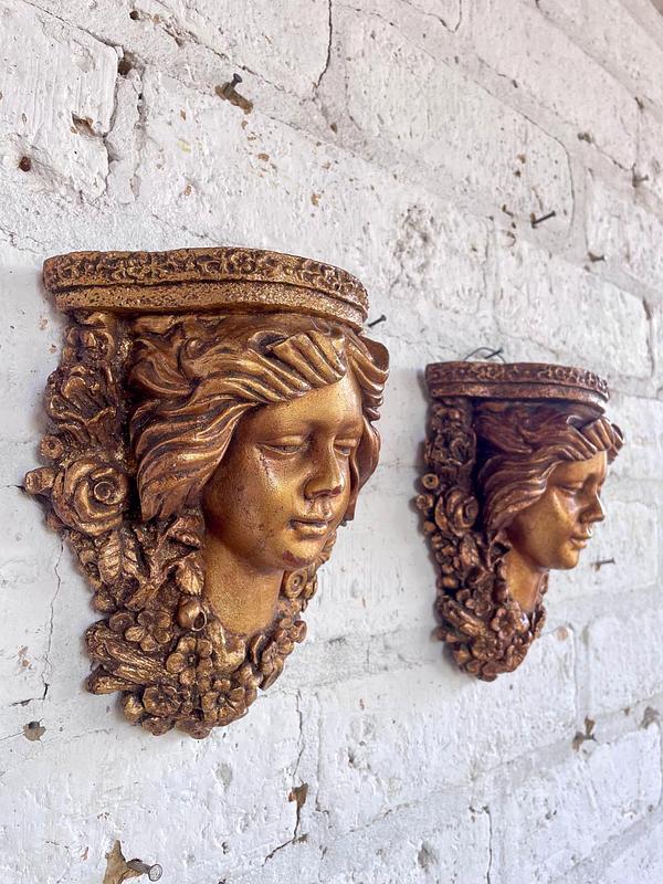 Pareja de apliques de pared elaborados en Italia en los años sesenta en resina de alta resistencia con apariencia de madera tallada y decorados en dorado. Se encuentran en buen estado.