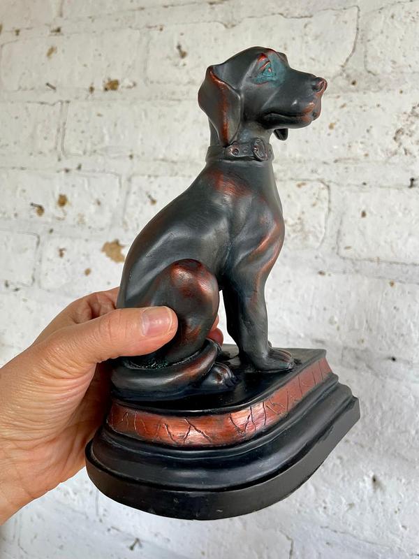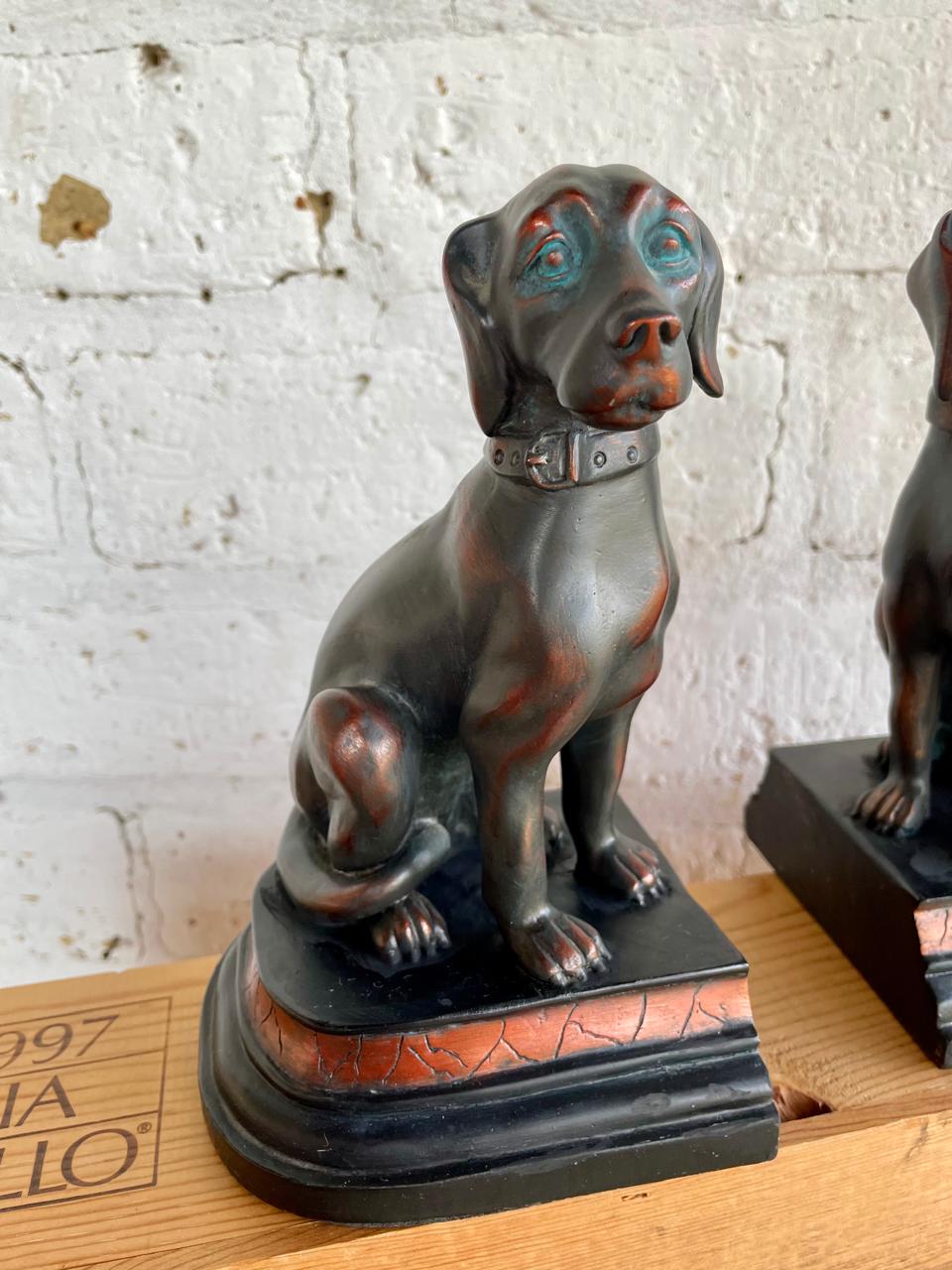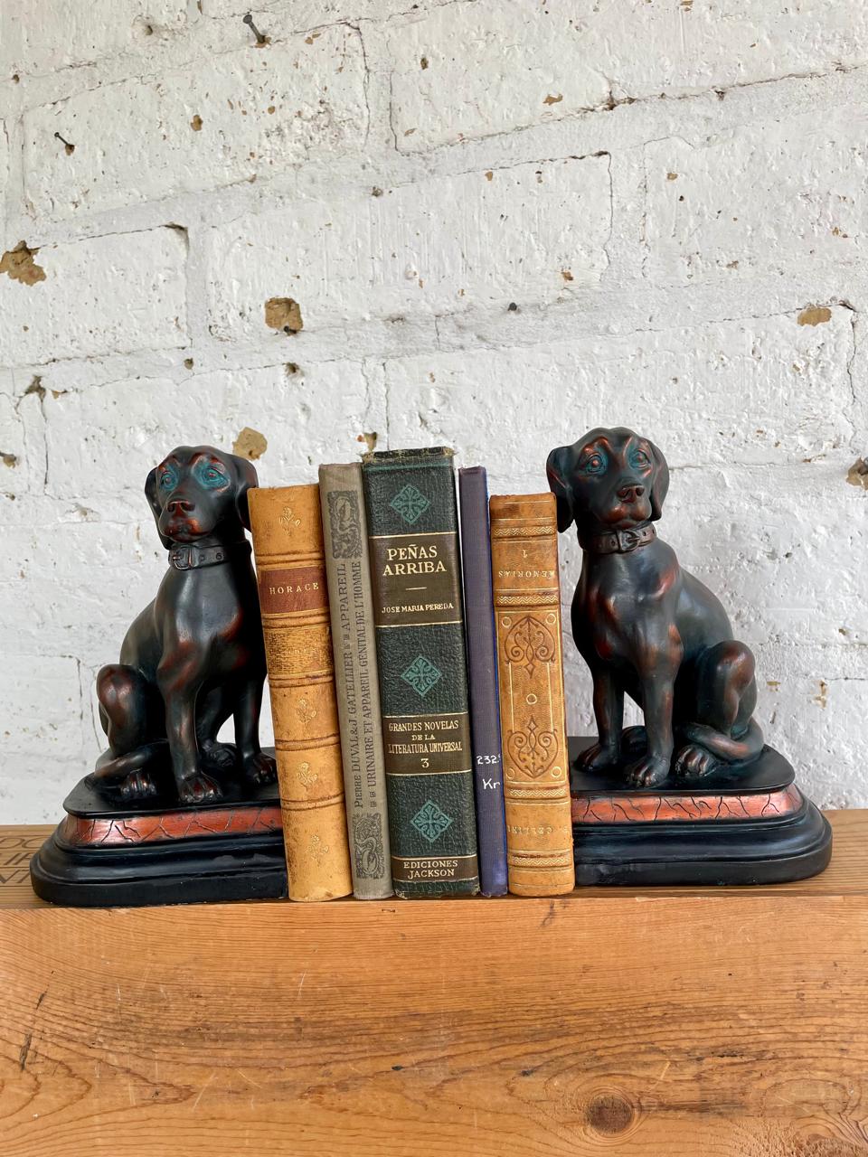 Dos perros para trancar libros, fabricados en resina de alta calidad con apariencia de bronce. Se encuentran en buen estado.