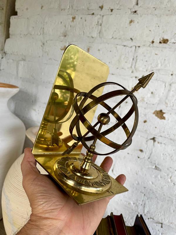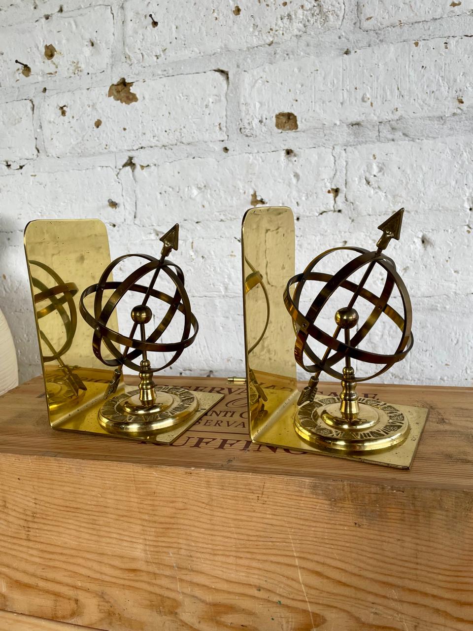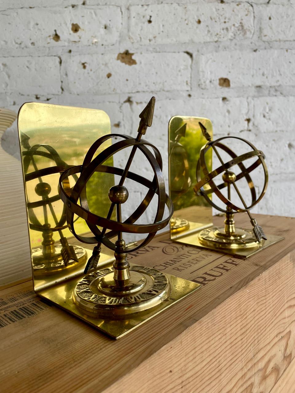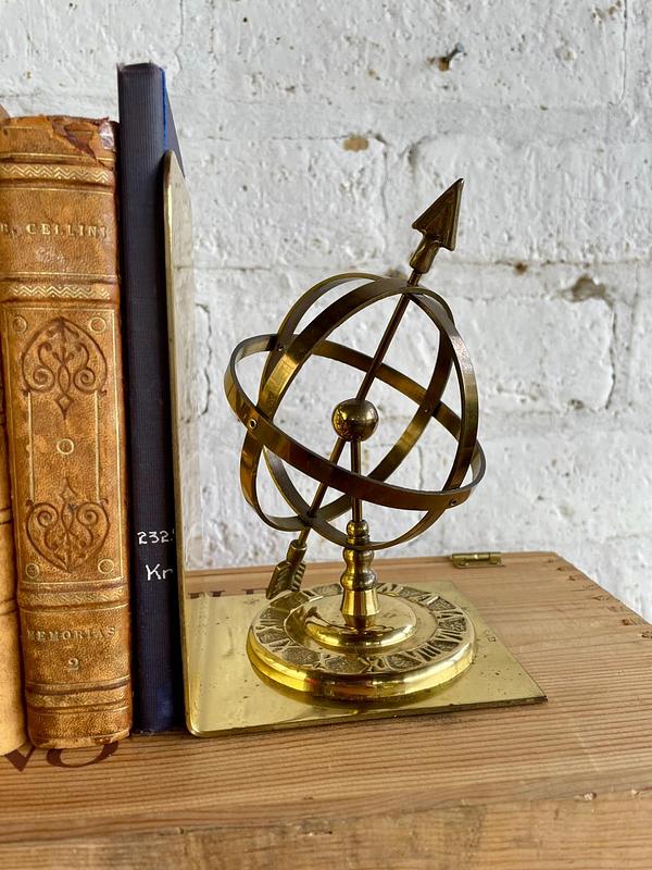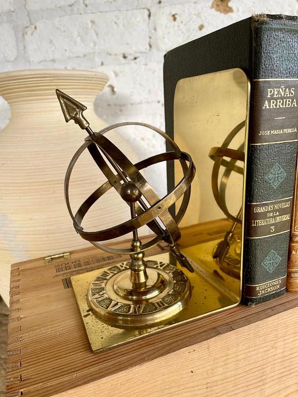 Pareja de tranca libros en bronce, decorados con la figura de una esfera armilar elaborados en Tawian en los años setenta. Se encuentran en buen estado.