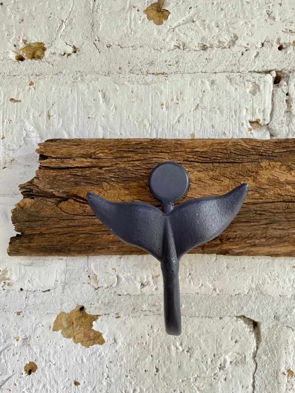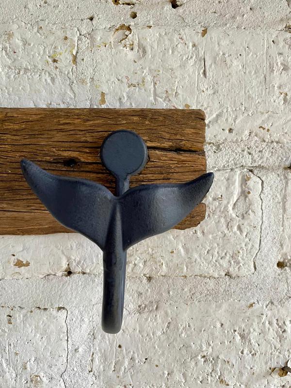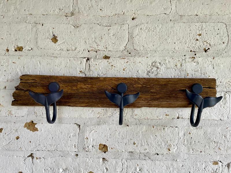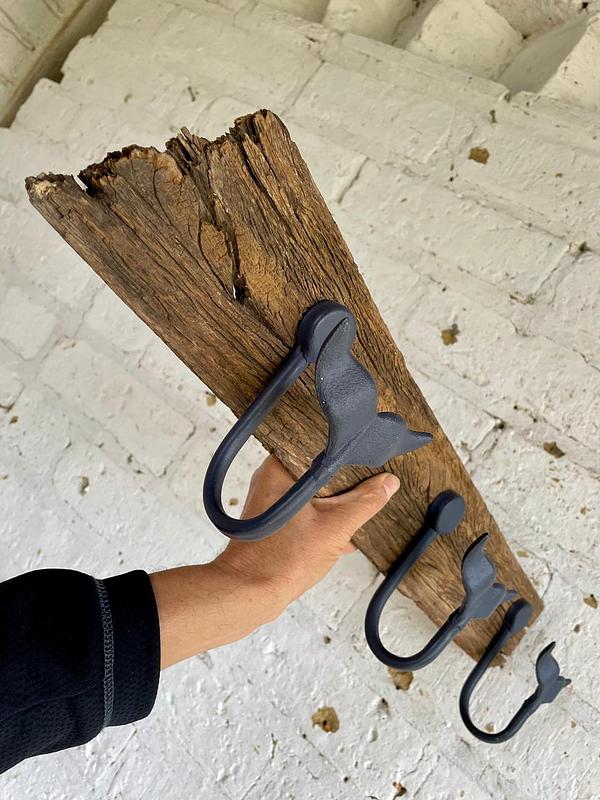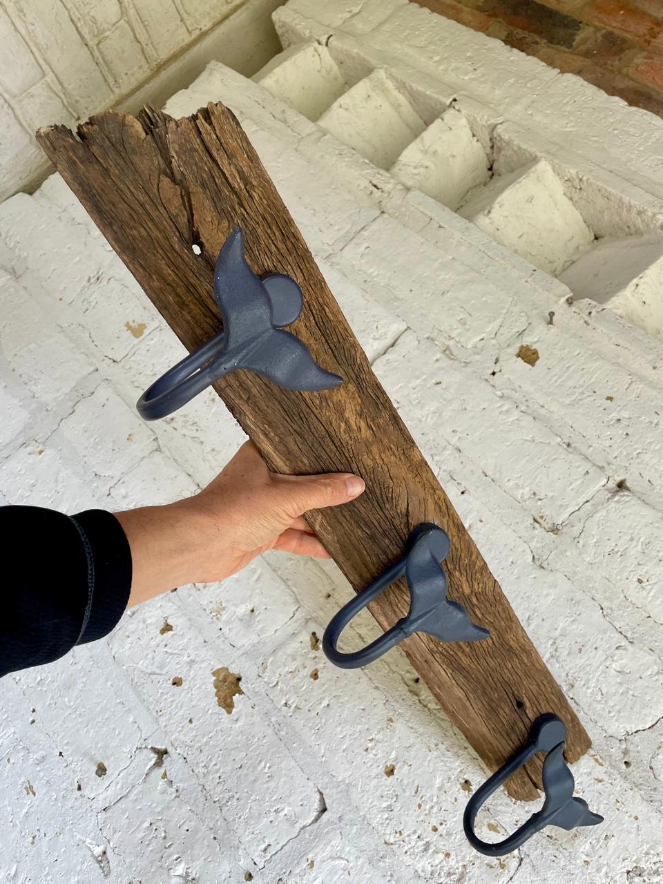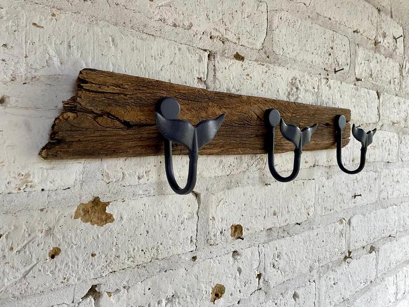 Perchero de madera rústica y 3 ganchos metálicos con forma de cola de ballena.