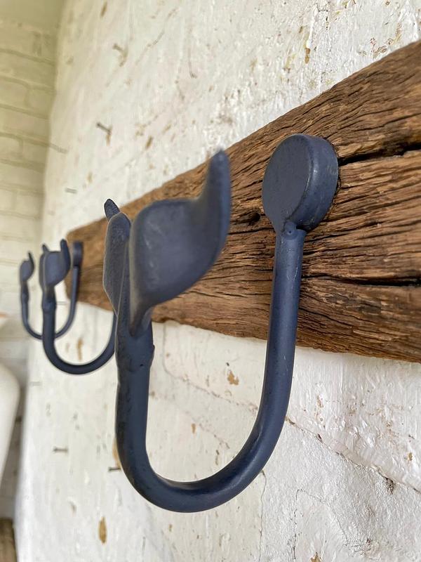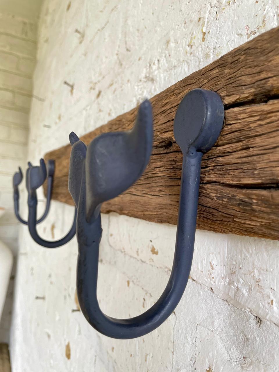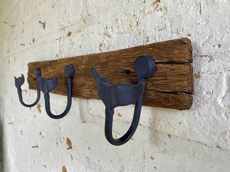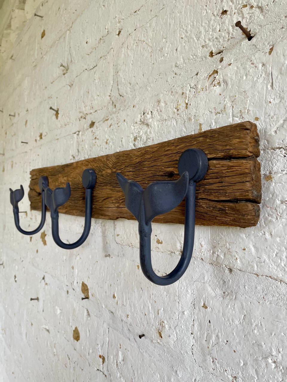Perchero de madera rústica y 3 ganchos metálicos con forma de cola de ballena.