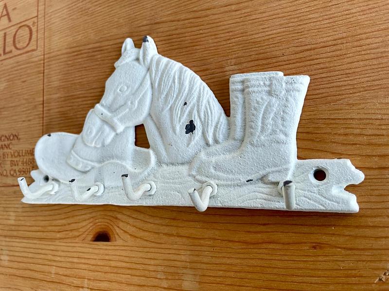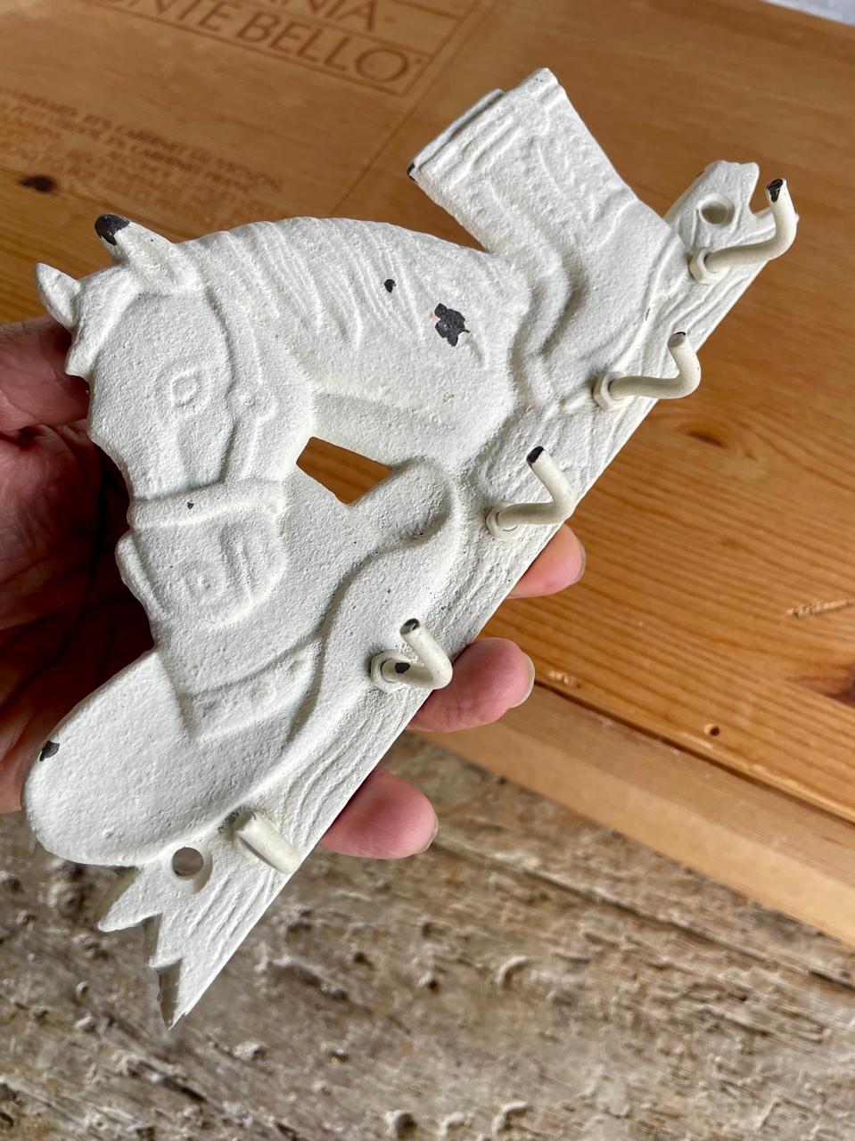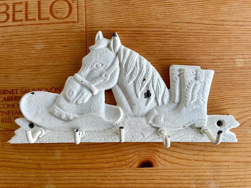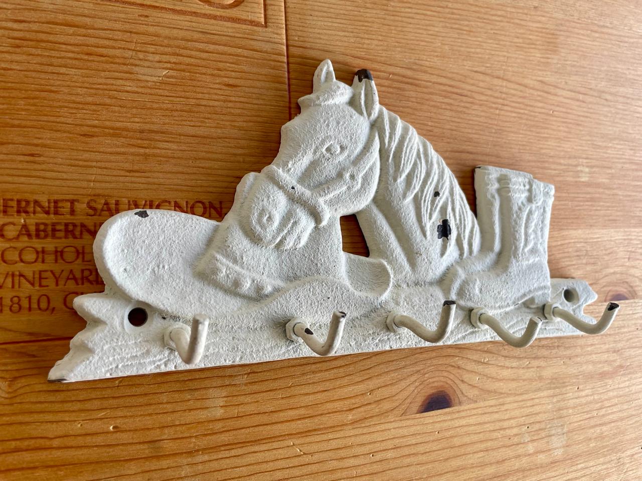Perchero de 5 ganchos decorado con la cabeza de un caballo en hierro fundido.