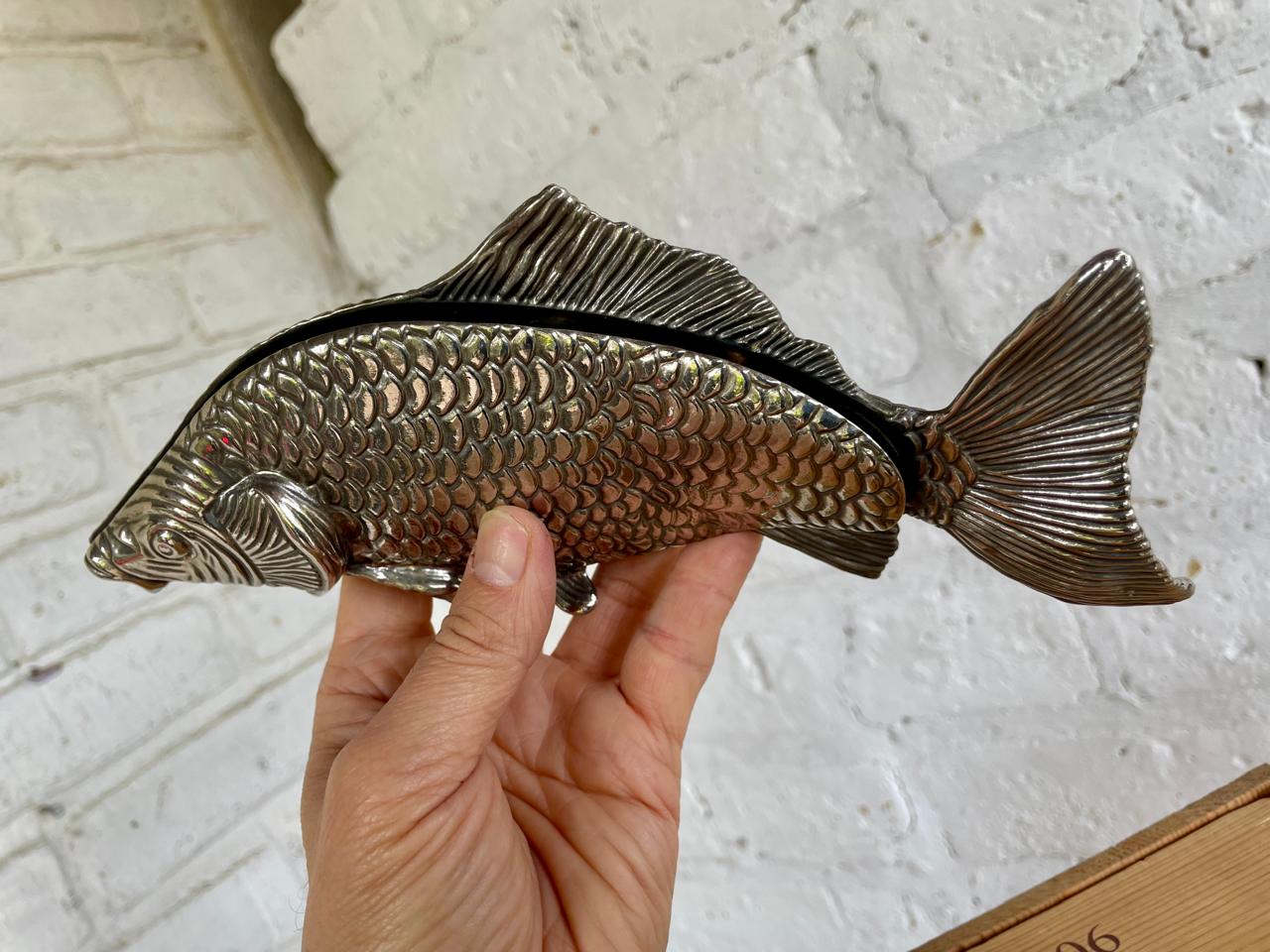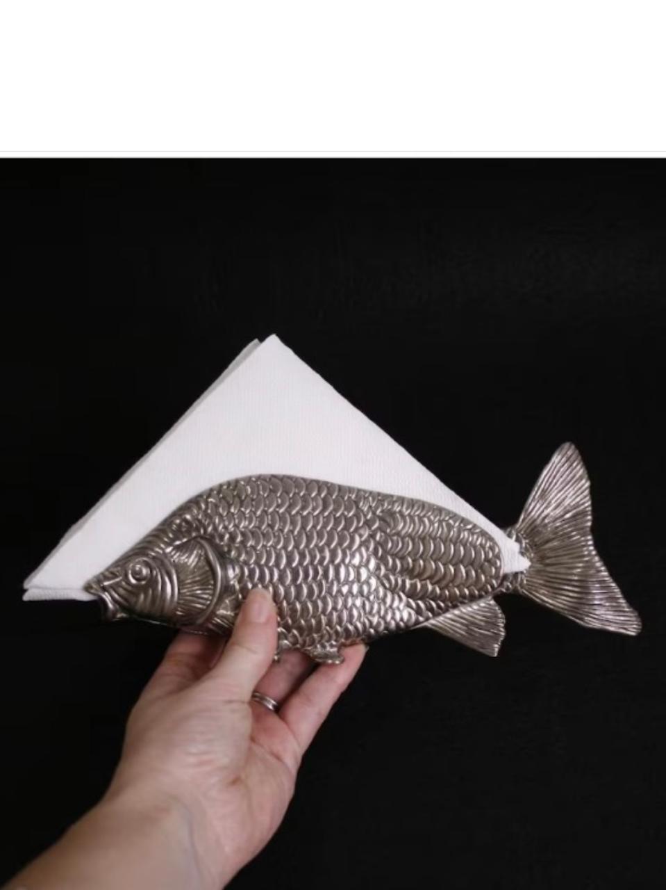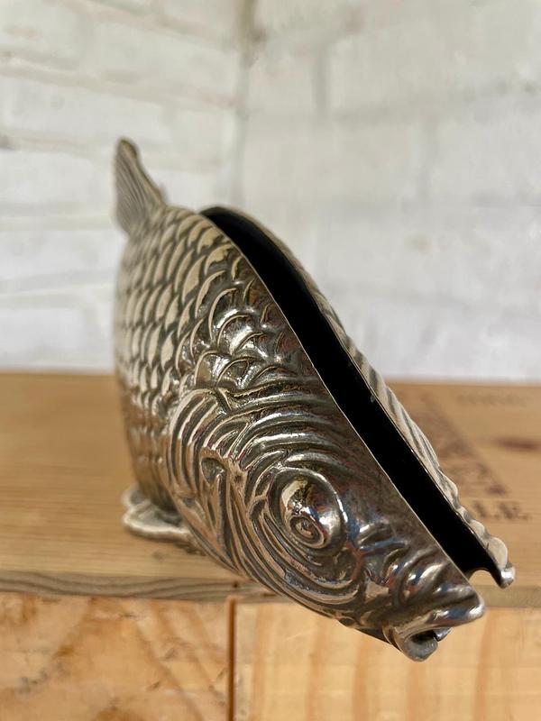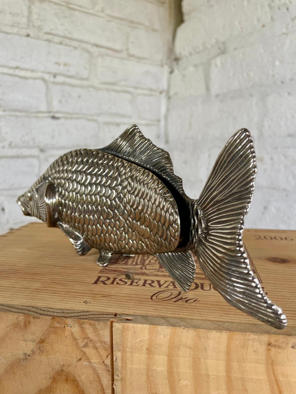 Servilletero metálico plateado con forma de pez carpa, modelo Depositato elaborado en Italia a mediados del S XX. Se encuentra en buen estado.