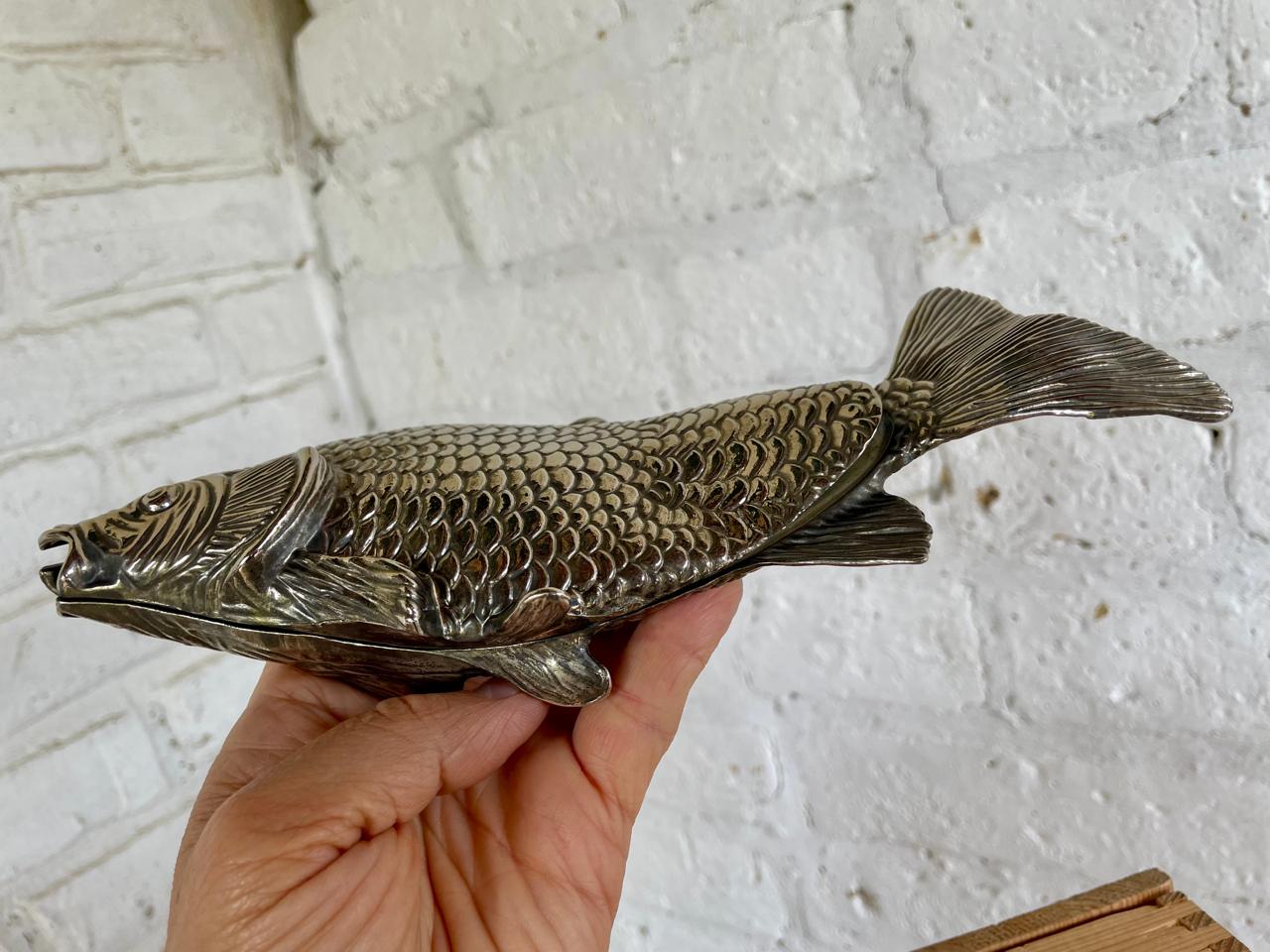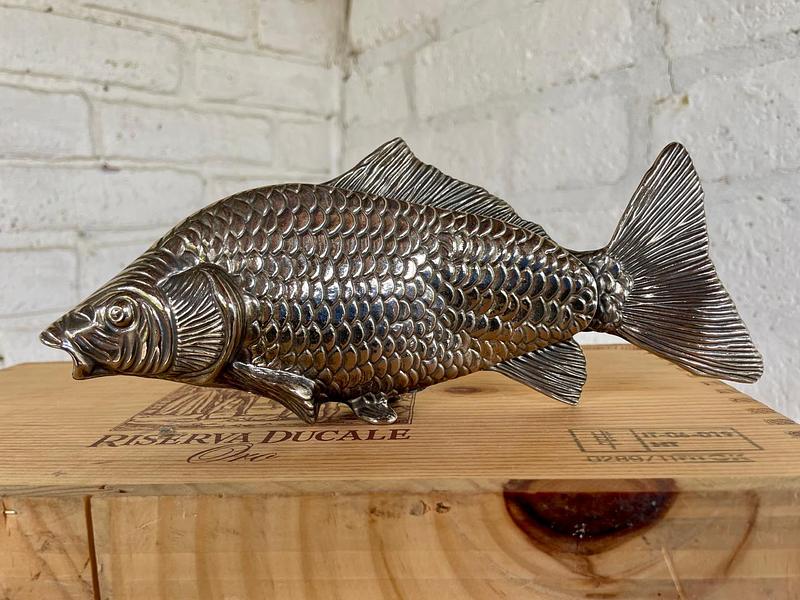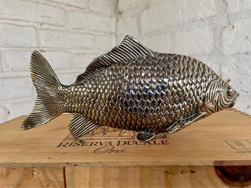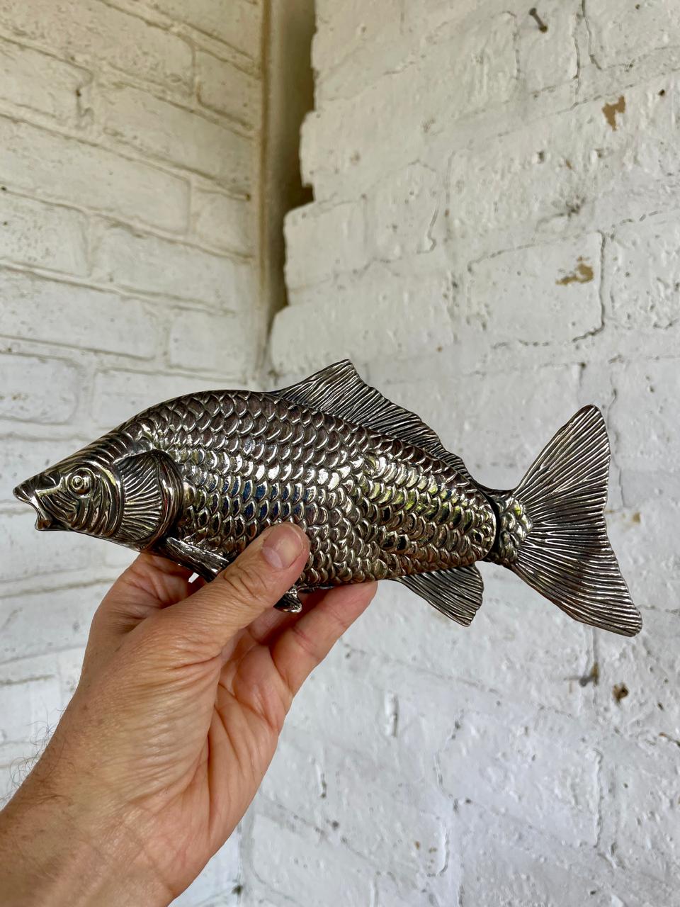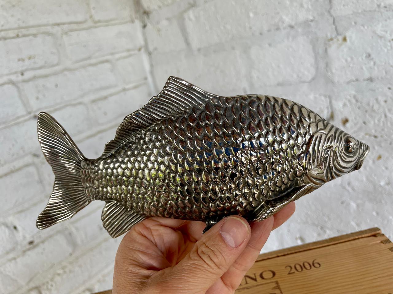Servilletero metálico plateado con forma de pez carpa, modelo Depositato elaborado en Italia a mediados del S XX. Se encuentra en buen estado.